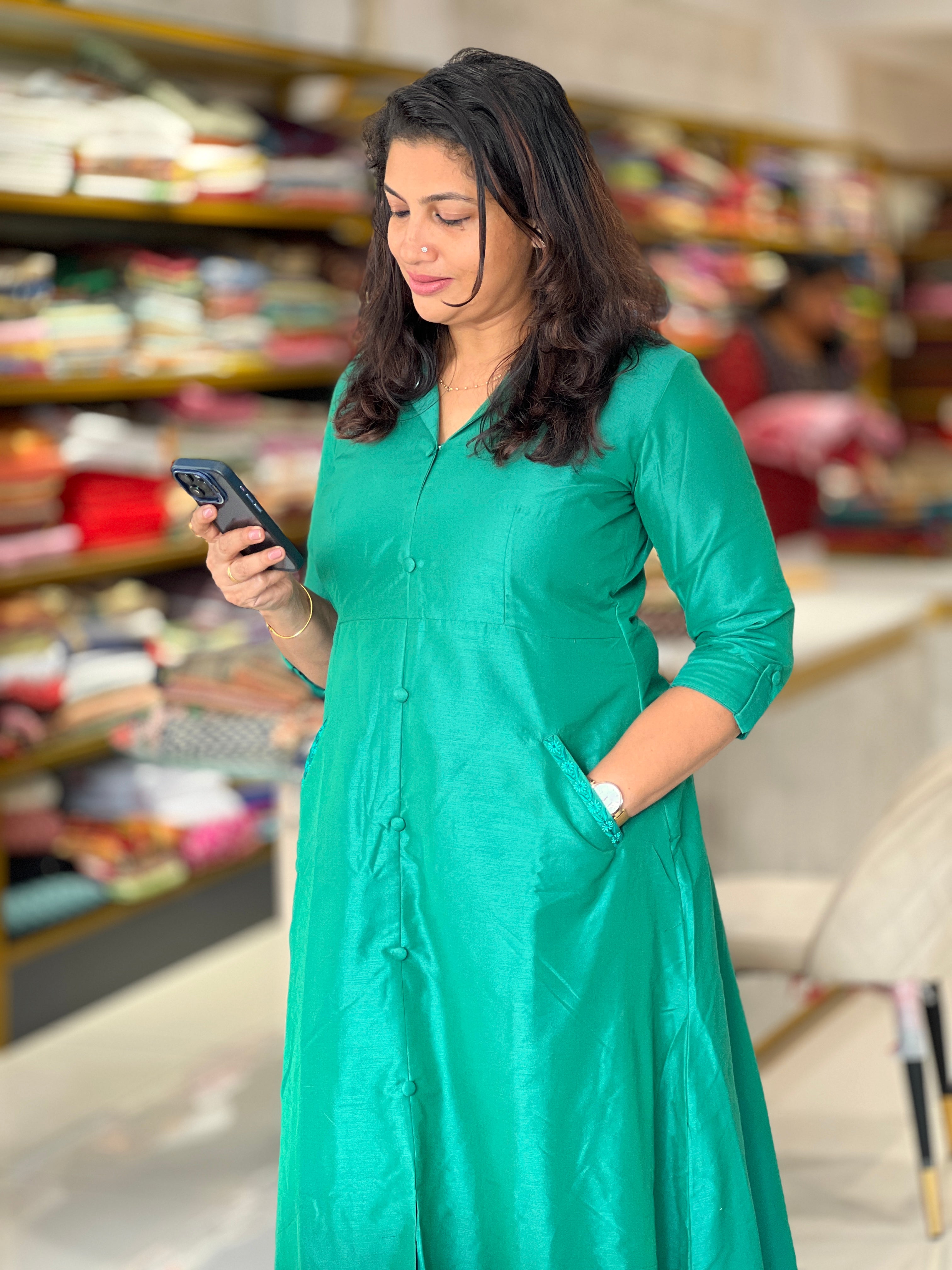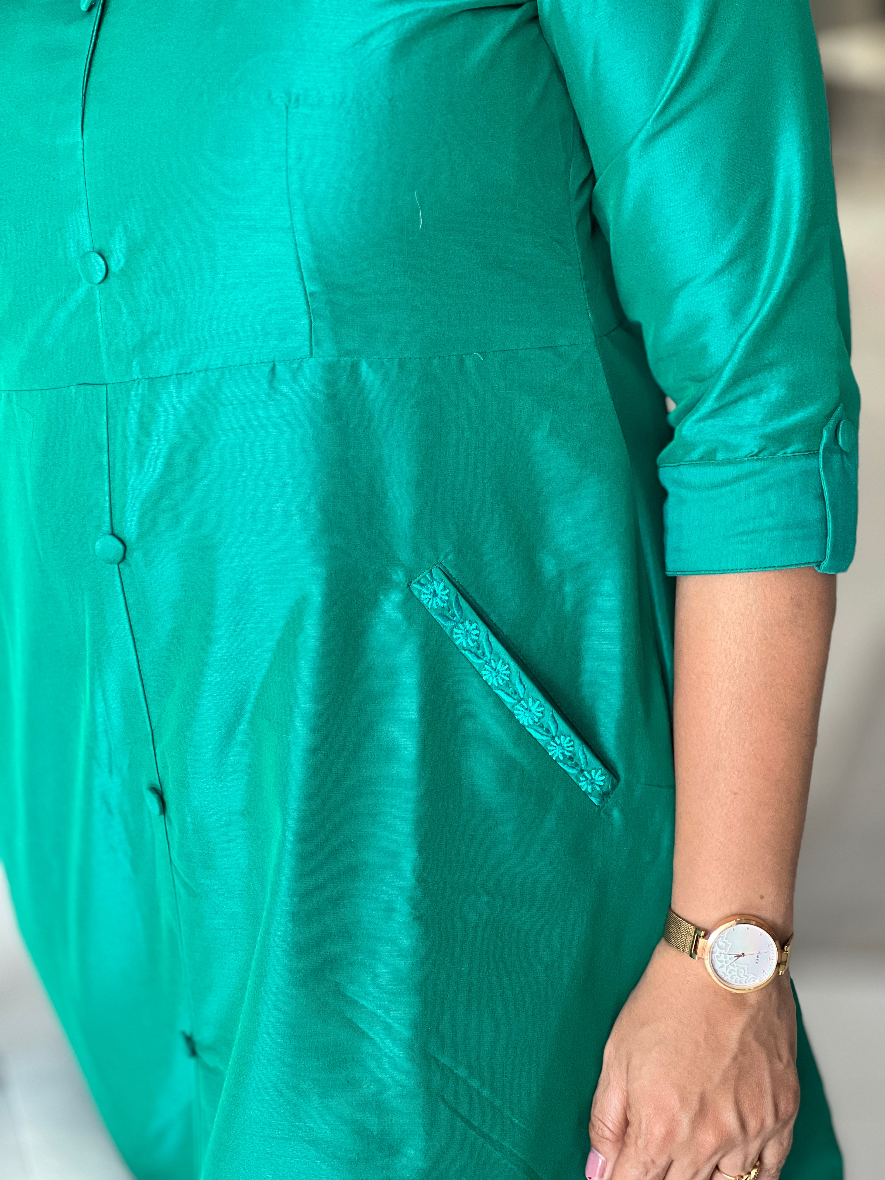 - Style- Two Side Pocket With Detailing Embroidery, A-Line Pattern, Cloth Button