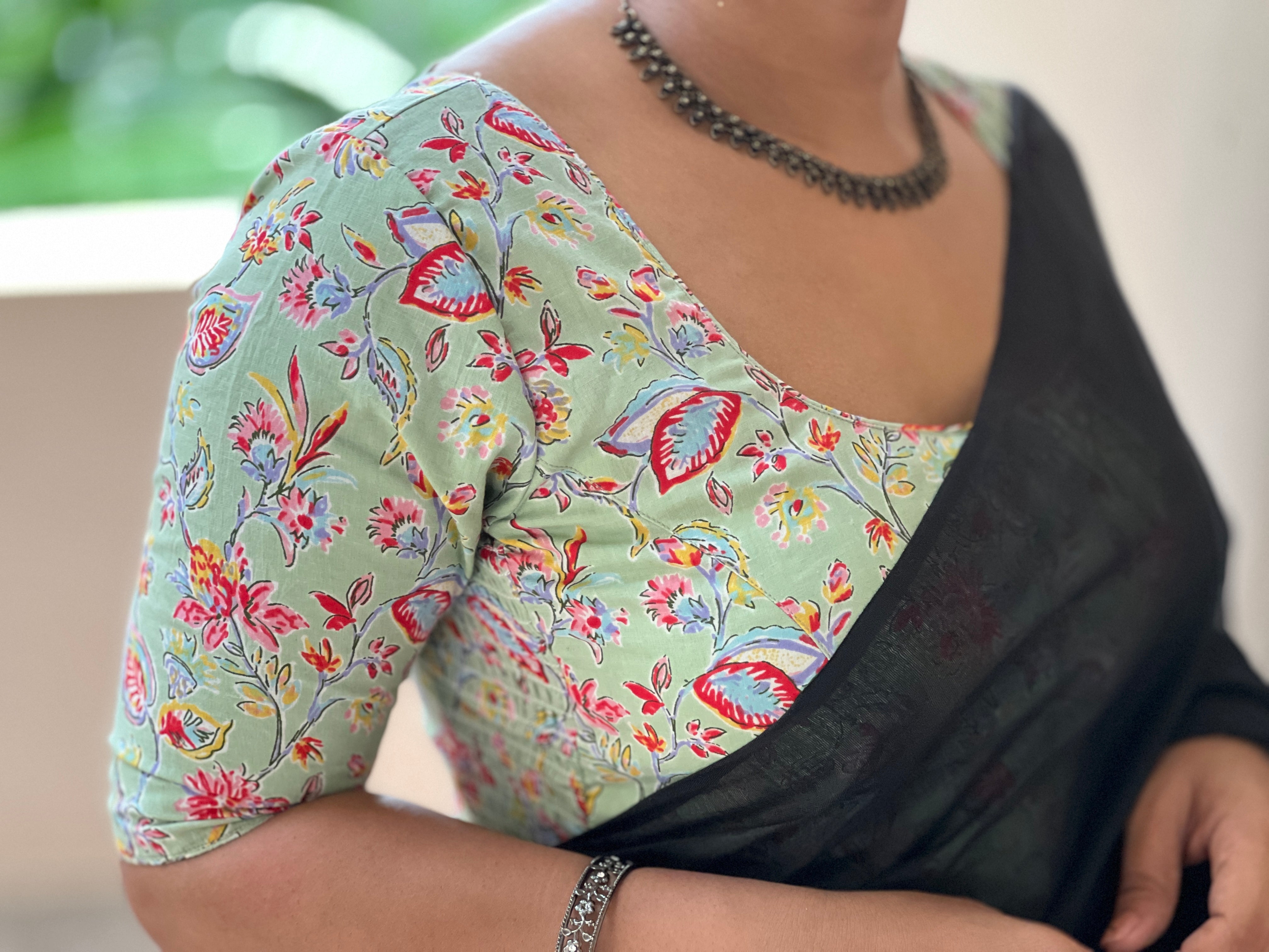 - Style: Adjustable Blouse, Smoked Side Panel, Printed Pattern, Piping Finished Edges, Front Round Neck & Back Deep U Neck Detailing, Princess Cut, Padded, Cotton Lining.