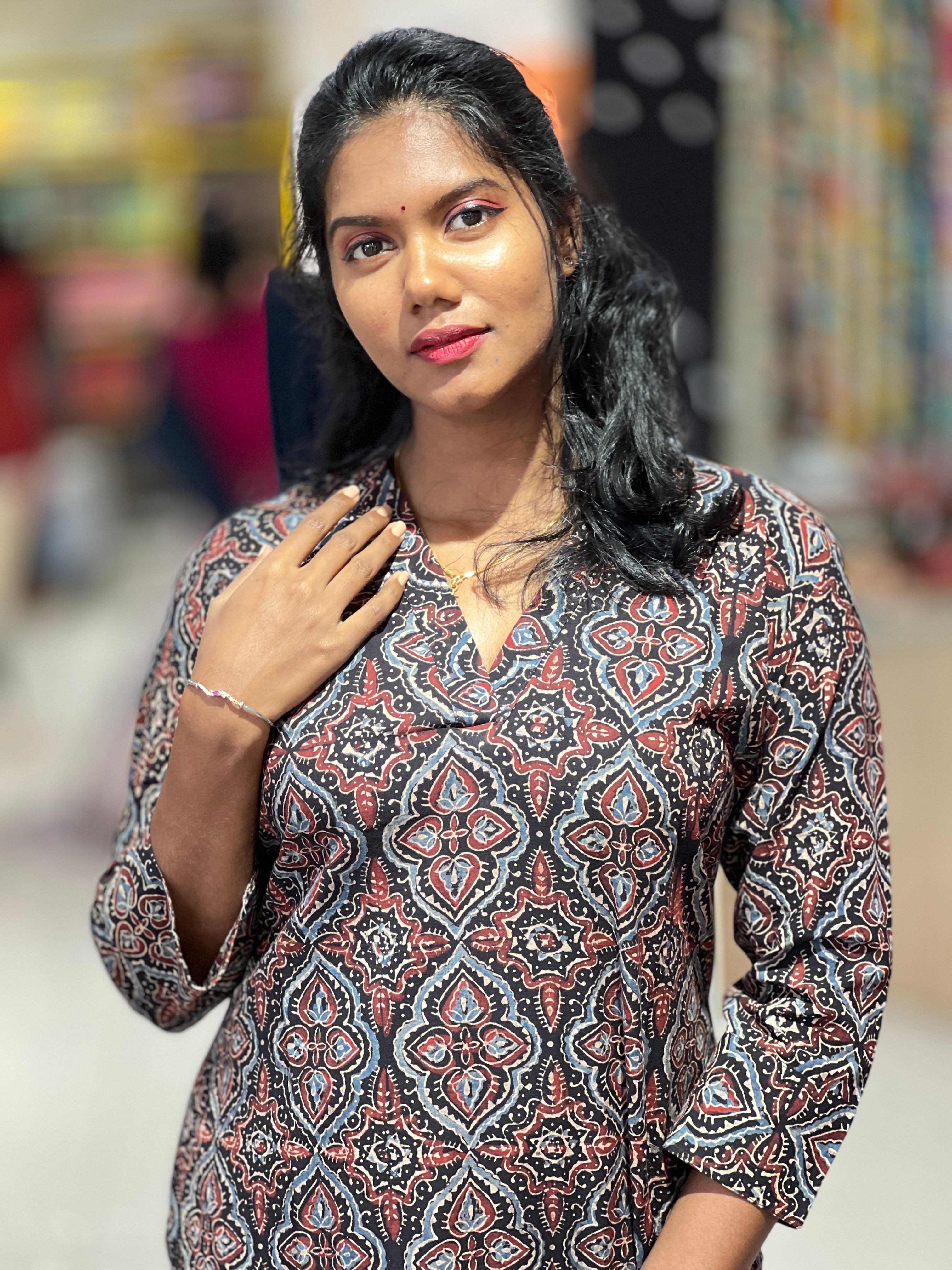- Style: Ajrak Inspired Print, Side Slit Pattern