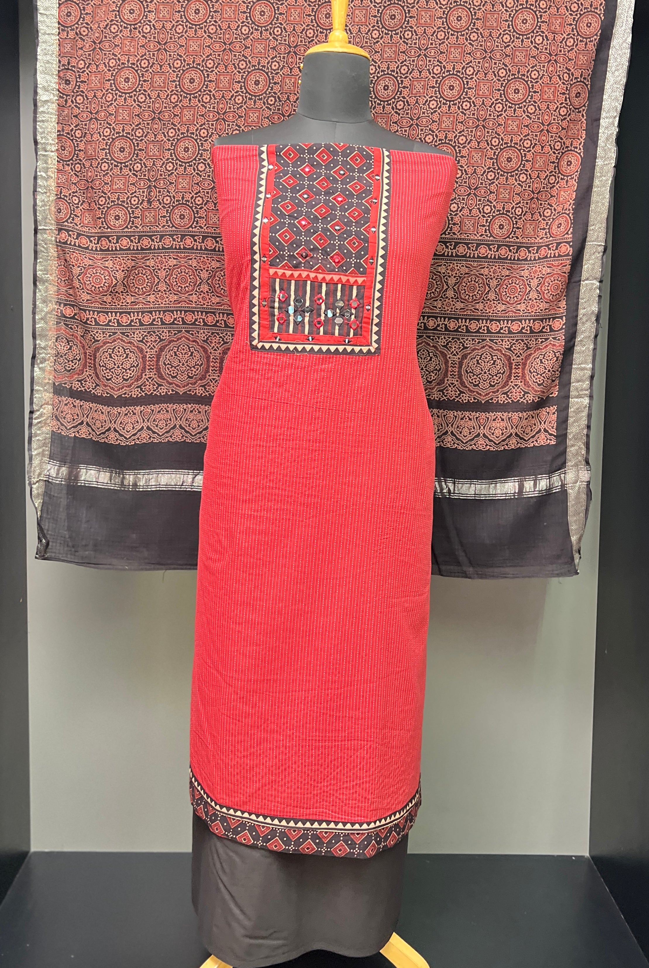•  Style: Ajrak Print Patterned Yoke, Mirror Detailing, Kantha Weaved