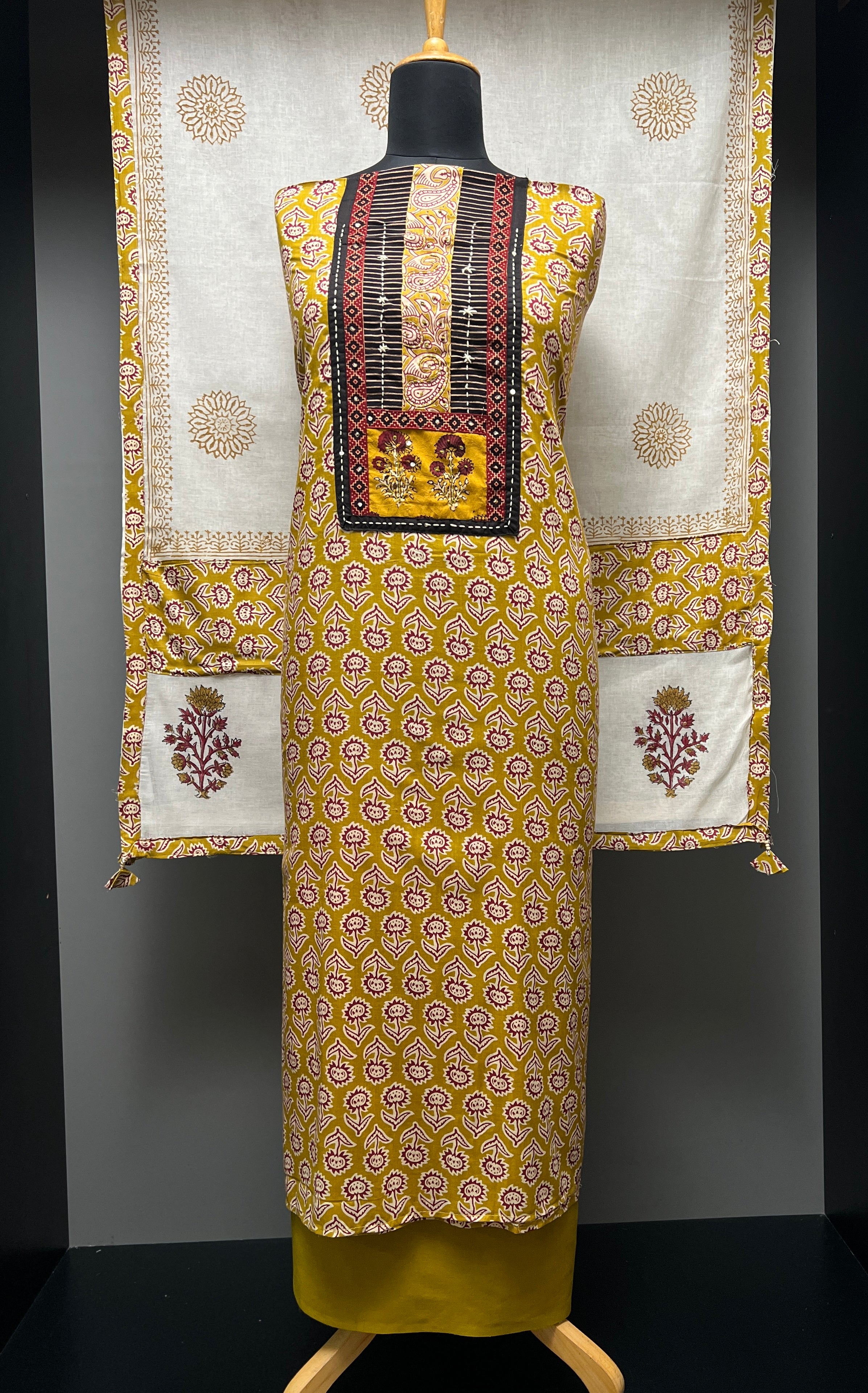 - Style: Ajrak Printed, Printed Patch Detailed Yoke Portion With Hand Embroidery Kantha & Sequence Highlighted