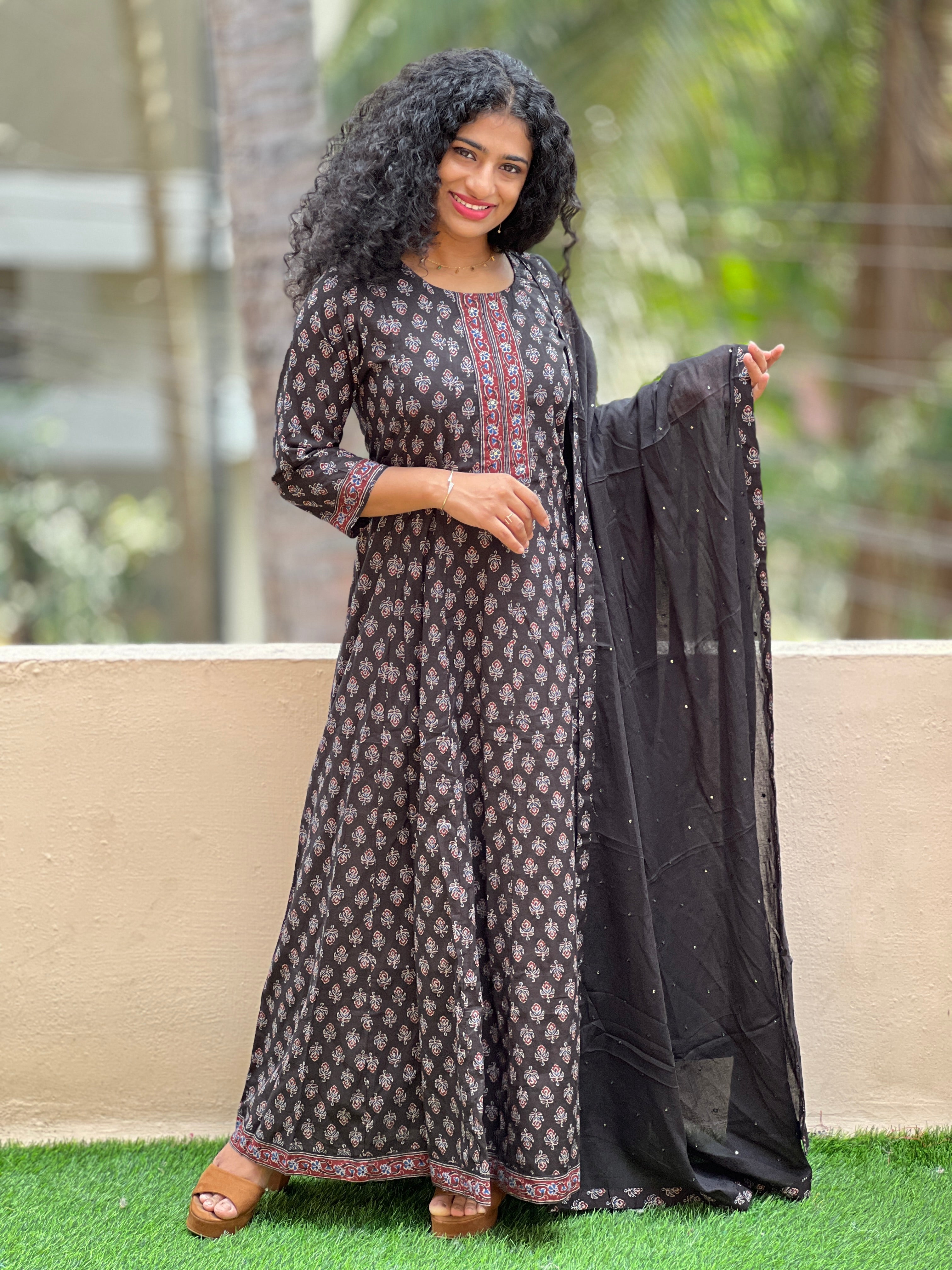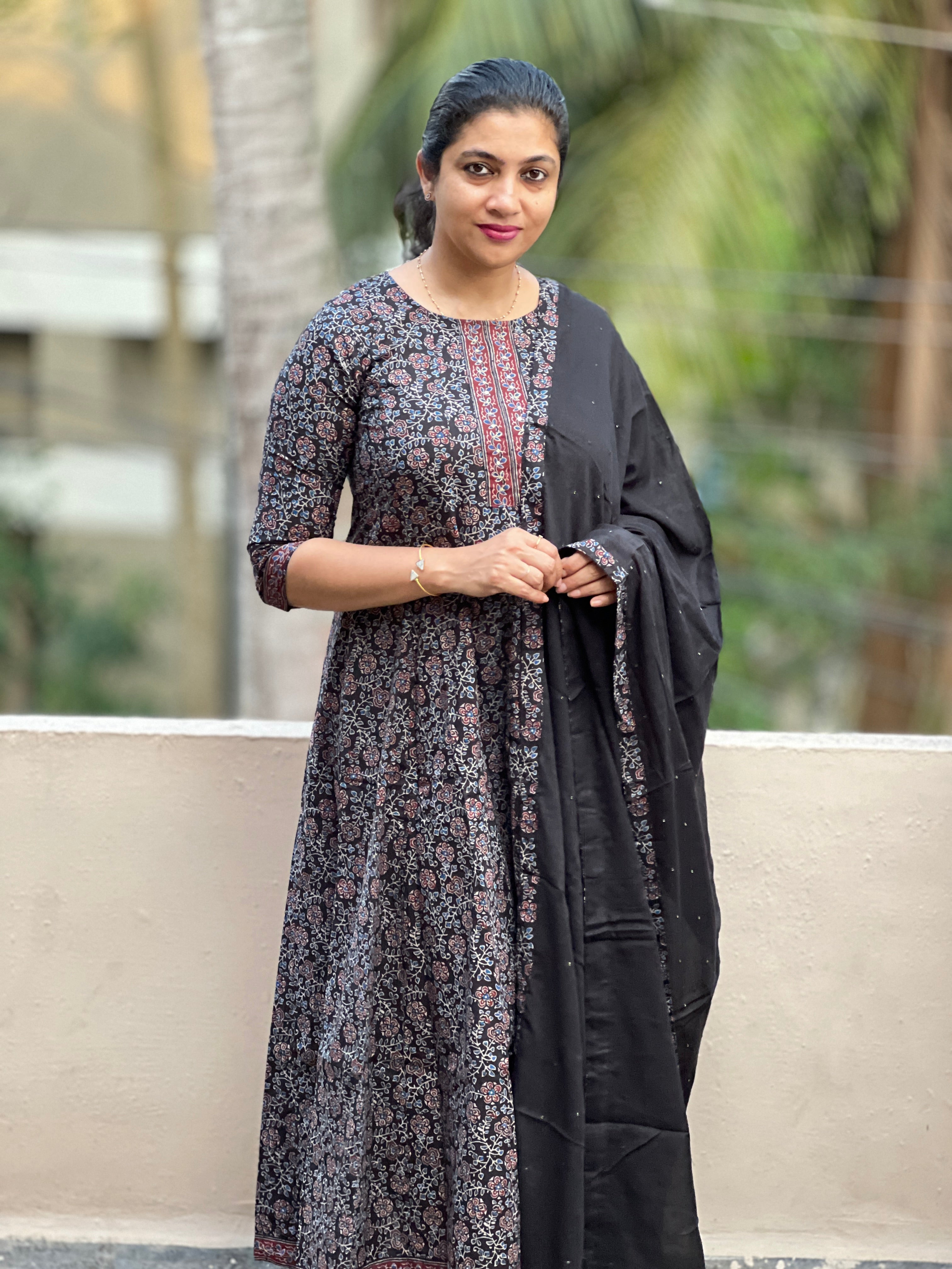 - Style: Ajrak Screen Printed Aari Work Panel Design and Sequence Work
