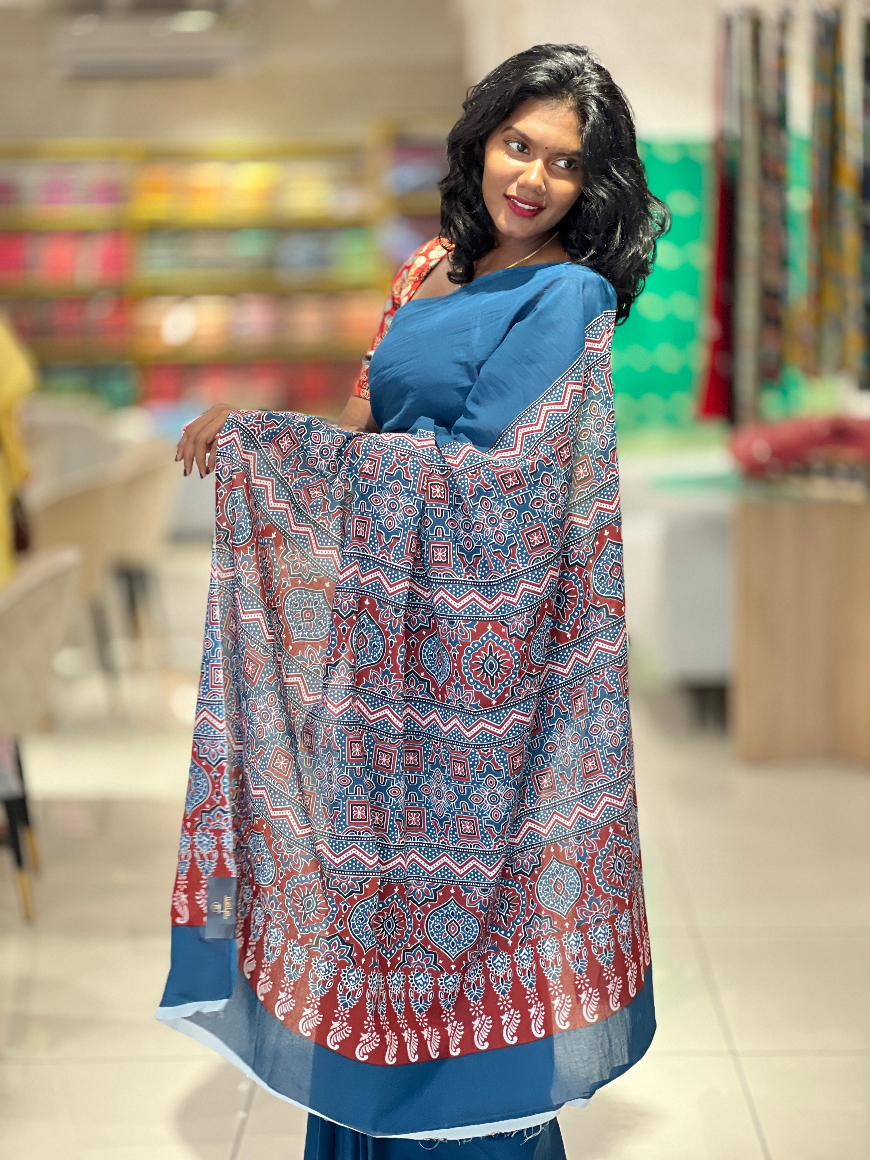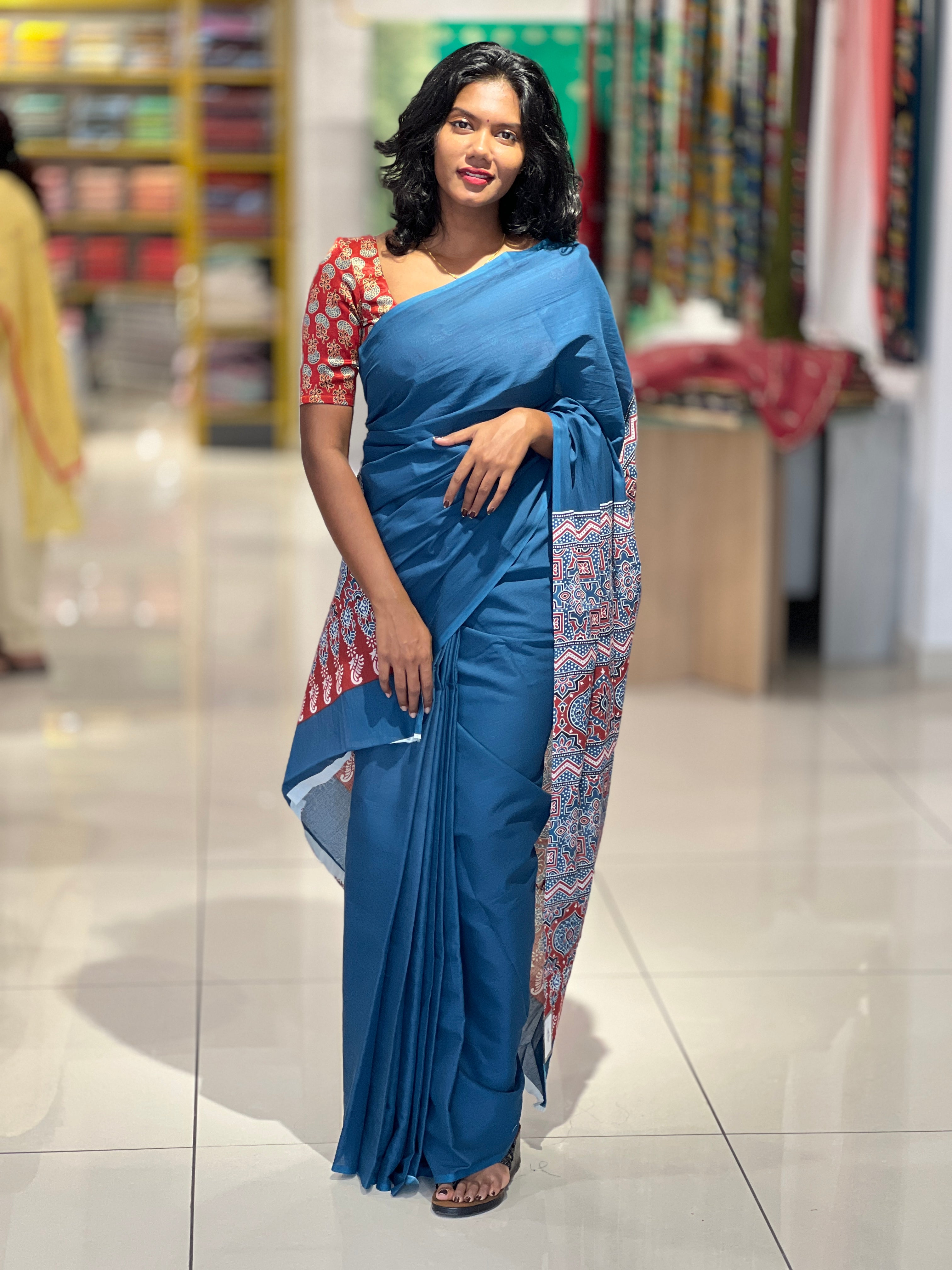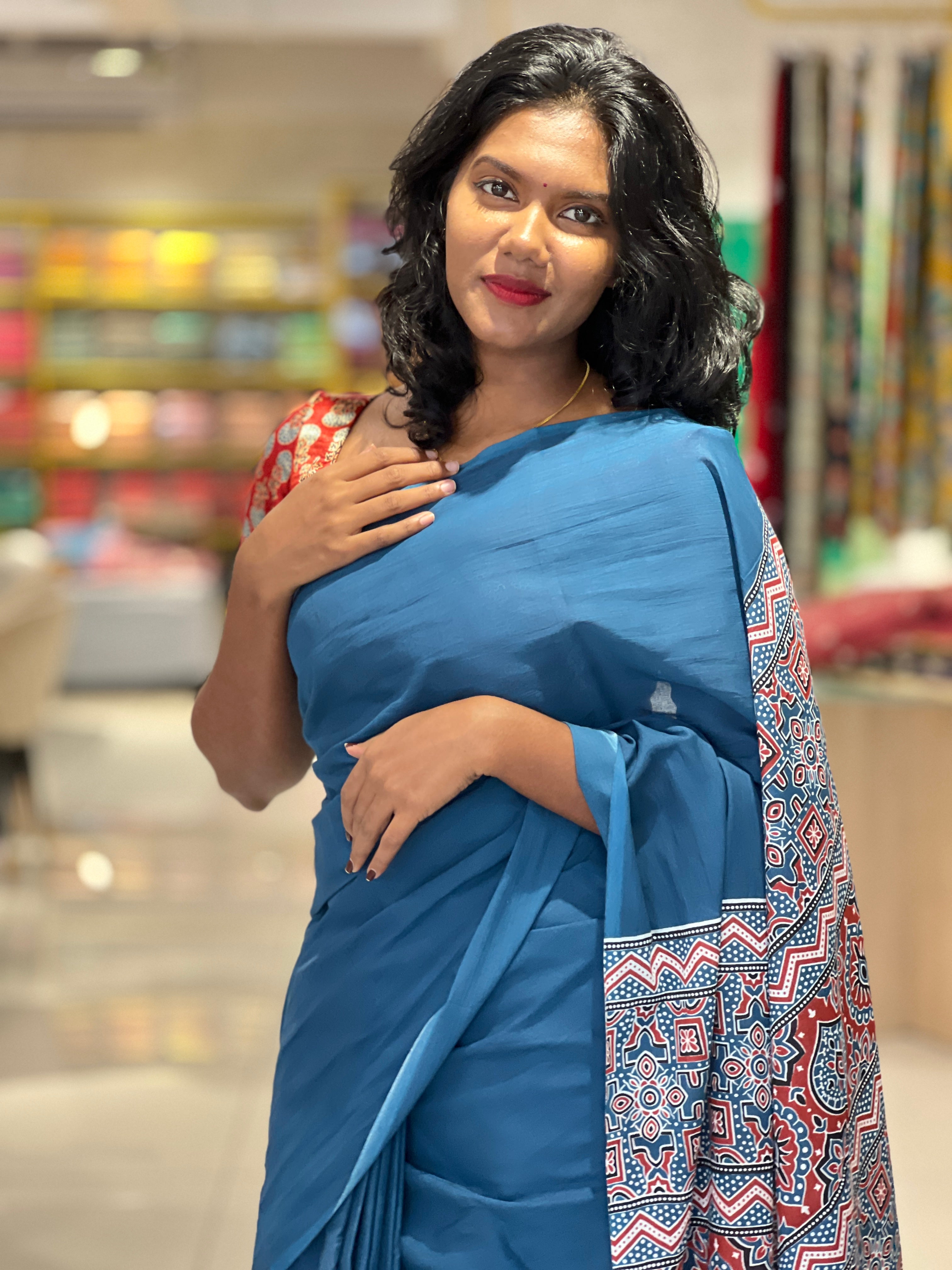 - Style: Solid, Ajrakh Inspired Printed Pallu