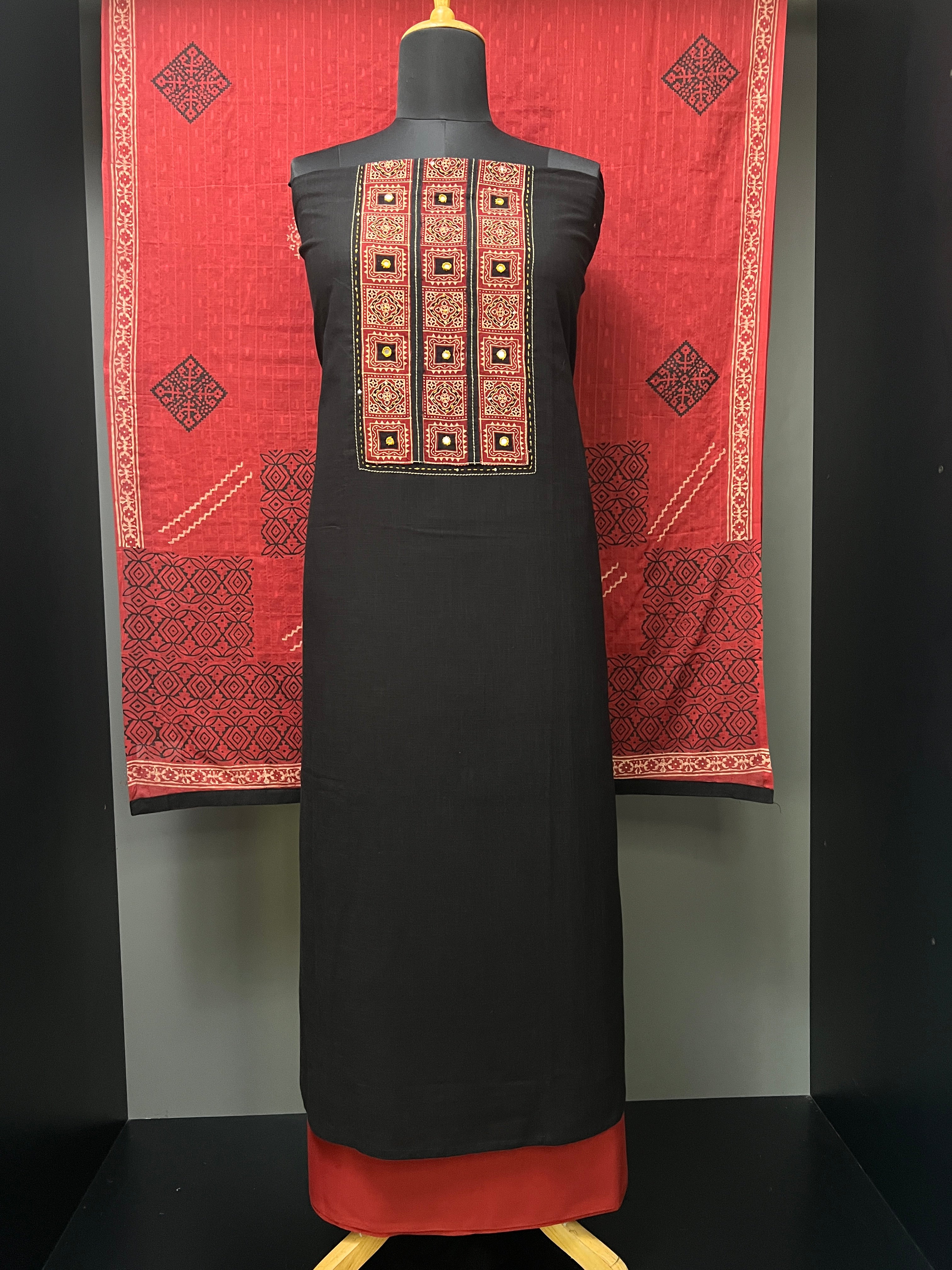 •  Style: Yoke Ajrakh Print Pattern, Mirror Detailing, Highlight Kantha Weving
