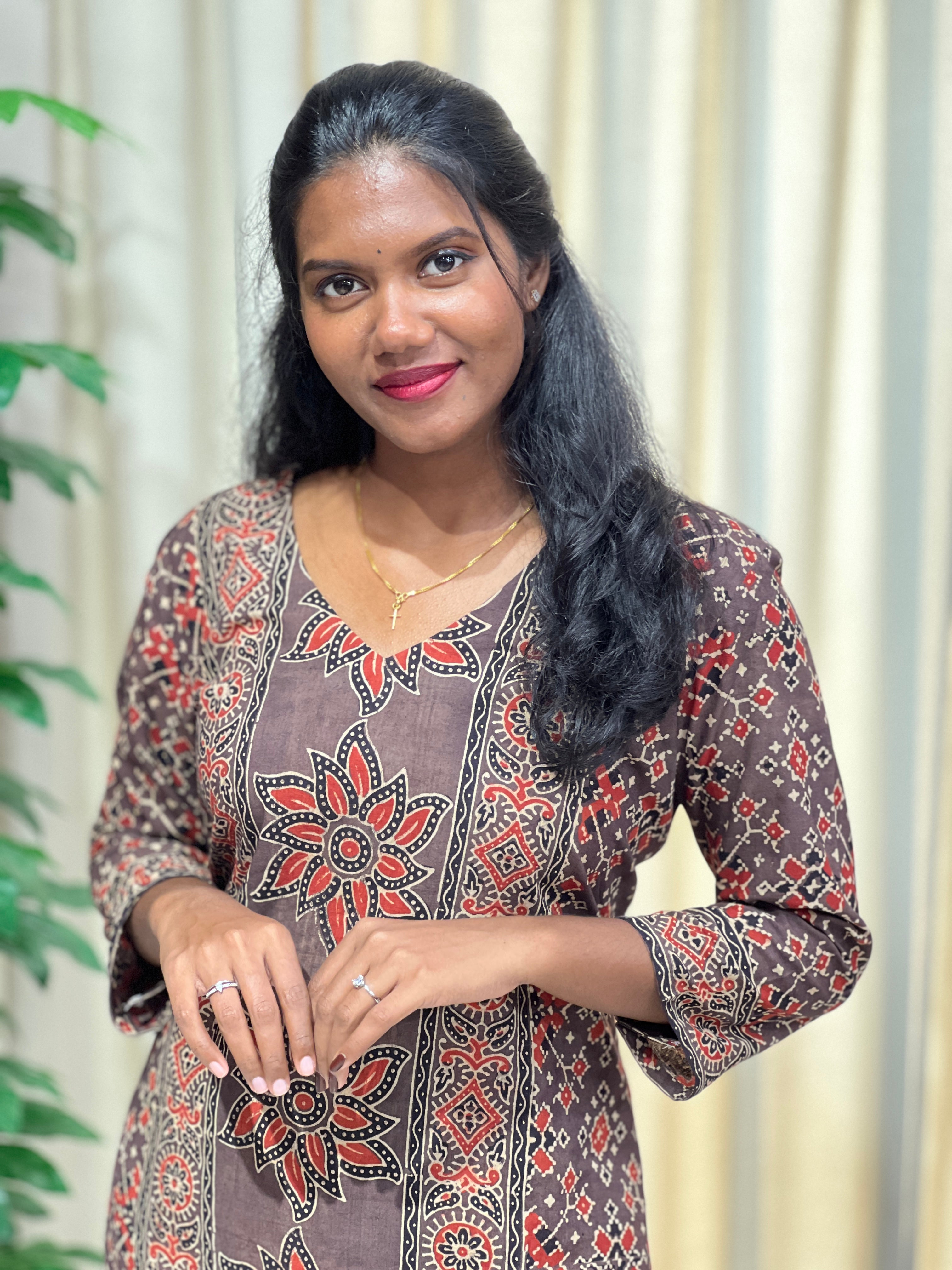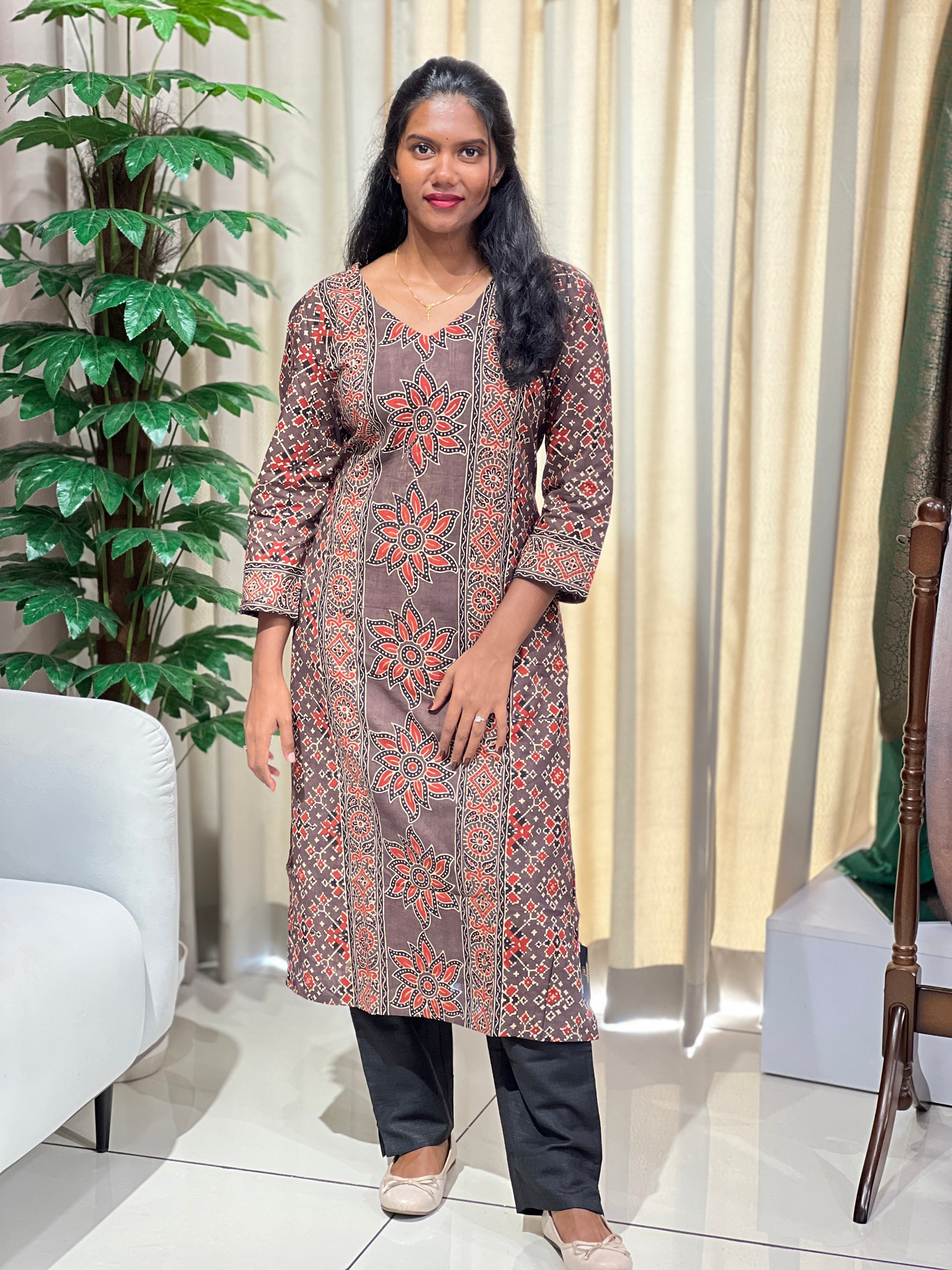 - Style: Ajrakh Printed, Side Slit Pattern, Without Lining