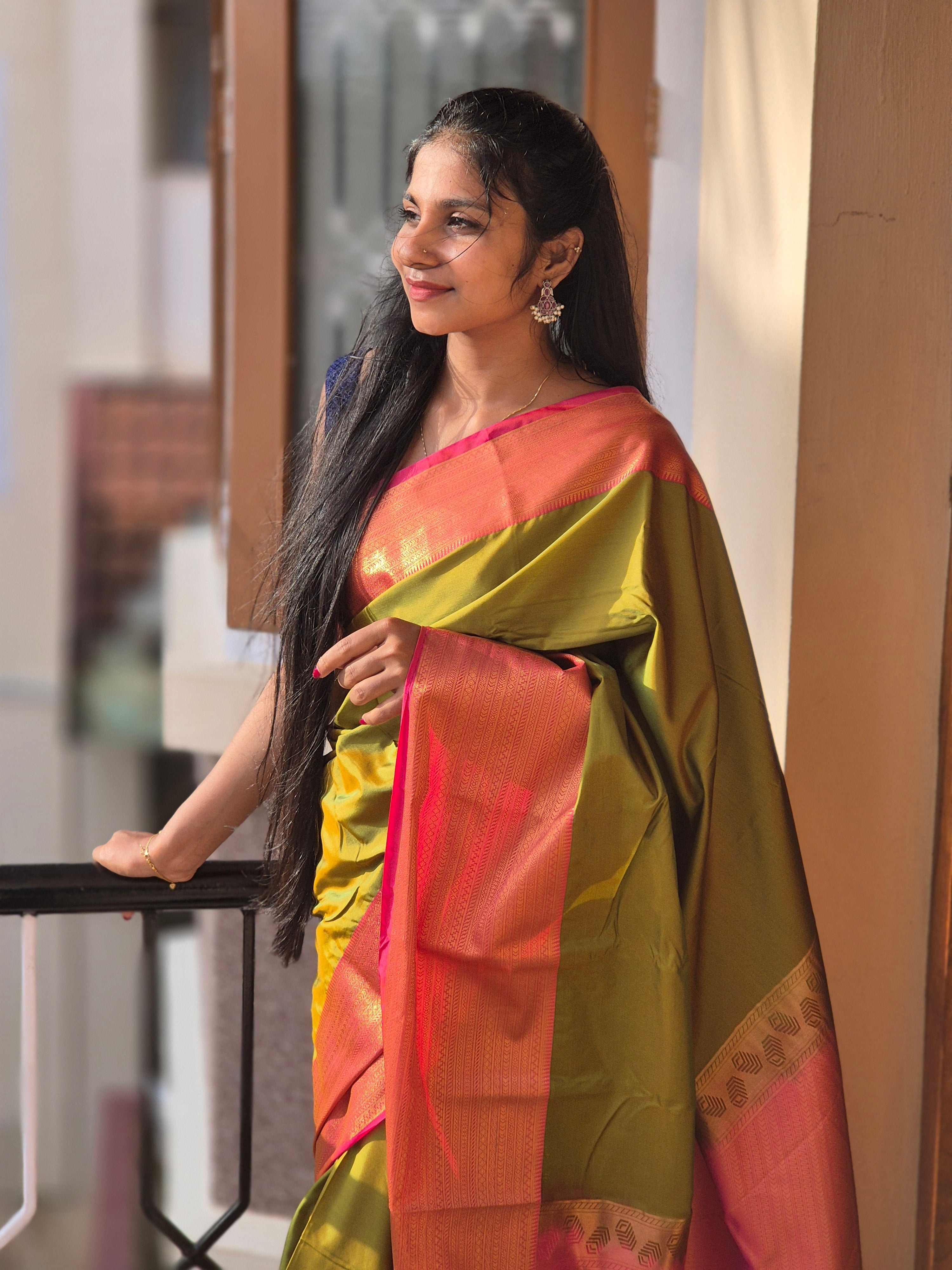 - Style: Antique Zari Weaving, Contrast Border & Pallu
