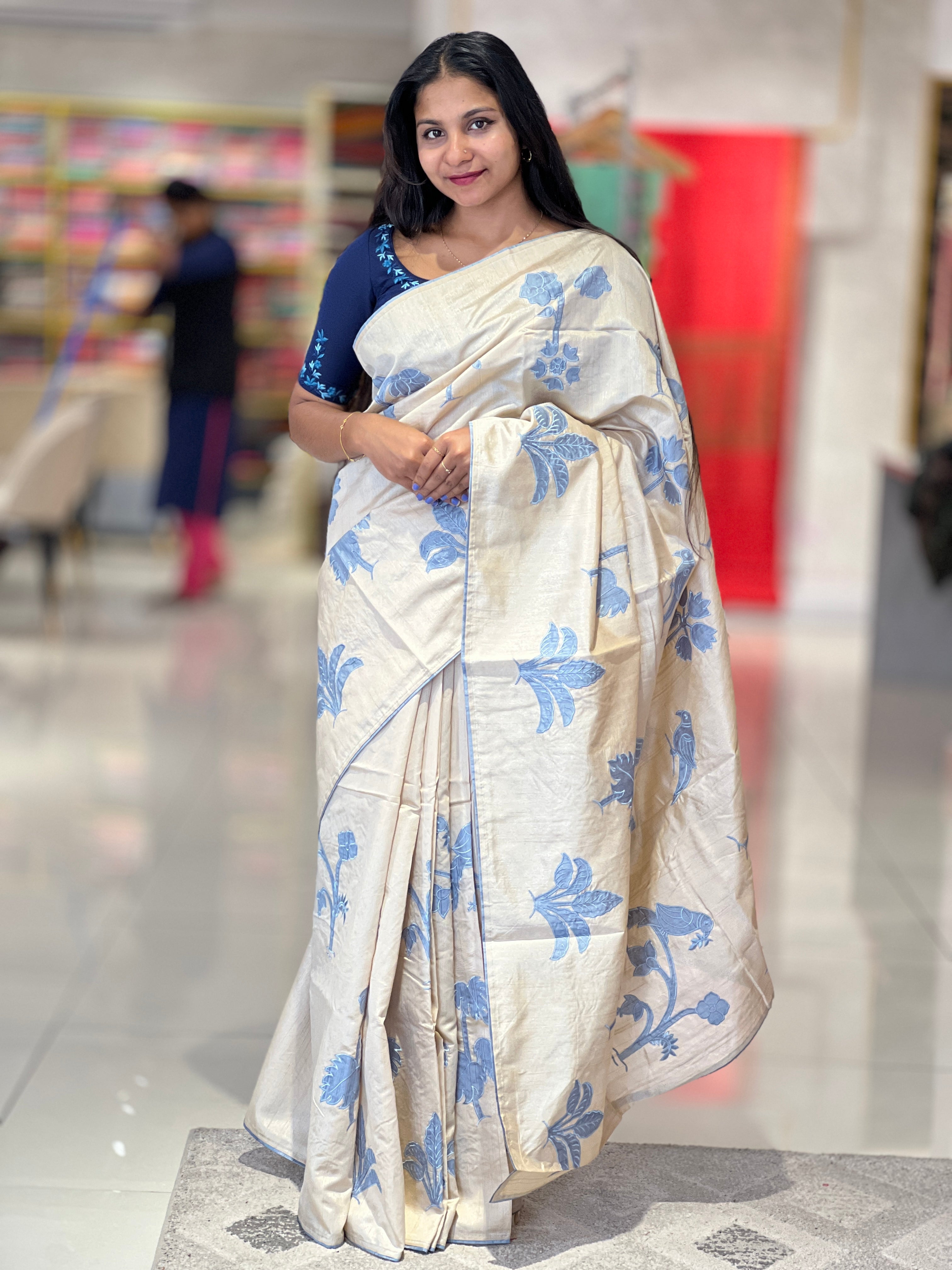 • Style: Machine Embroidery, Applique Work Detailing, Bird & Leaf Pattern, Flat Face Finished Edges