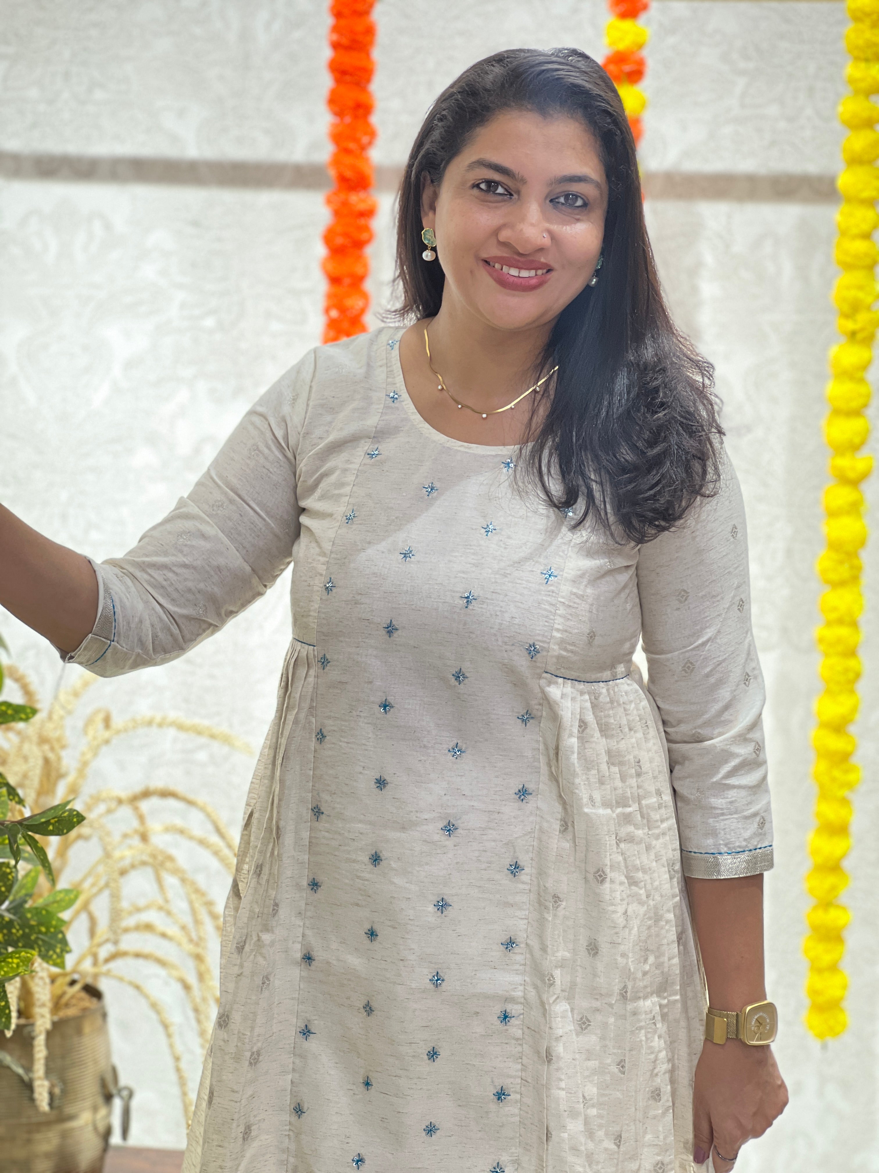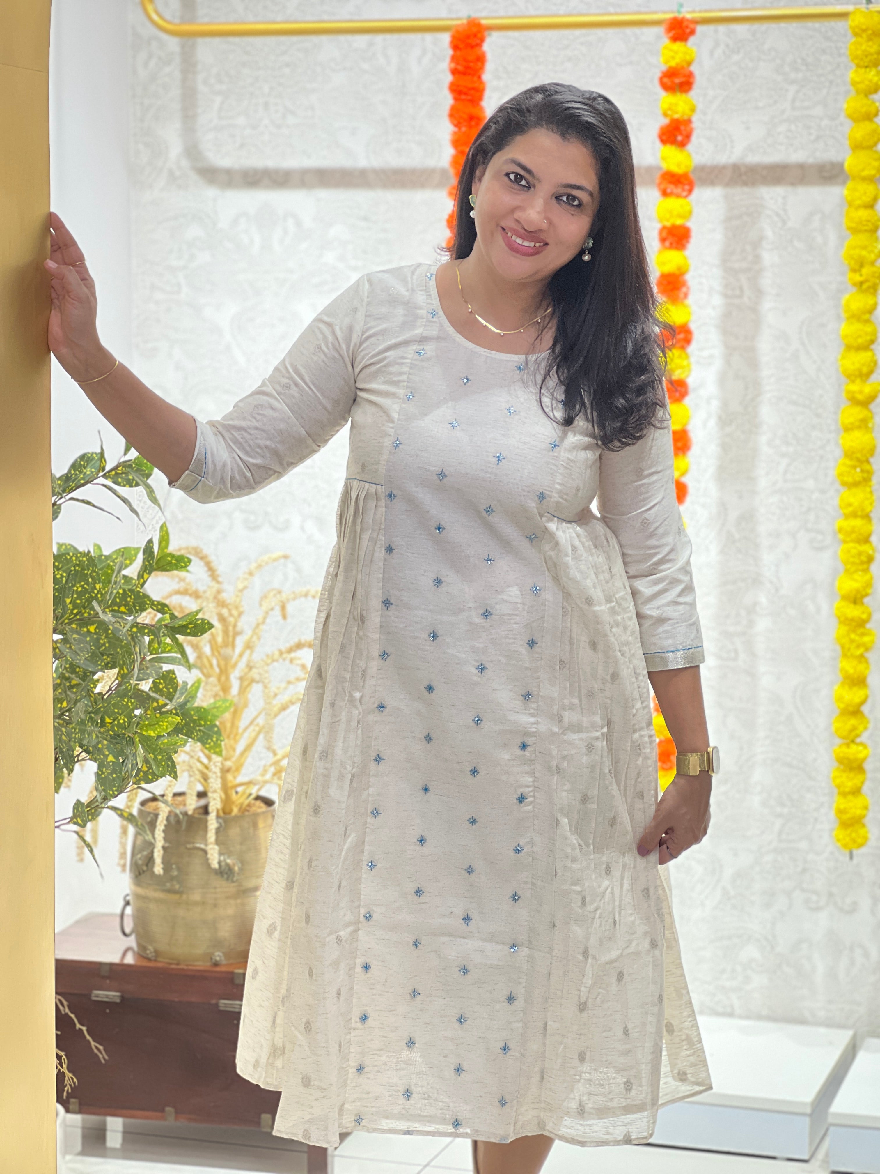 - Style - Embroidery With Sequence Highlighted Center Panel, Banarasi Butta Weaved, Khadi Finished, A-Line Pattern, With Lining, Knife Pleated Side Panels