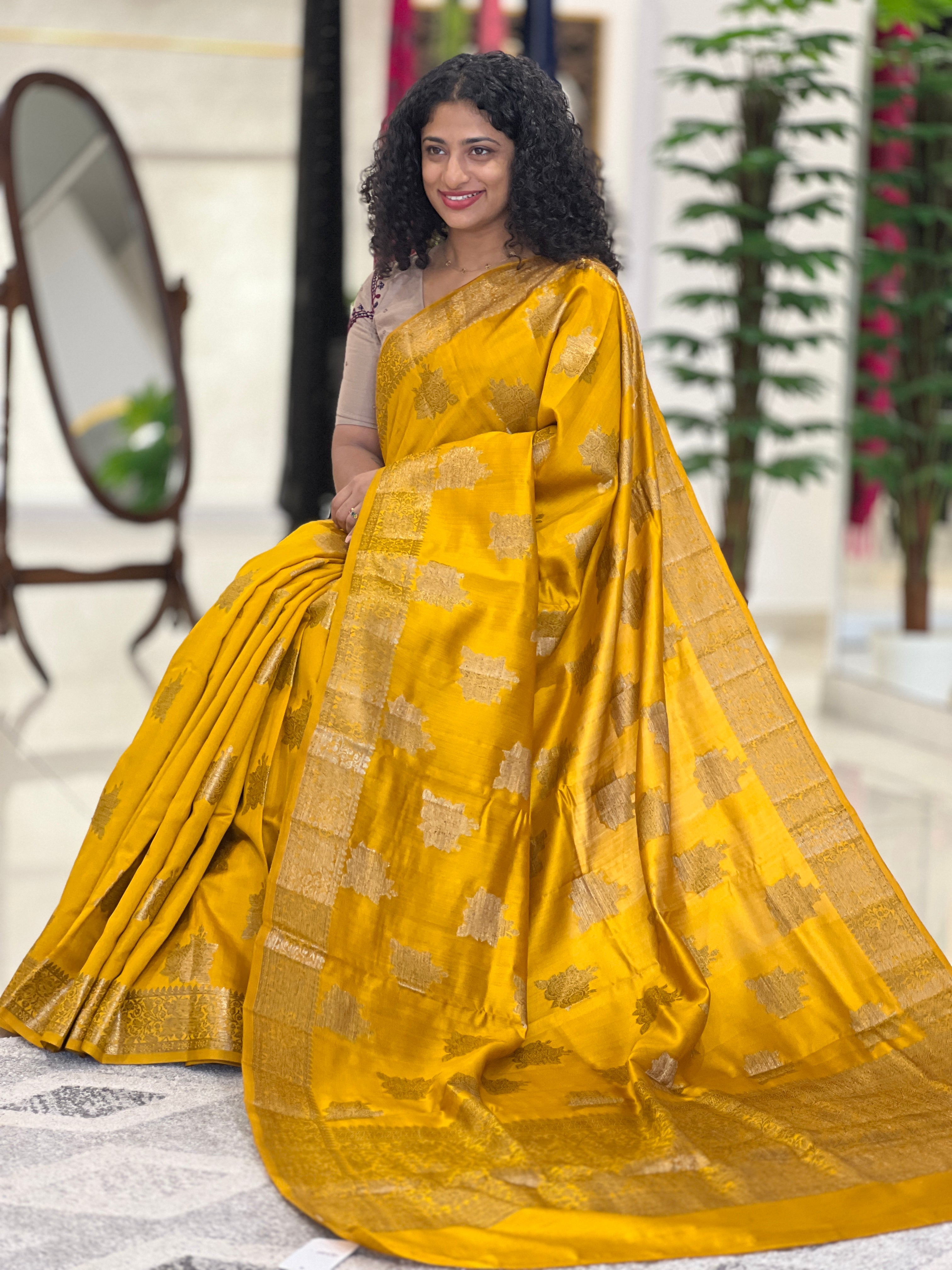 •  Style: Antique Golden Zari Weaving Pattern, Hand Woven, Banarasi Pattern