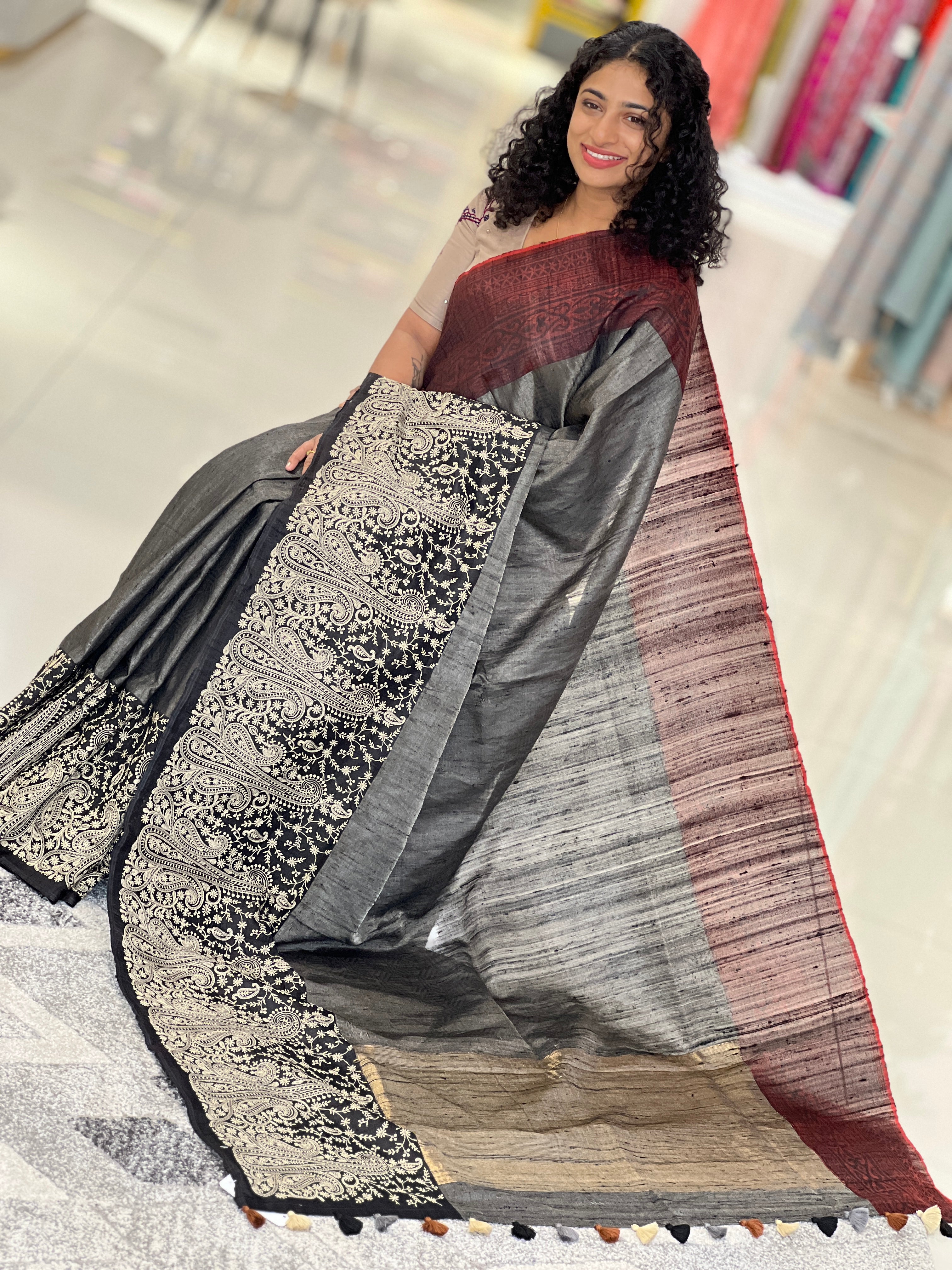 - Style: Tissue Weaving, Banarasi Long Paisley Lower Border, Zari Weaved Pallu, Thread Woven Upper Border, Tassels Attached