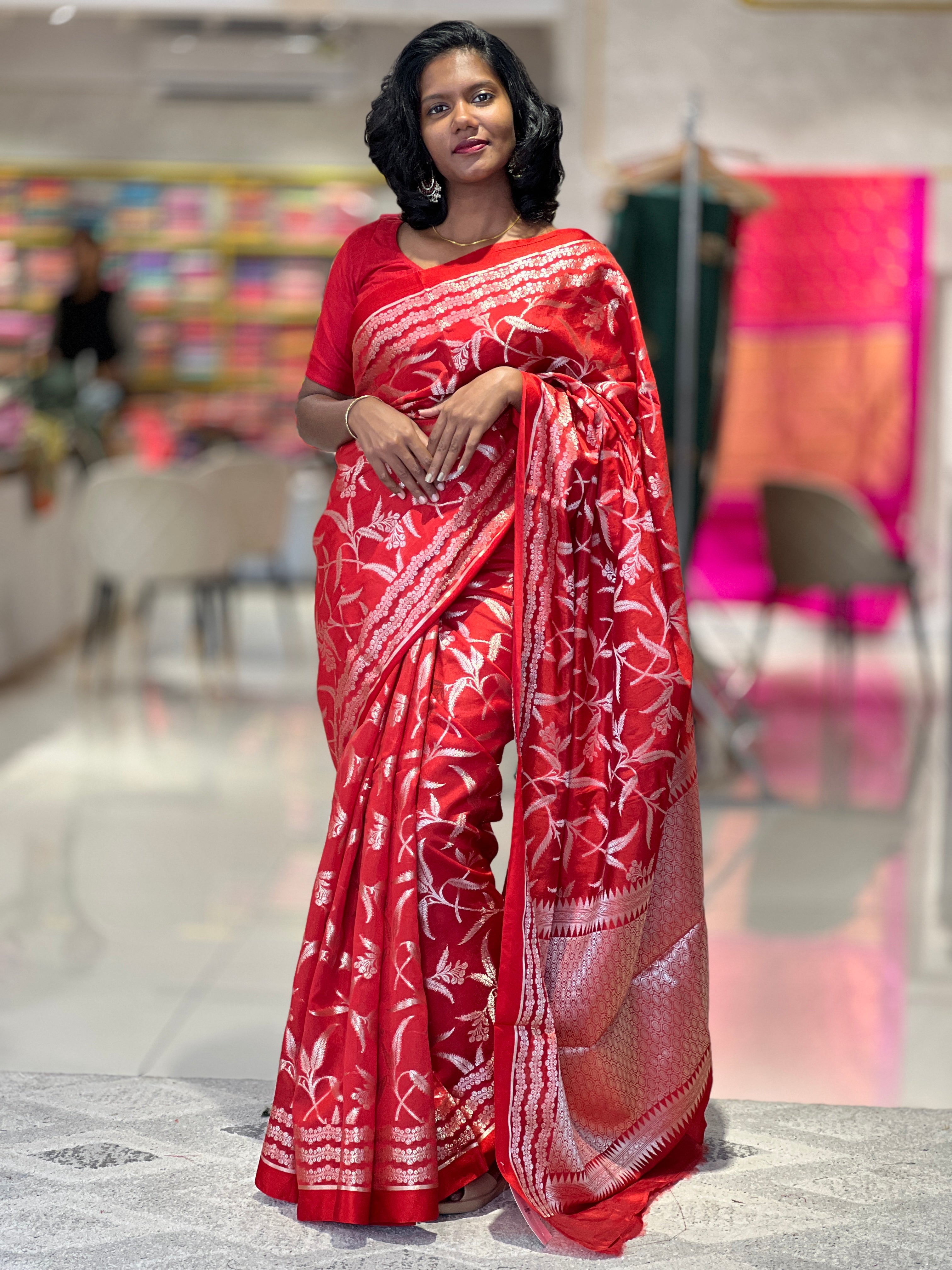 - Style: Banarasi Pattern, Light Golden Zari Woven, Satin Borders, Leaf Jaal Design, Brocade Patterned Pallu, Power Loom