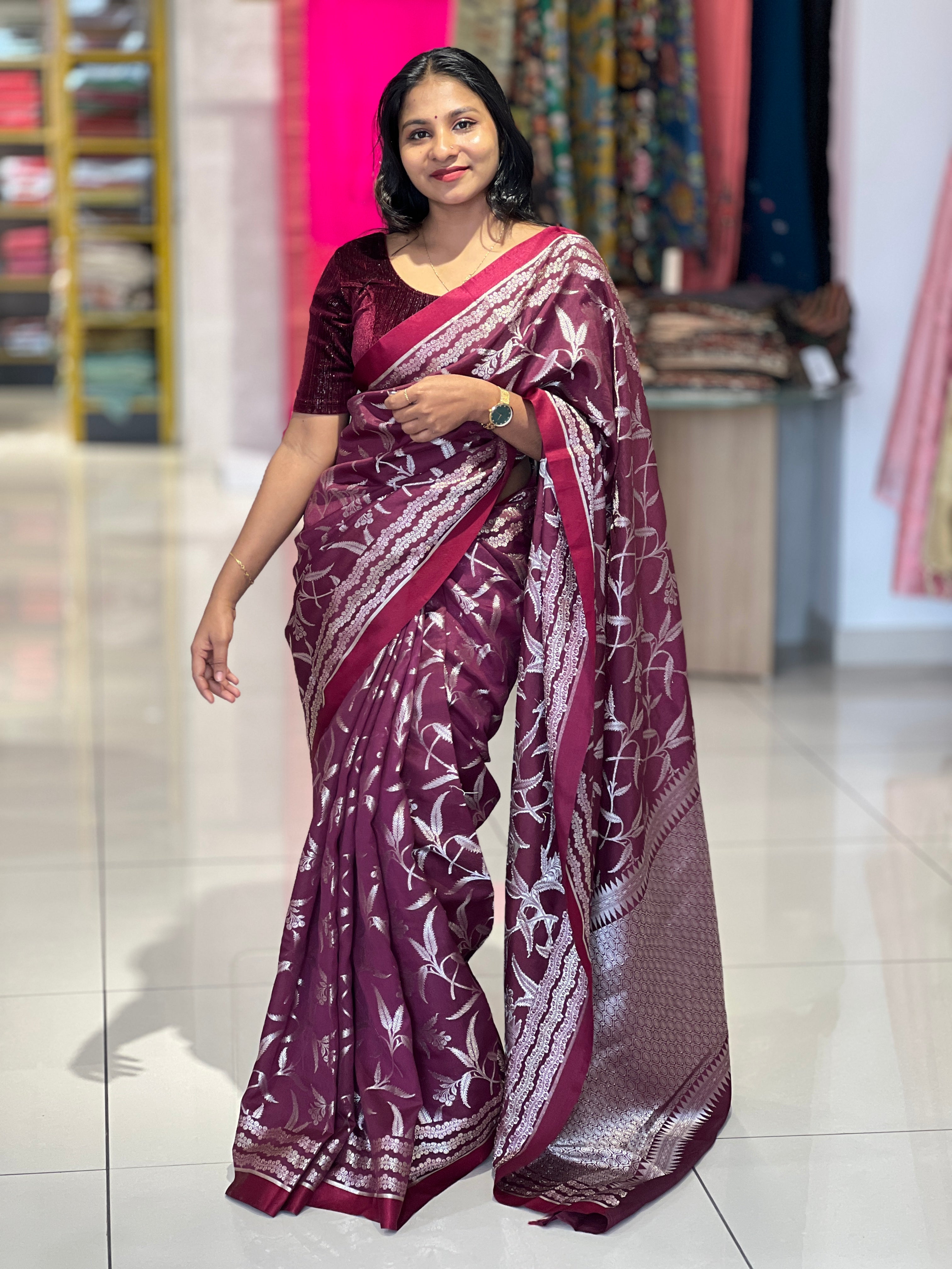 - Style: Banarasi Pattern, Light Golden Zari Woven, Satin Borders, Leaf Jaal Design, Brocade Patterned Pallu, Power Loom