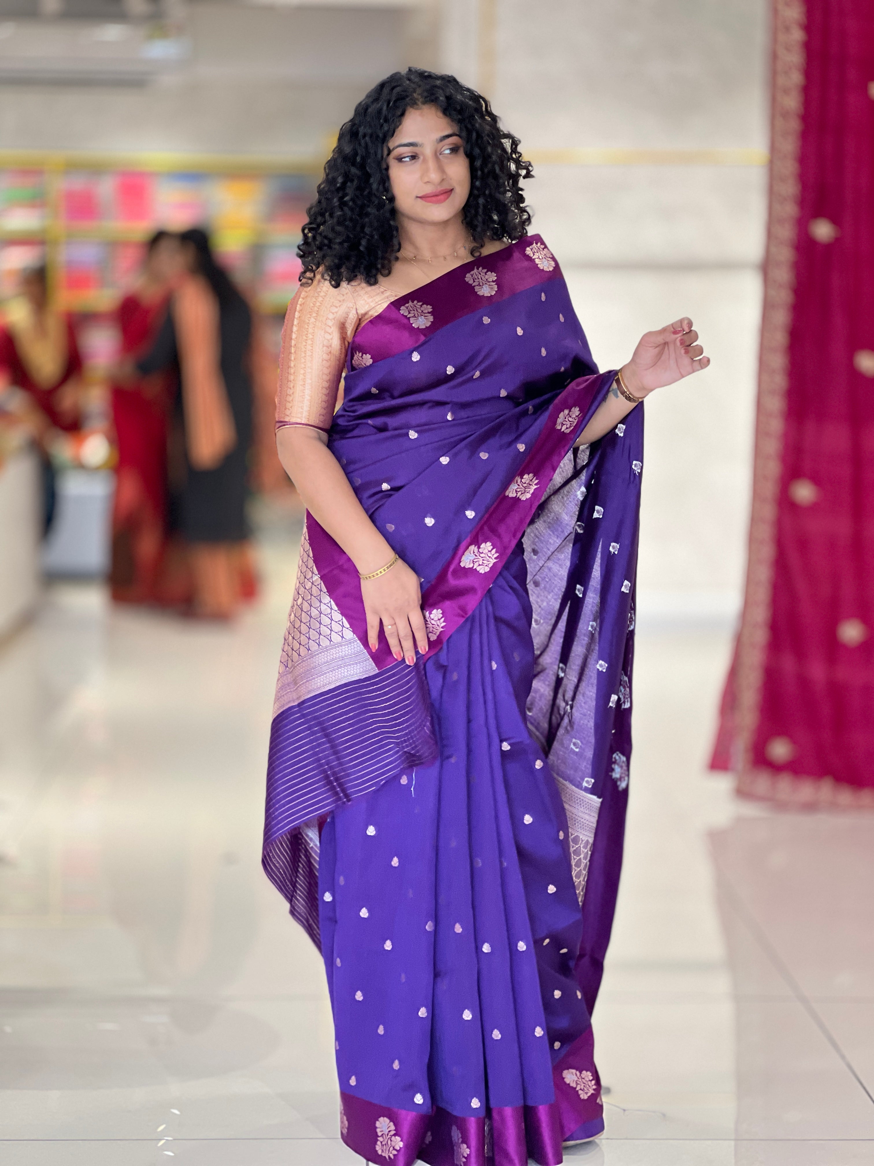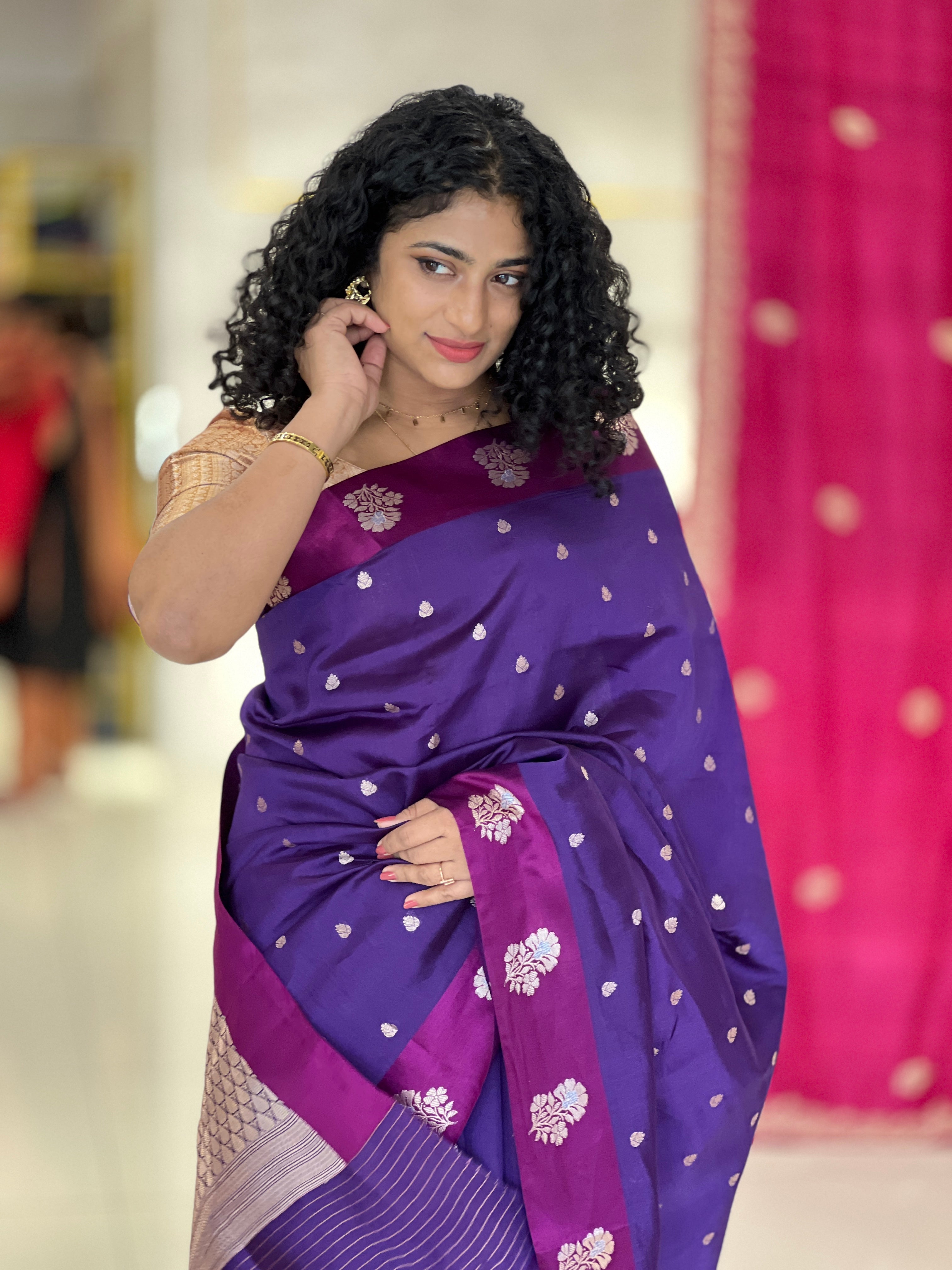 - Style: Banarasi Pattern, Satin Weaved Borders, Scattered Gopi Butas, Zari Weaved Geometric Patterned Pallu