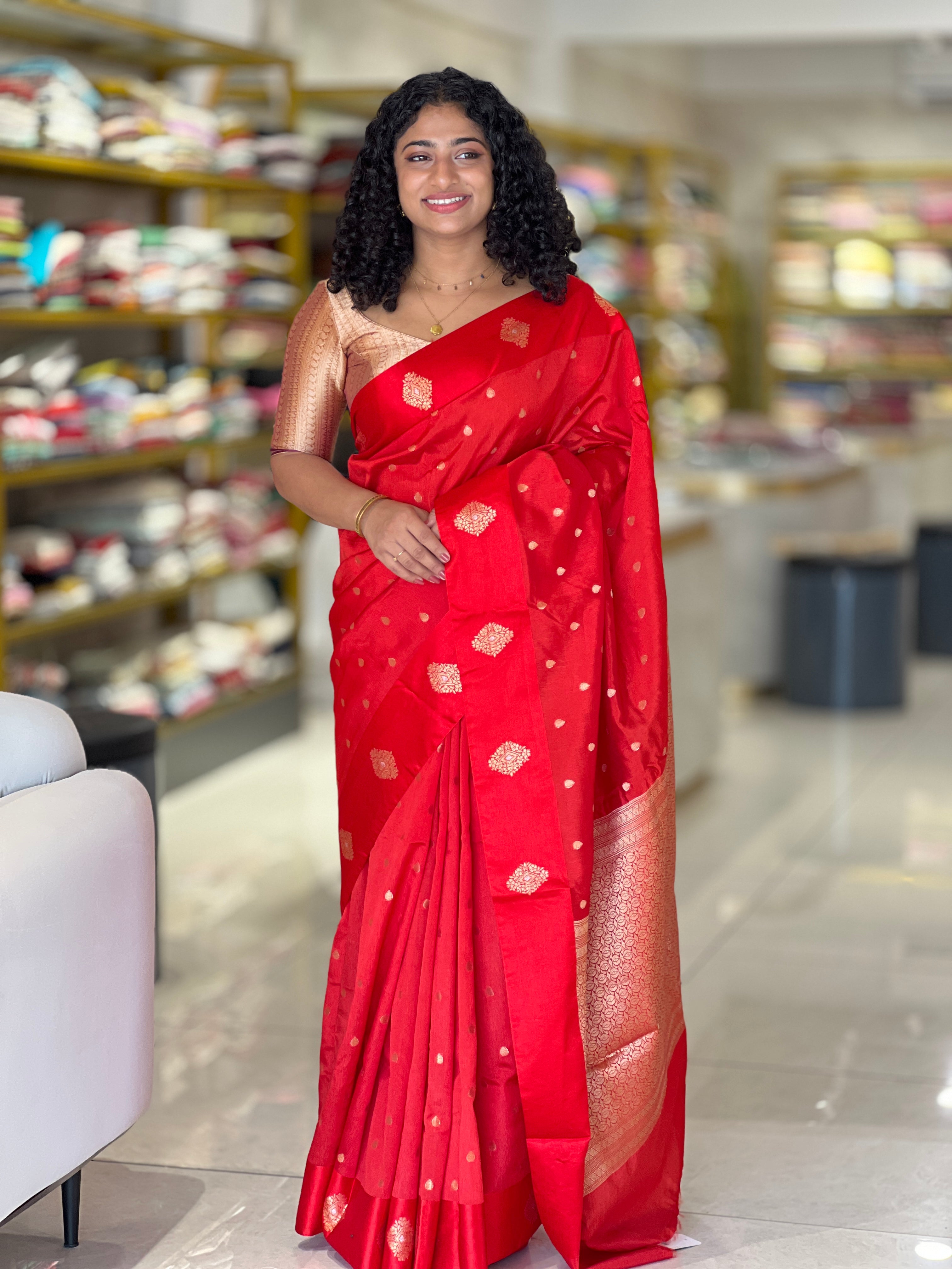 • Style: Banarasi Pattern, Satin Weaved Borders, Scattered Gopi Butas, Zari Weaved Geometric Patterned Pallu