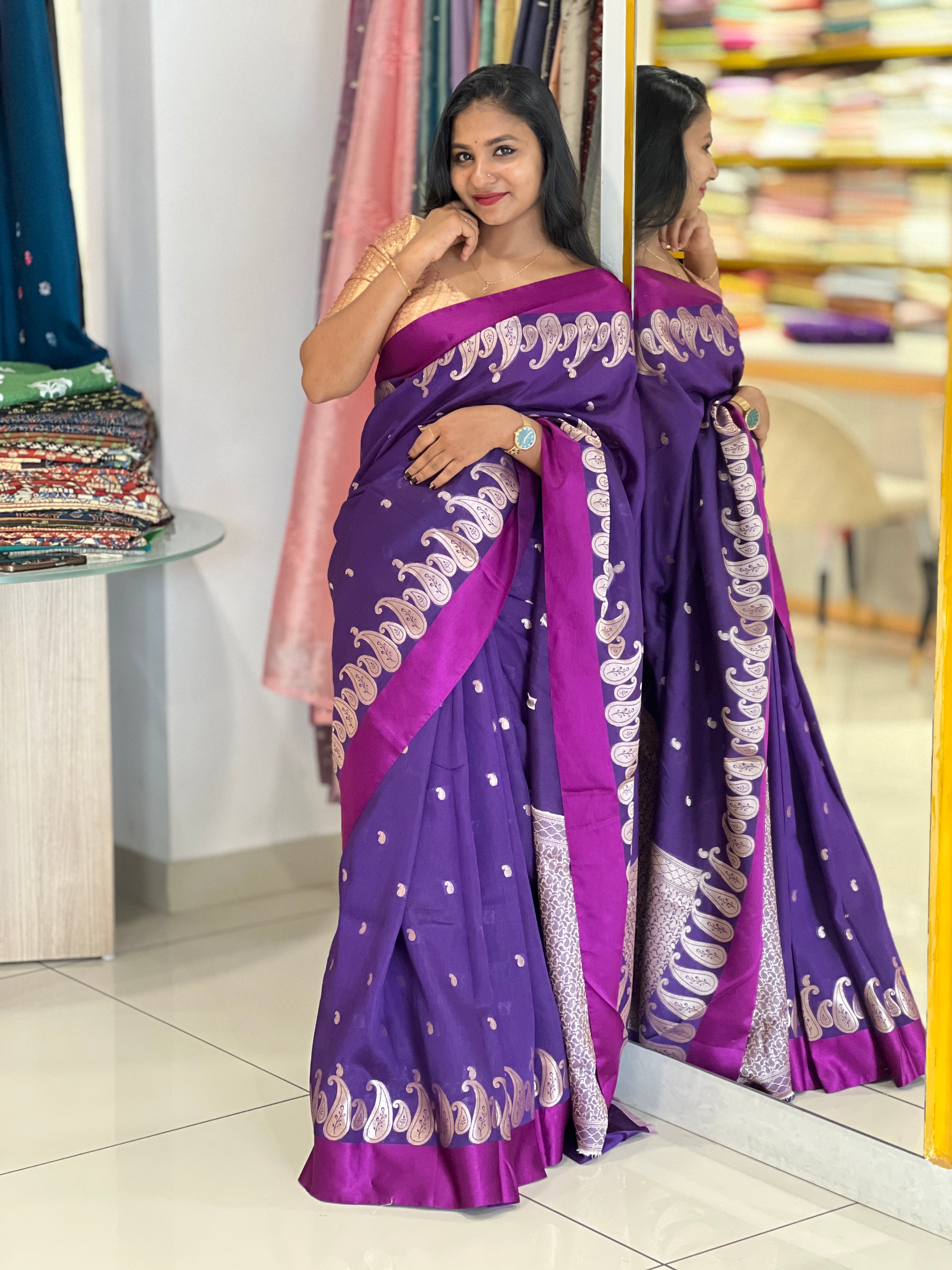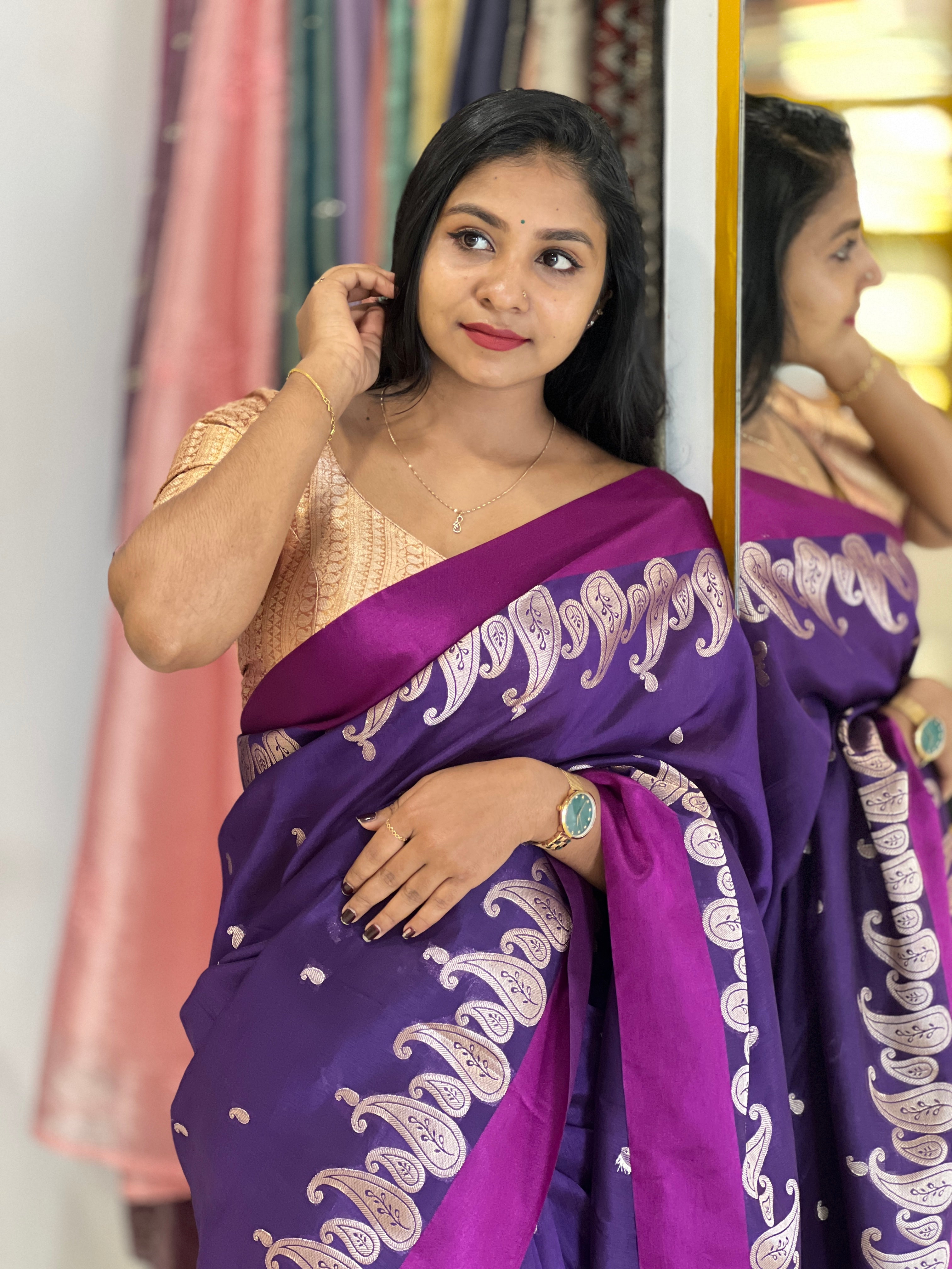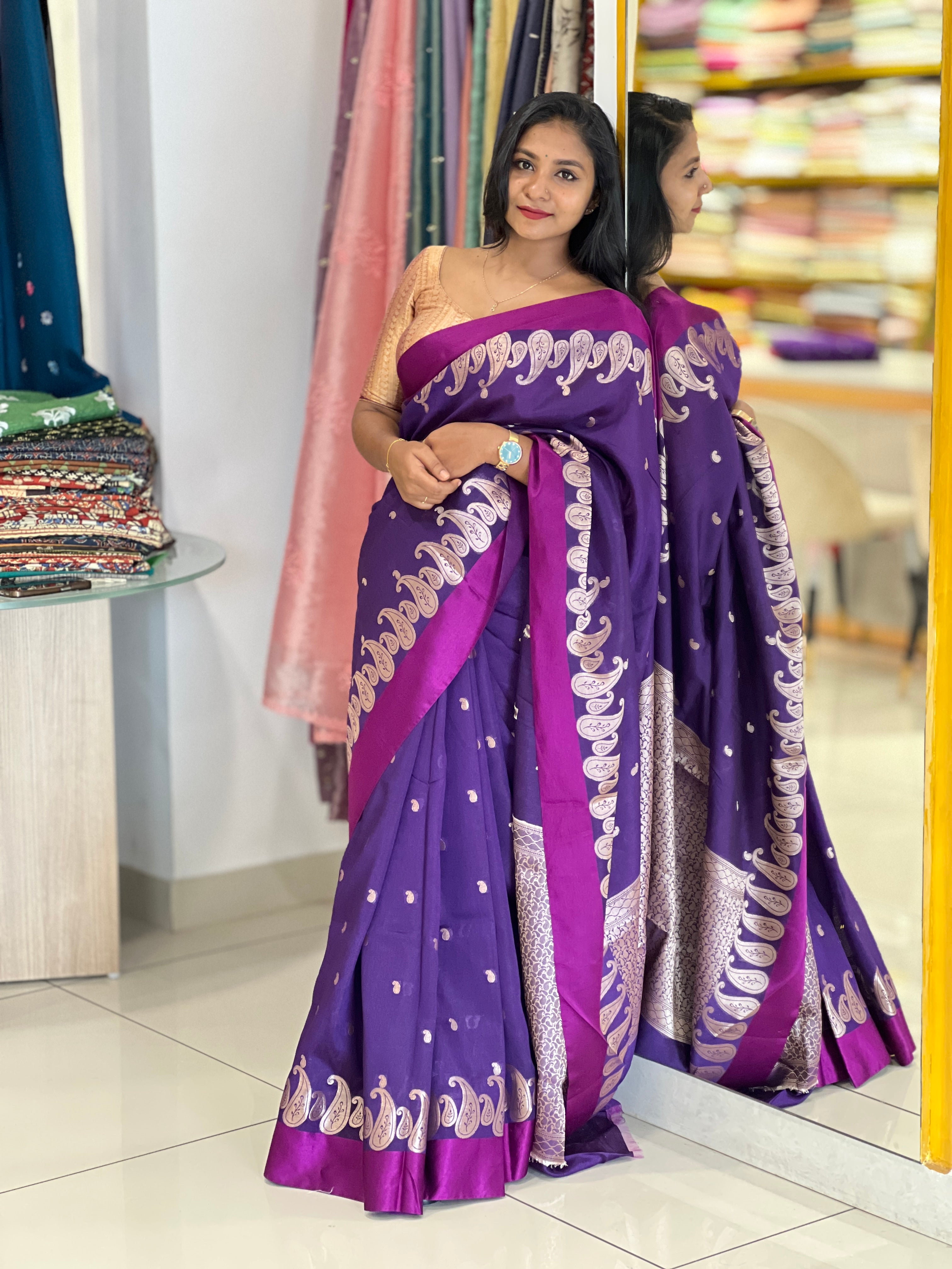 - Style: Banarasi Pattern, Satin Weaved Borders, Scattered Gopi Butas, Zari Weaved Geometric Patterned Pallu