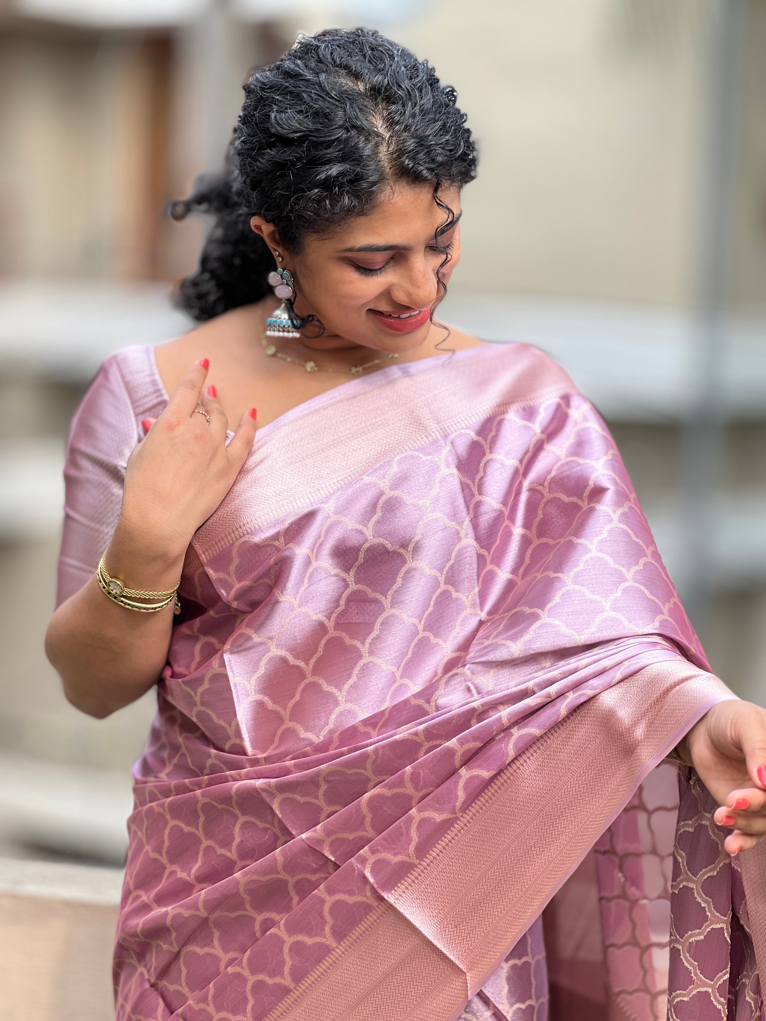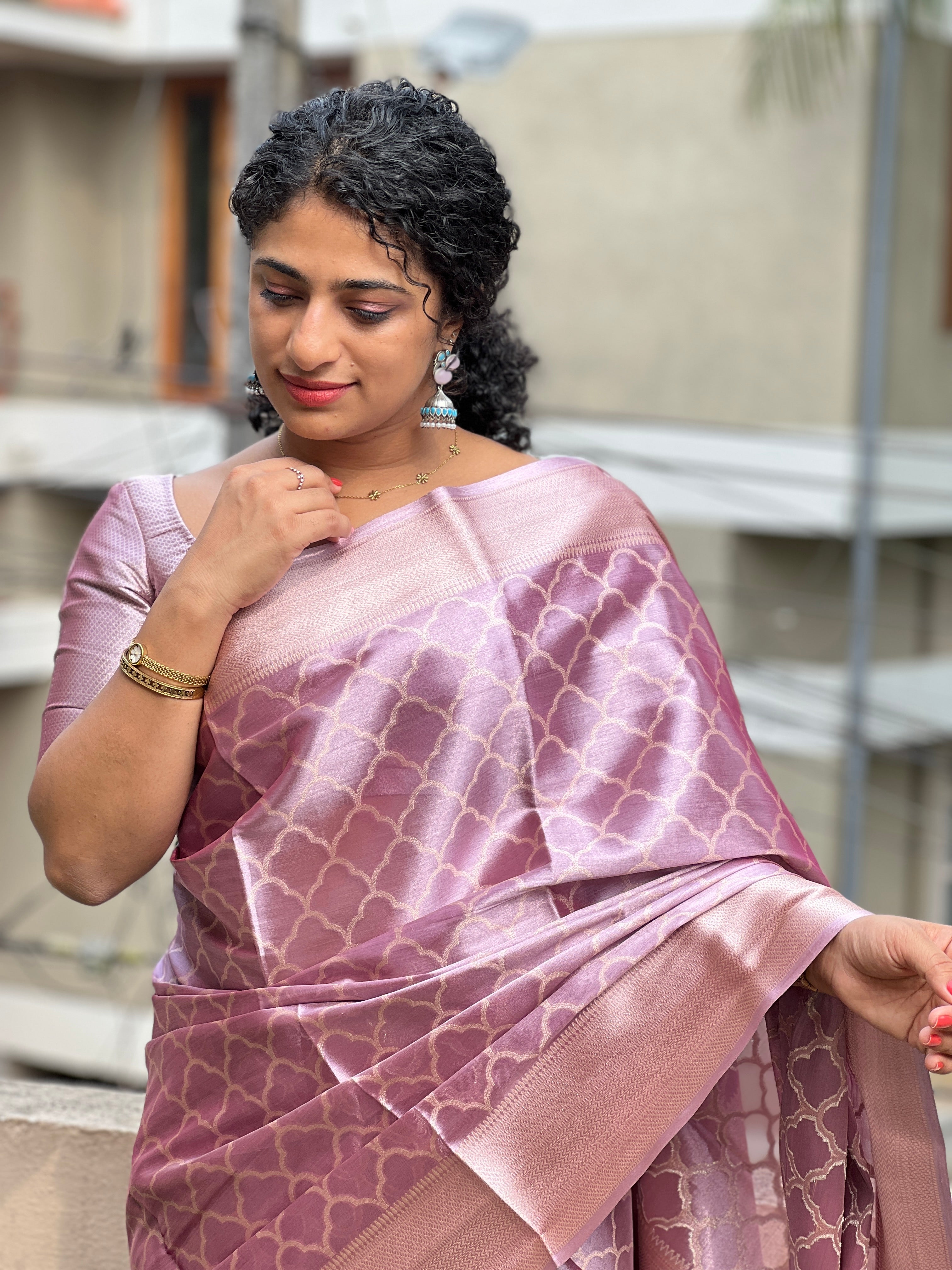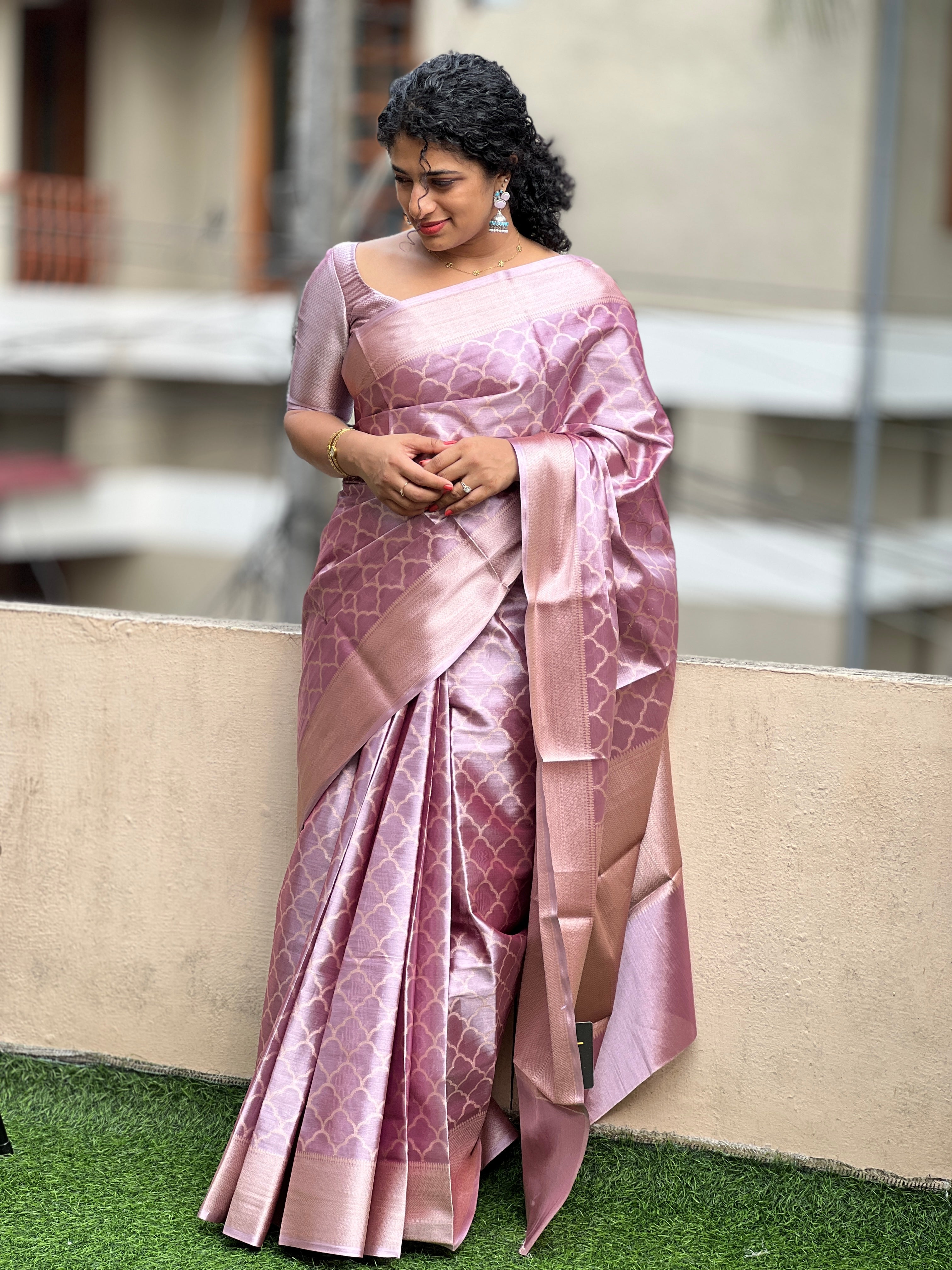 - Style: Pink Tissue, Banarasi Borders, Tile Pattern, Zig Zag Patterned Pallu