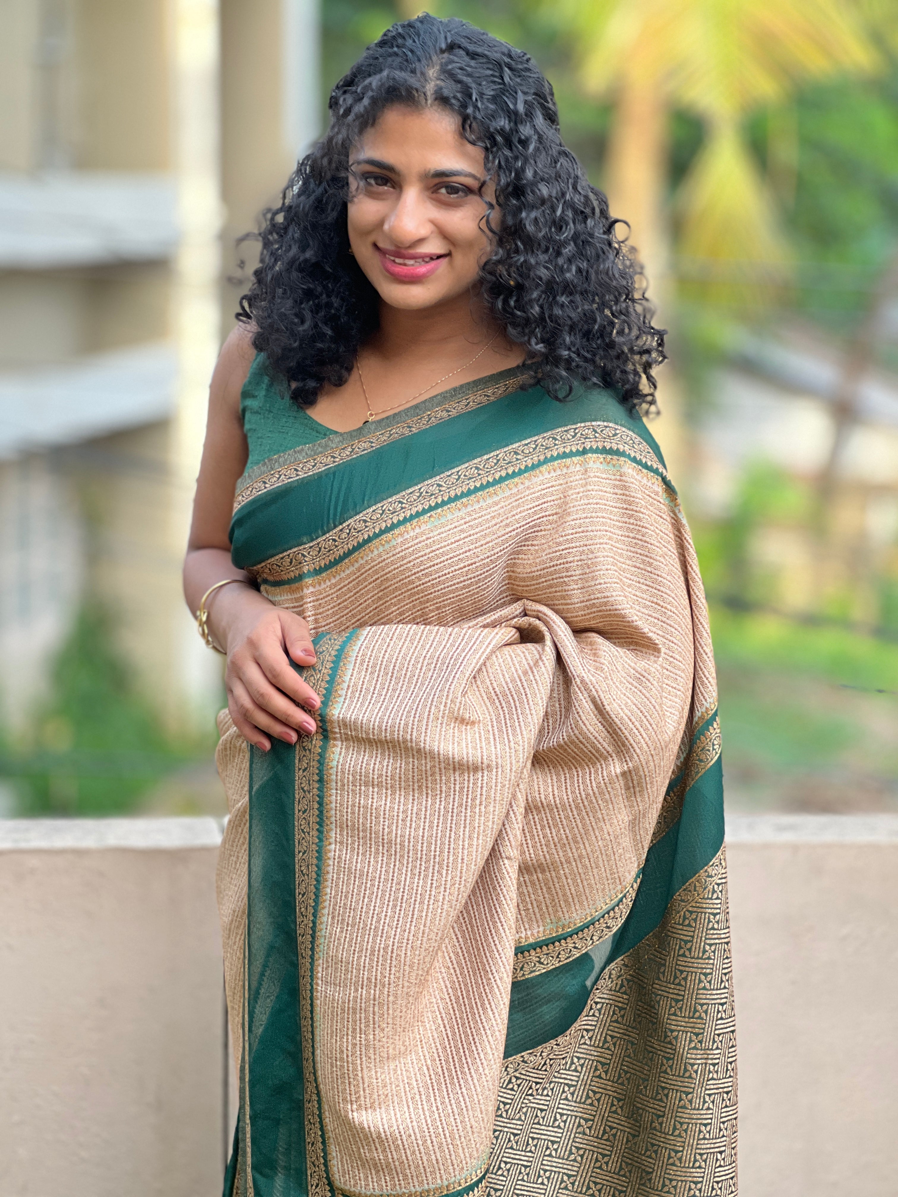• Style: Banarasi Border Pattern, Line Weaving Pattern, Basket Weaving & Geometric Patterned Pallu, Antique Golden Zari Weaved