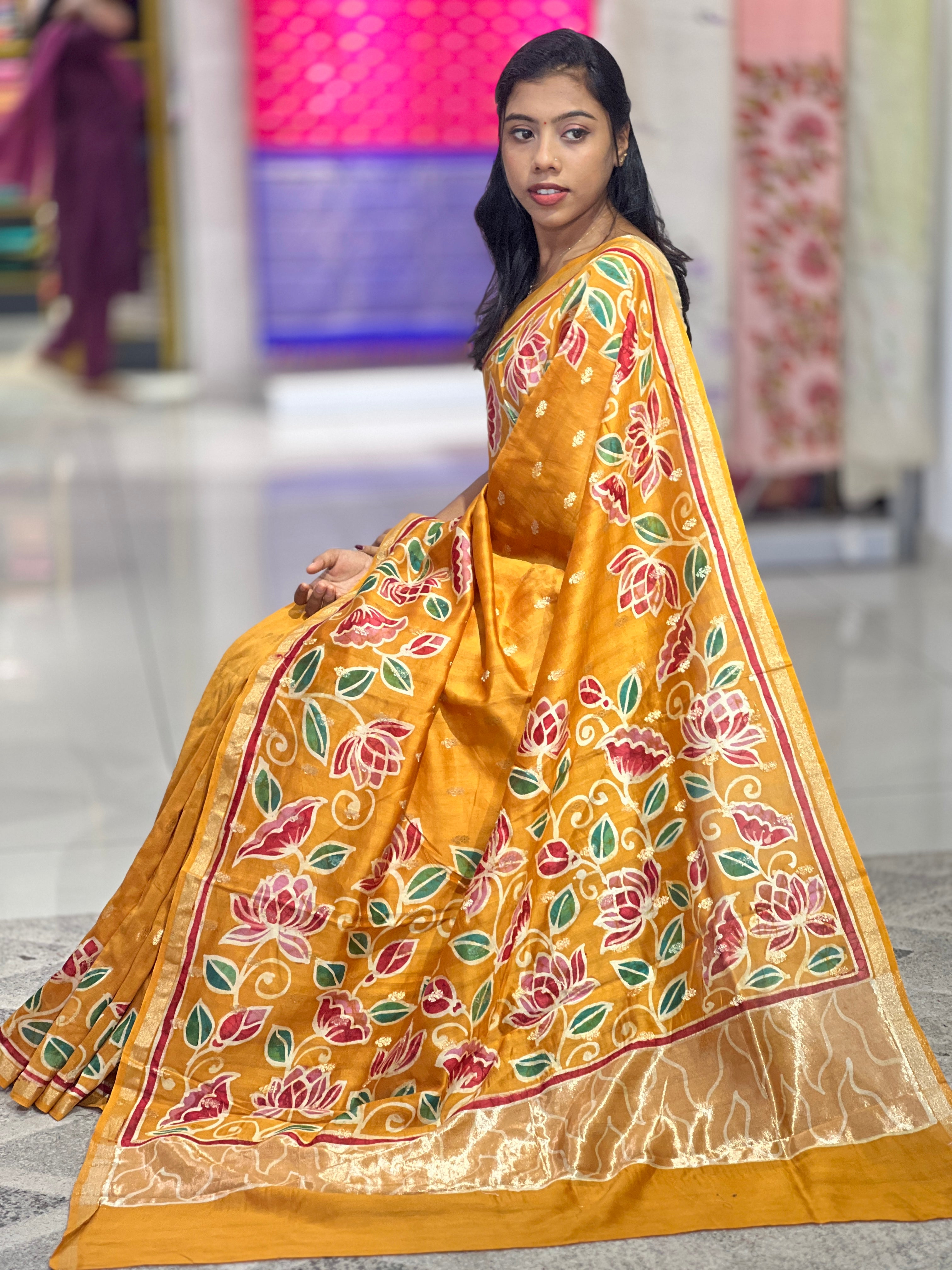 - Style: Banarasi Weaving Pattern, Batik Floral Printed Pattern, Zari Border Detailing, Zig Zag Pallu