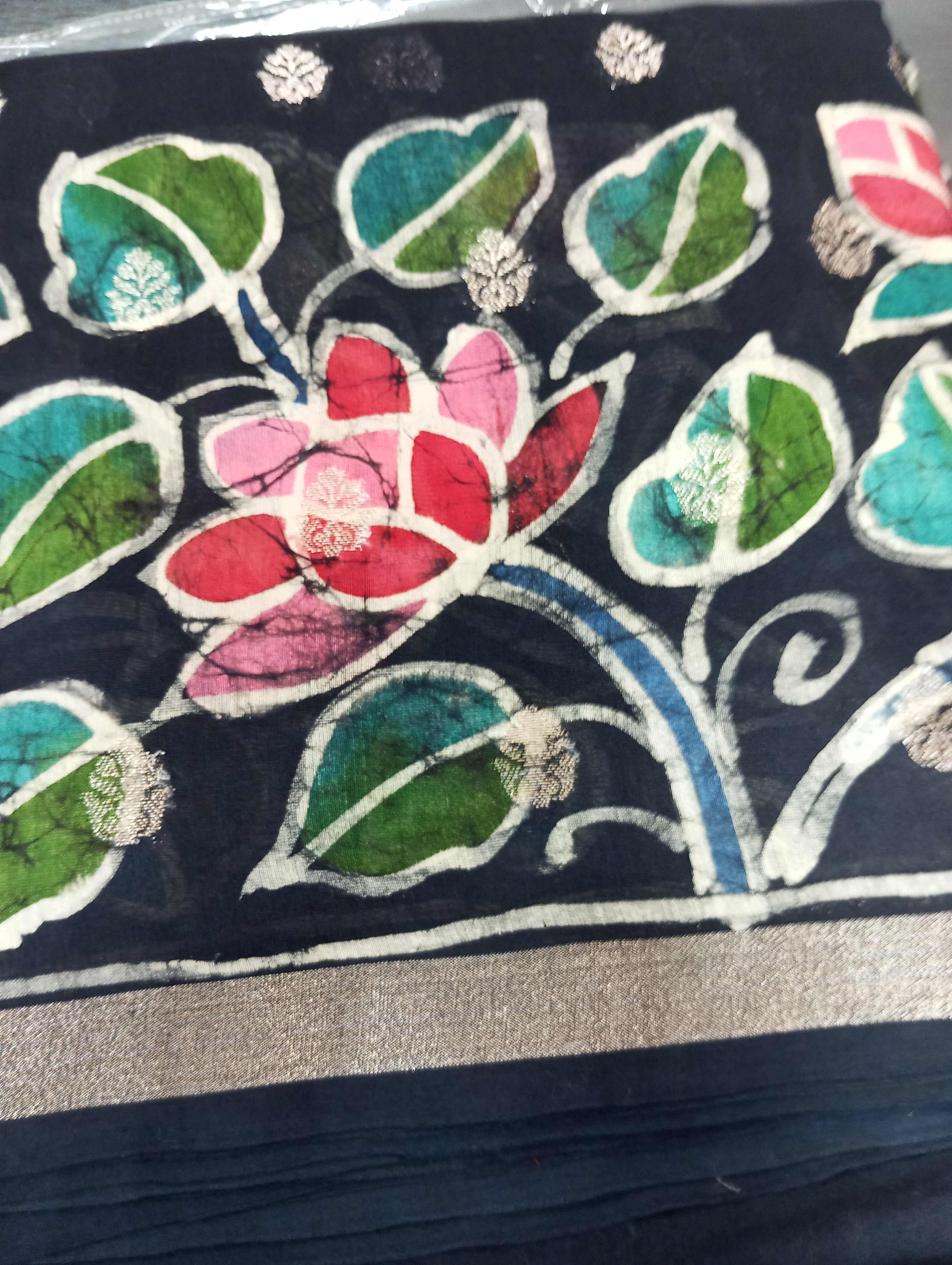 • Style: Banarasi Weaving Pattern, Batik Floral Printed Pattern, Zari Border Detailing, Zig Zag Pallu