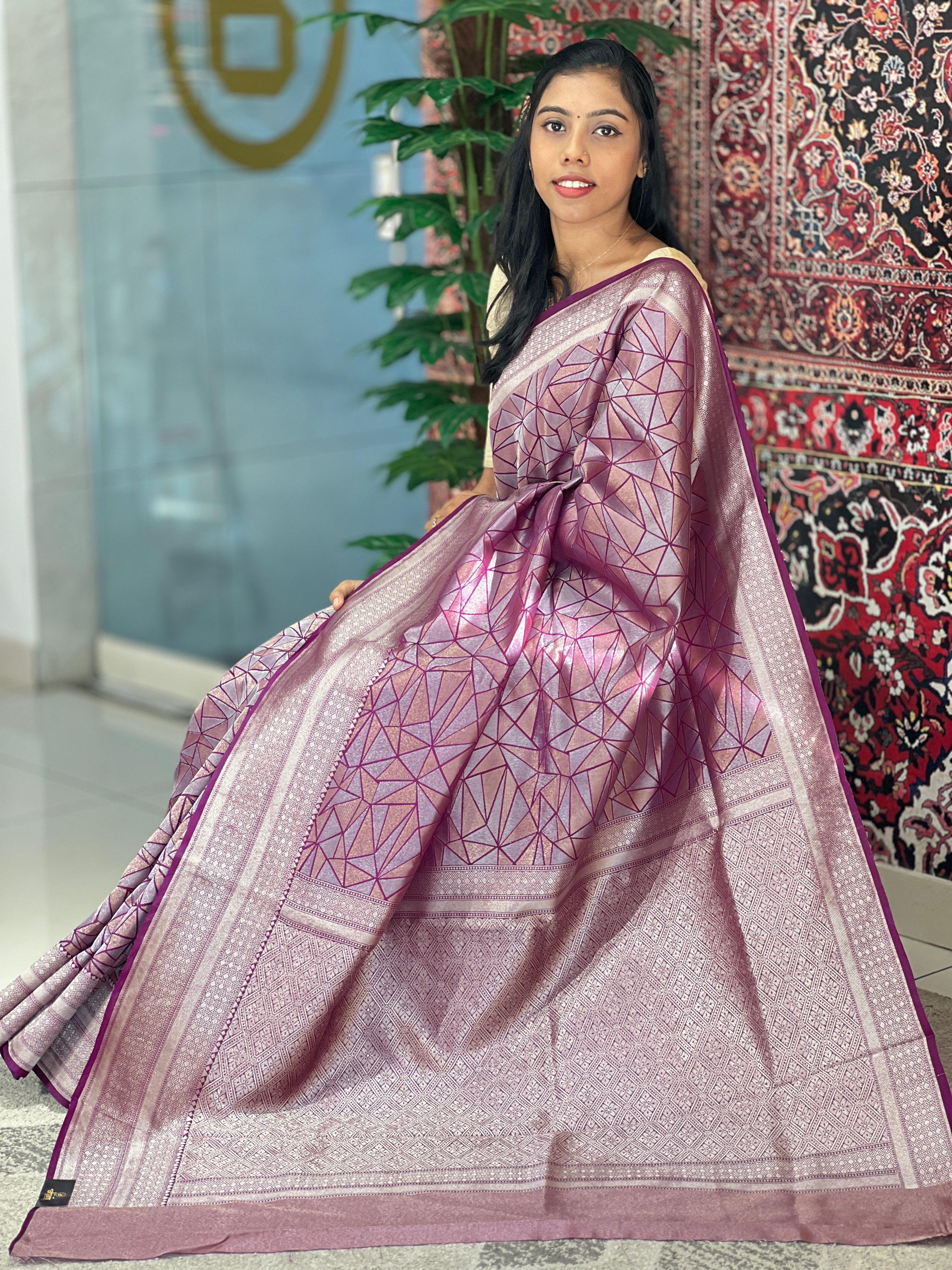 - Style: Banarasi Woven, Silver & Golden Zari Woven, Diamond Patterned Pallu, Geometric Pattern