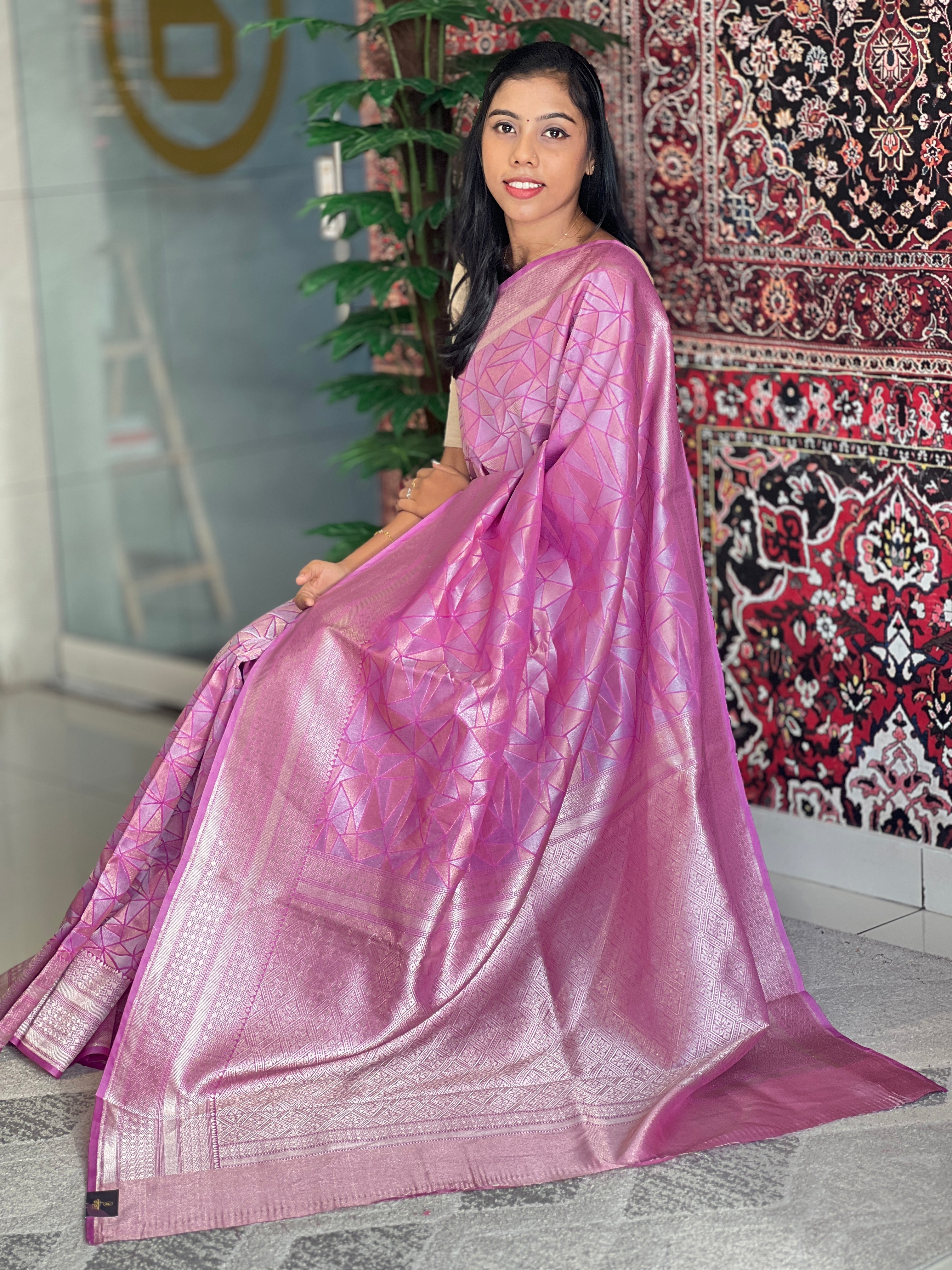 • Style: Banarasi Woven, Silver & Golden Zari Woven, Diamond Patterned Pallu, Geometric Pattern