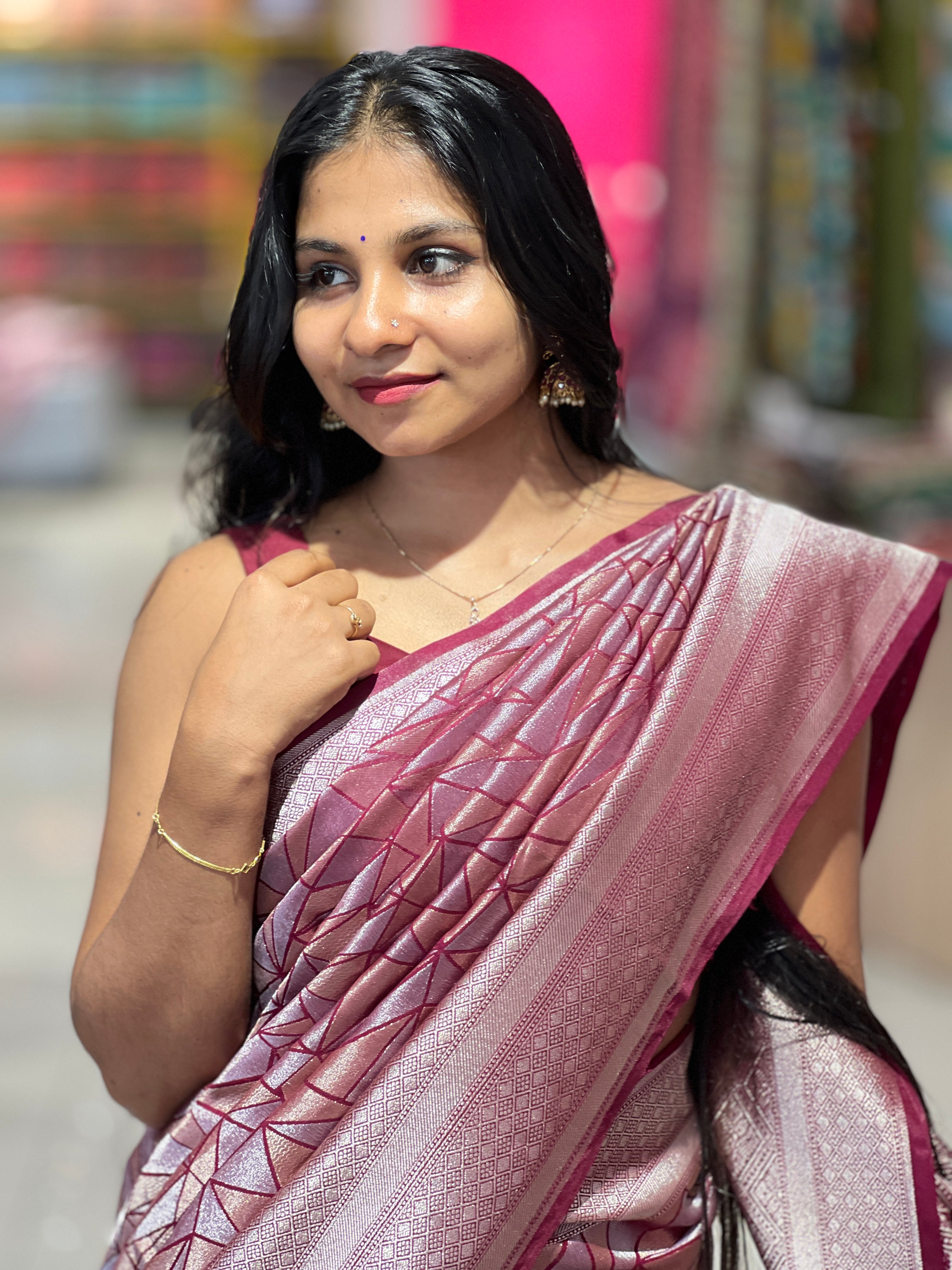 • Style: Banarasi Woven, Silver & Golden Zari Woven, Diamond Patterned Pallu, Geometric Pattern