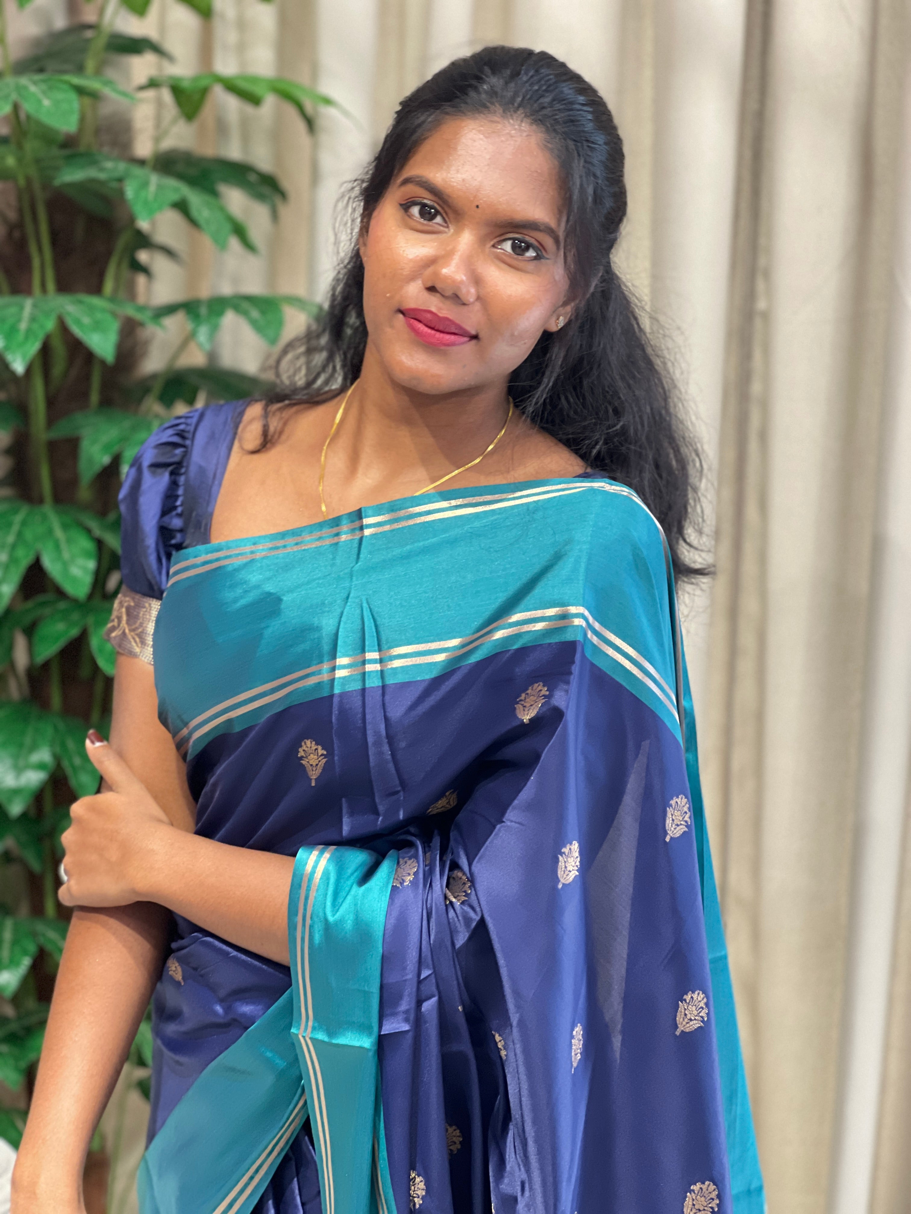 - Style: Banarasi Weaving, Scattered Buttas, Brocade Pallu, Contrast Border