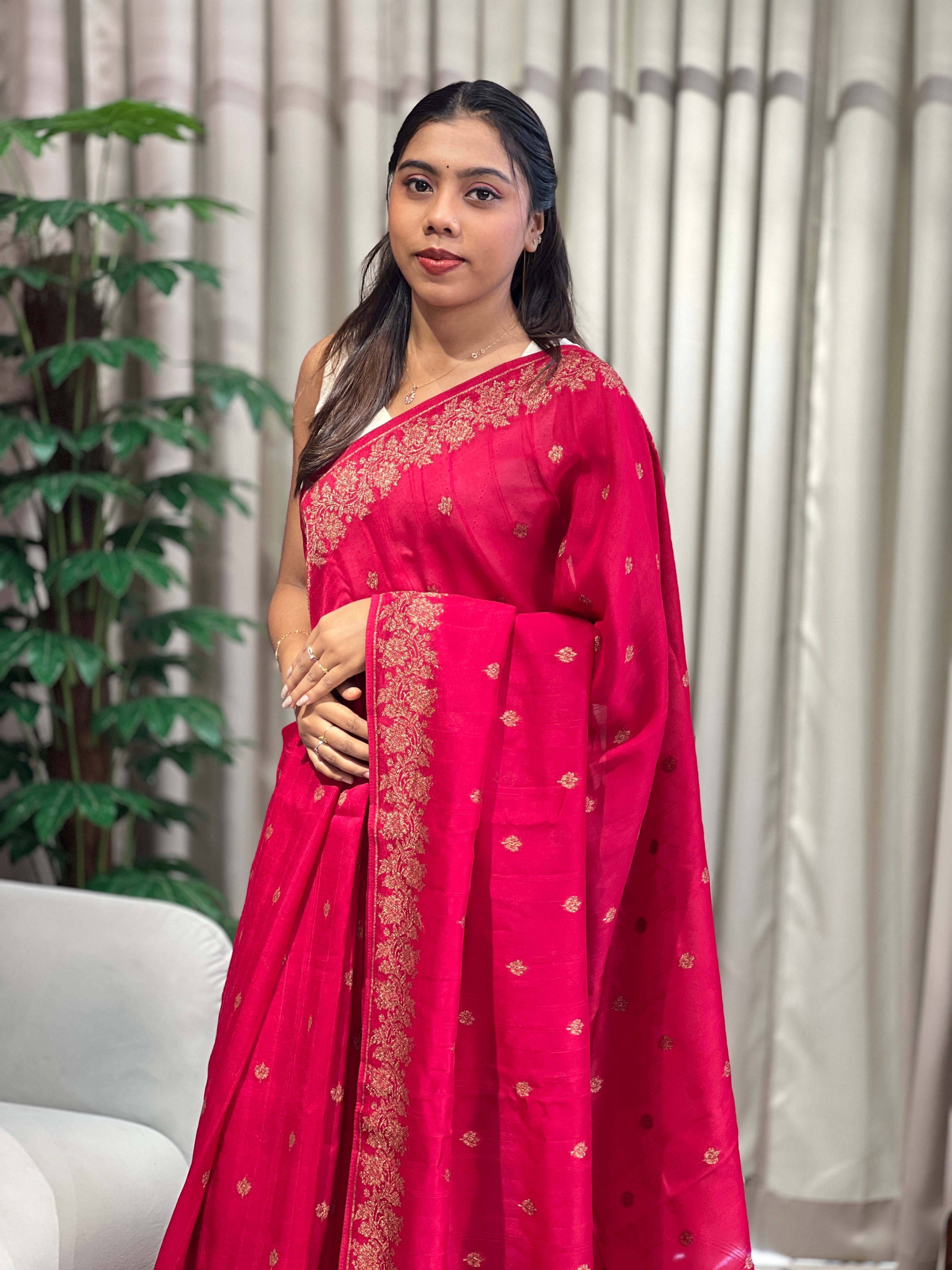• Style: Banarasi Weaving, Scattered Buttas, Brocade Pallu, Border Detailing