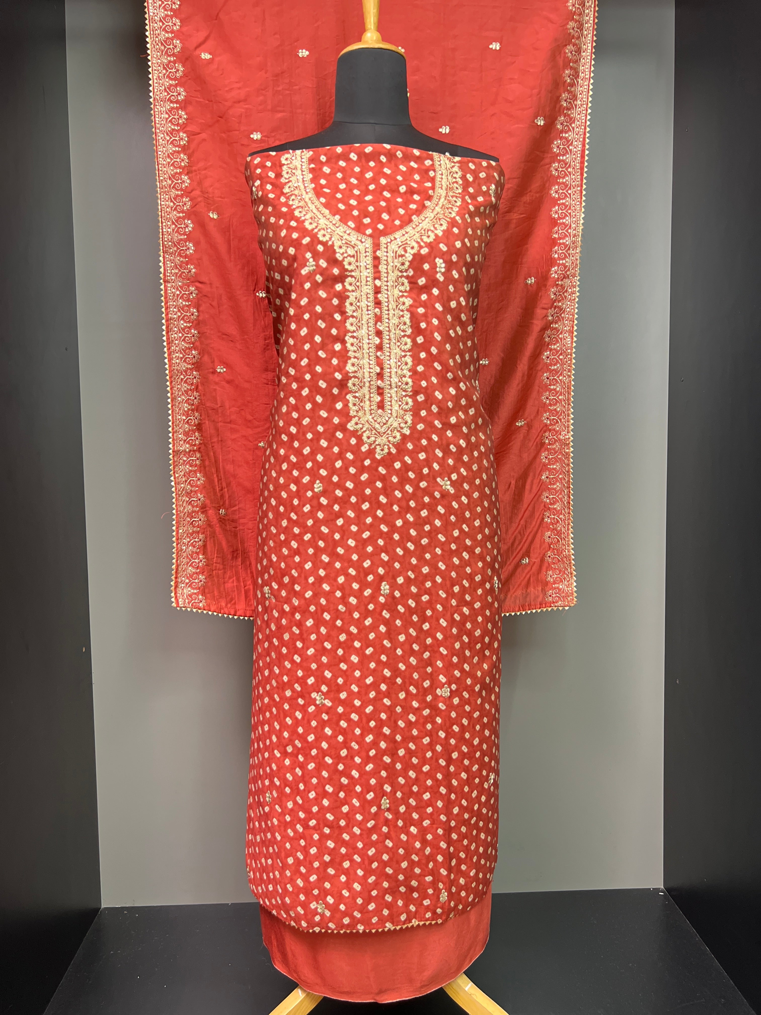 - Style: Bandhani Printed With Foil Paint Highlight, Zari With Sequence Embroidered Yoke Portion, Scattered Zari Buta Detailing