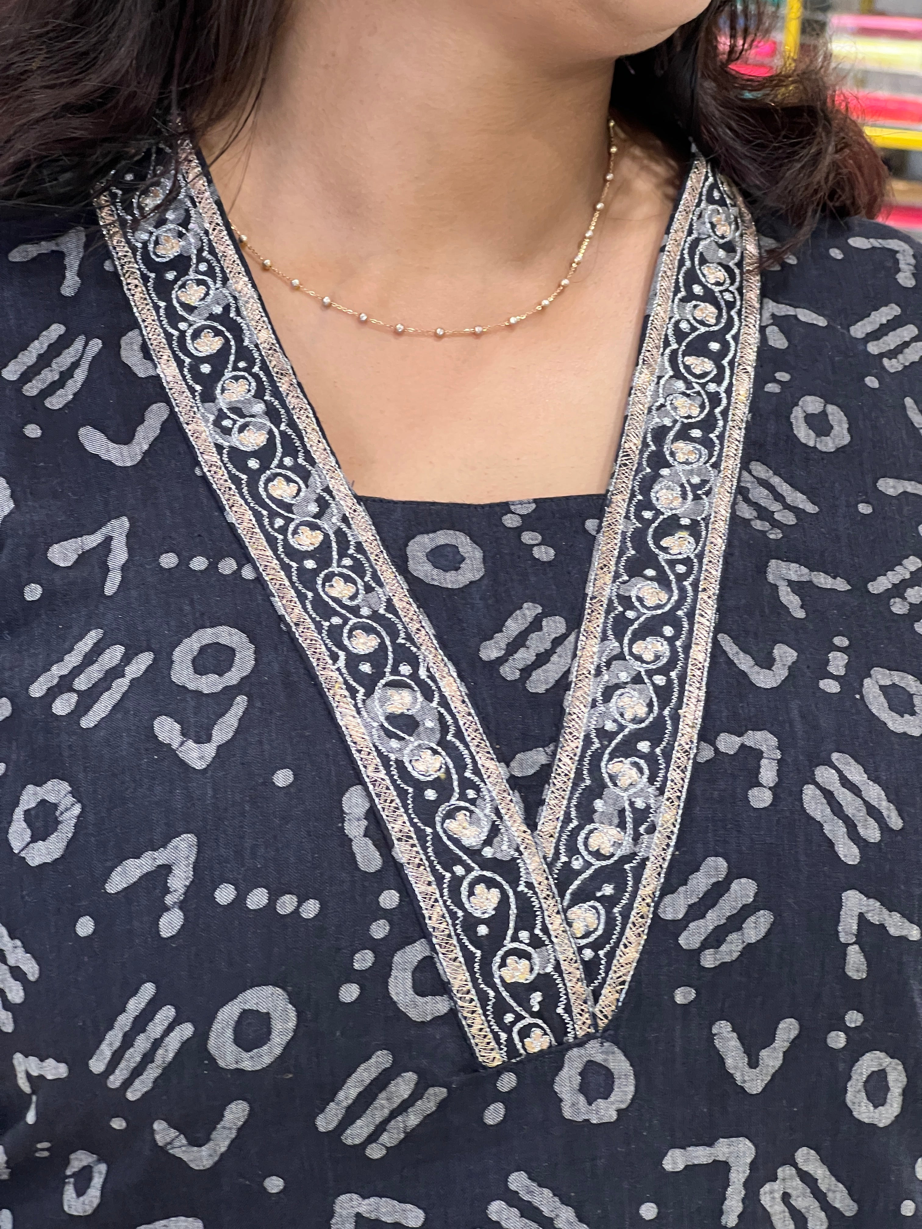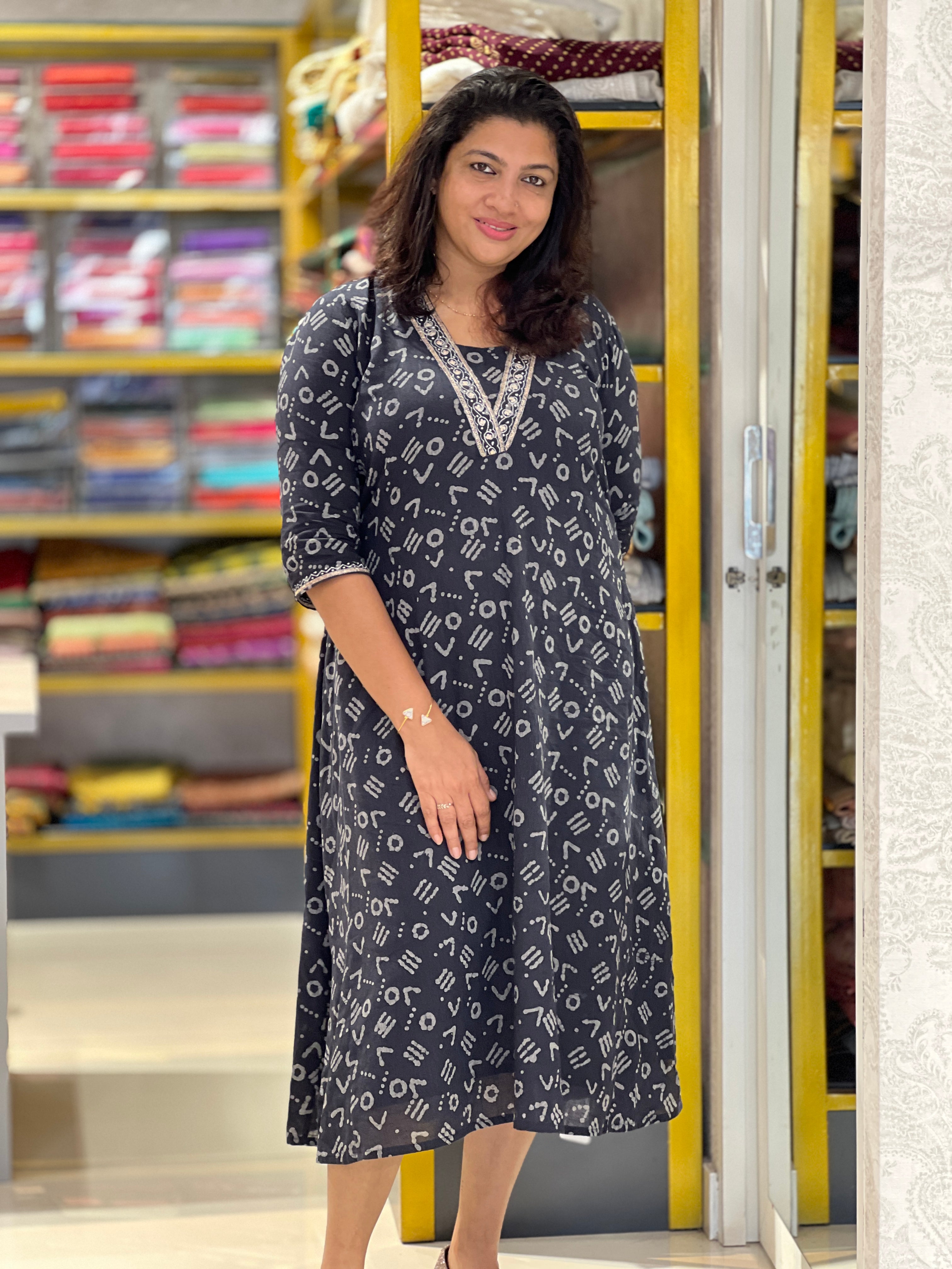 - Style- Batik Printed, Geometric Pattern, Machine Embroidery Sleeves & Neck Portion, A-line Pattern