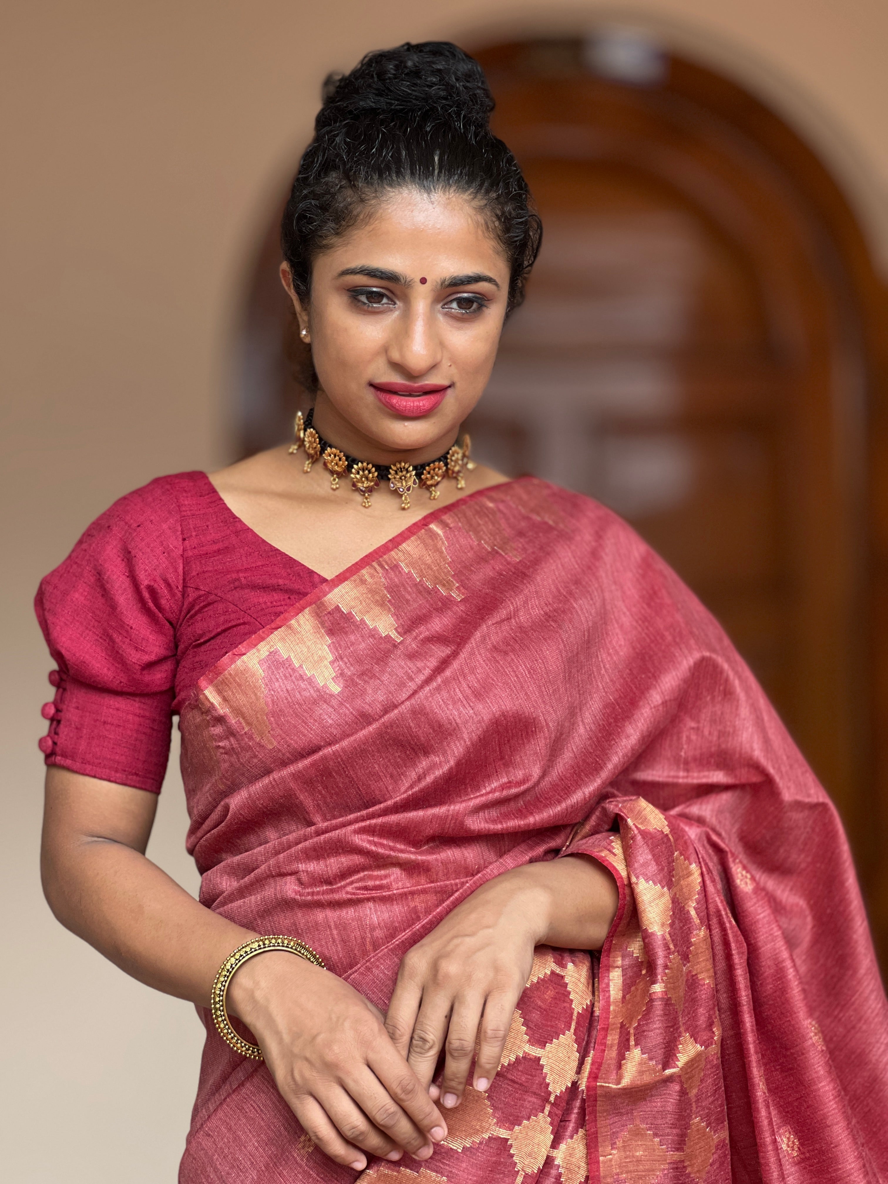 Unique collection of bhagalpuri linen sarees with golden zari weave finish thin upper & wide lower border design, small dots weave pattern in lower body portion. The saree is paired with a matching same colour pattern blouse piece.