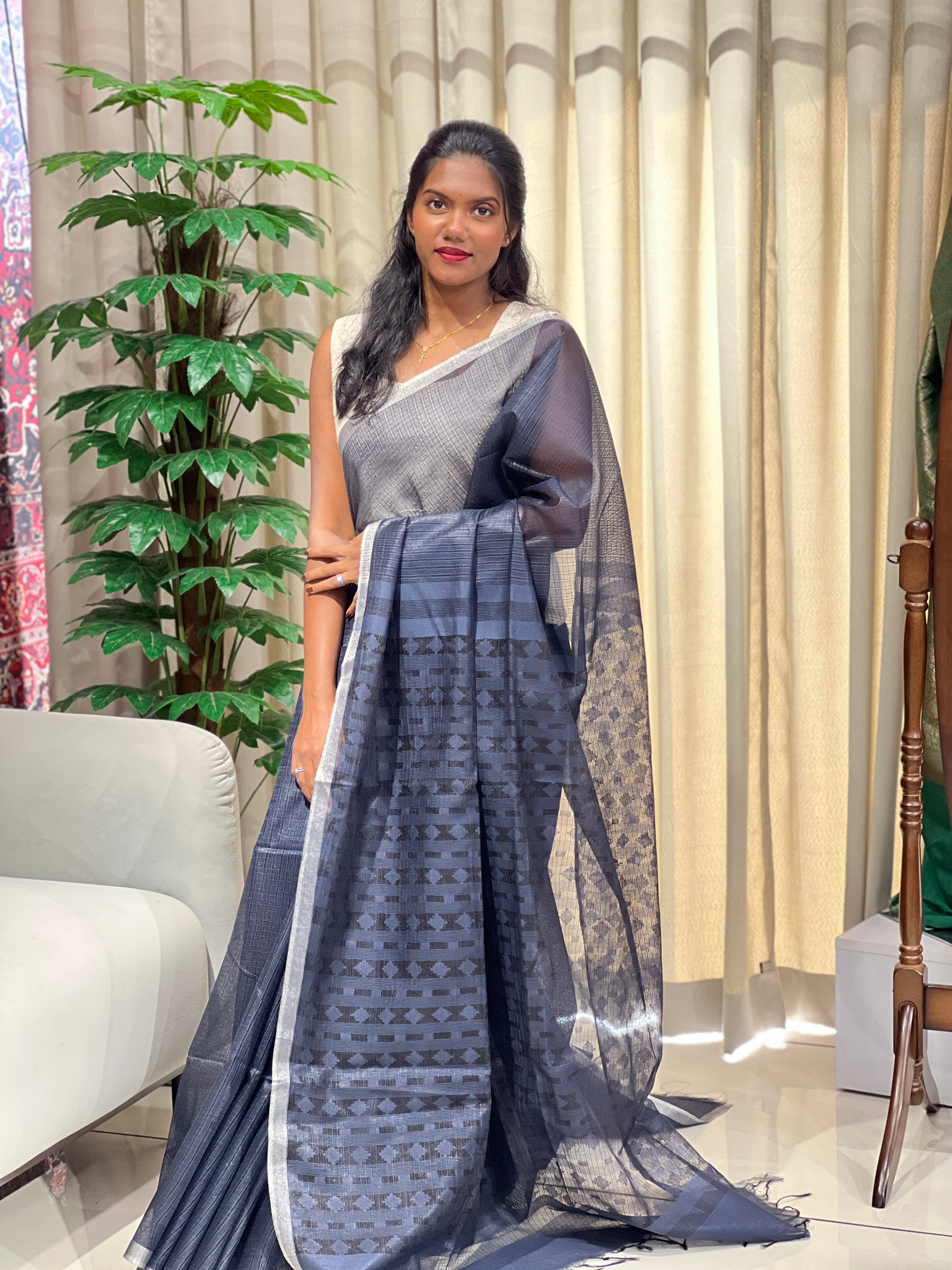 - Style: Bhagalpuri Woven, Jamdani Weaved Pallu, Silver Zari Border Detailing, Tassels Attached