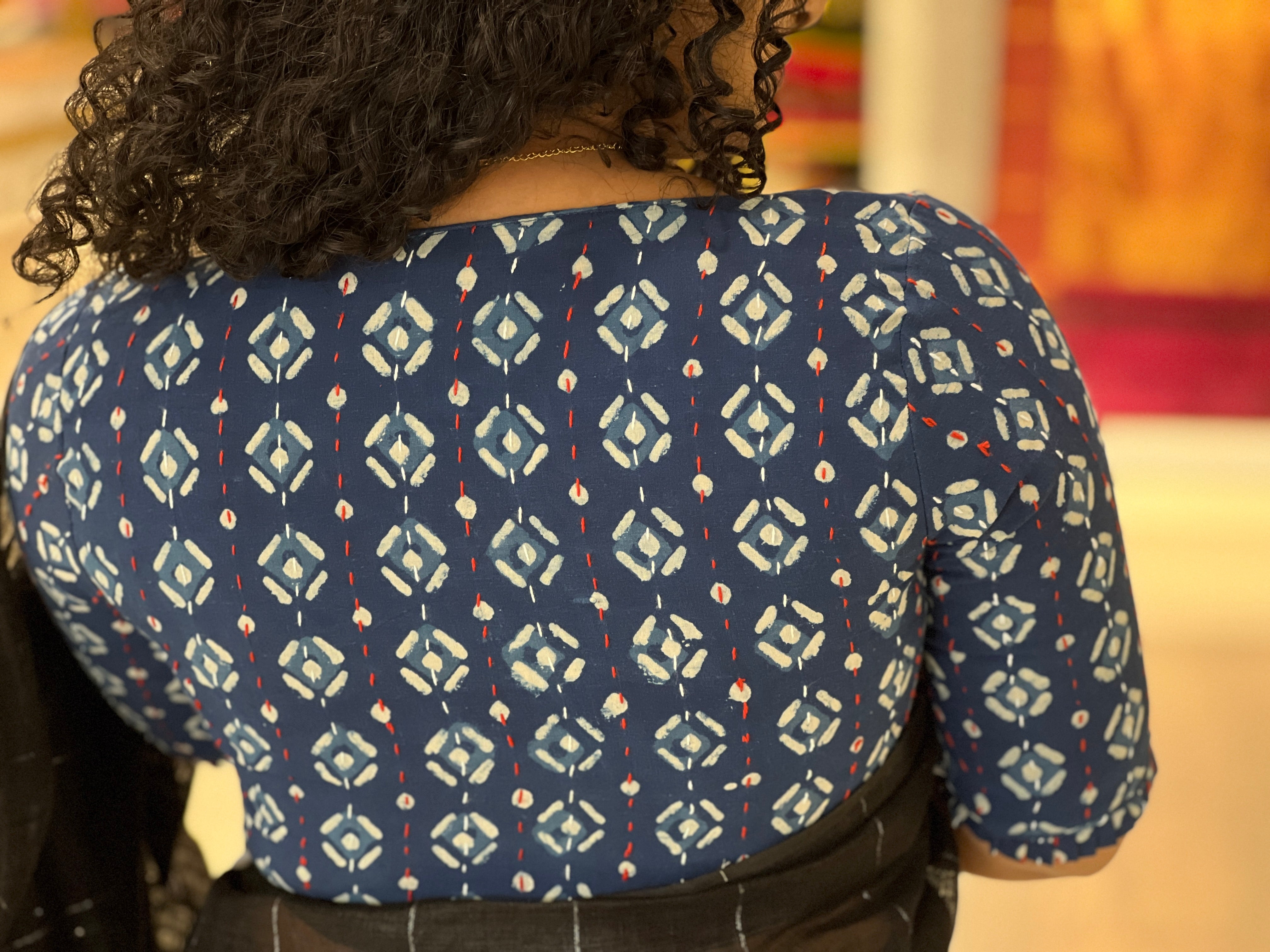 - Style: Block Print With Kantha Highlight, Back High Neck, Gathering Detailed Sleeves Princess Cut, Padded, Cotton Lining