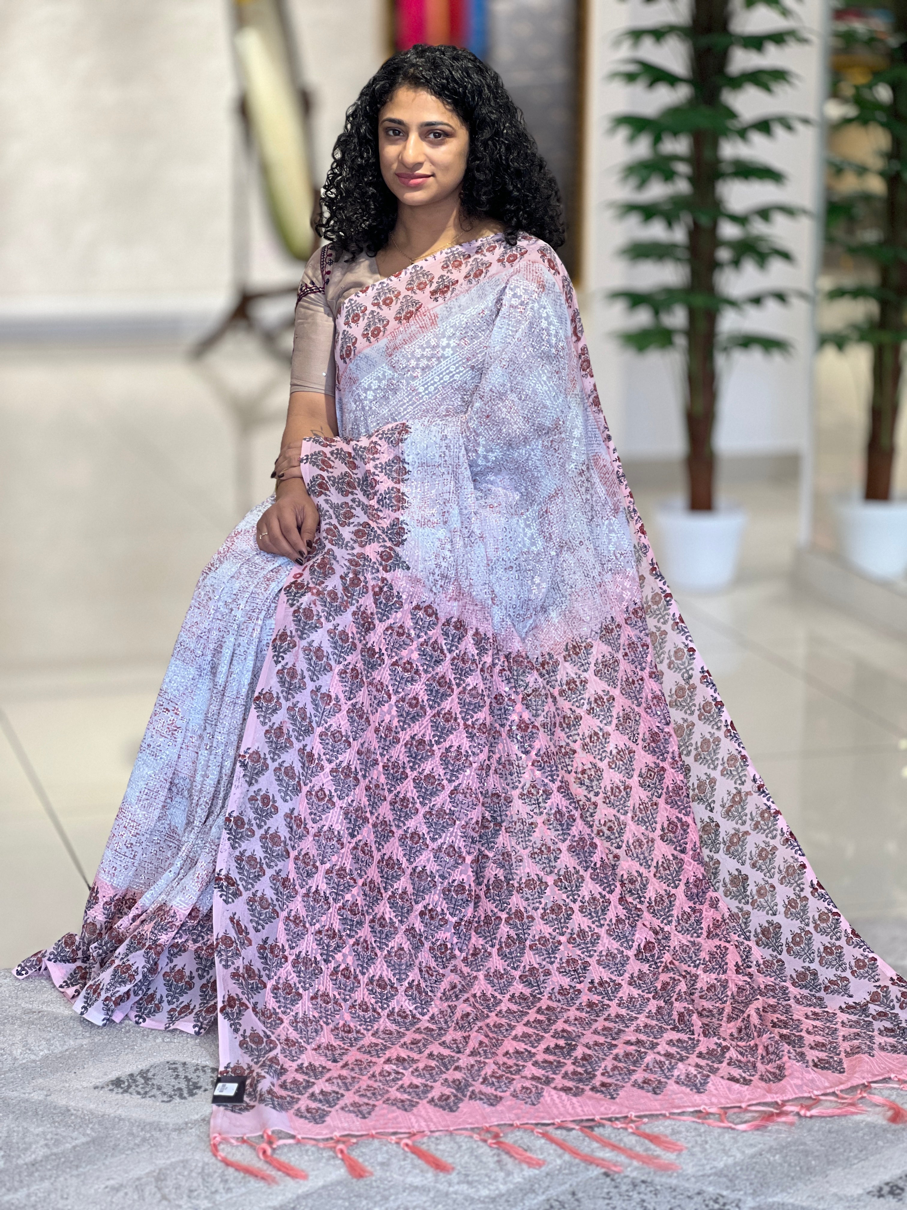 Block Printed Border Detailed Semi Georgette Saree | PF982