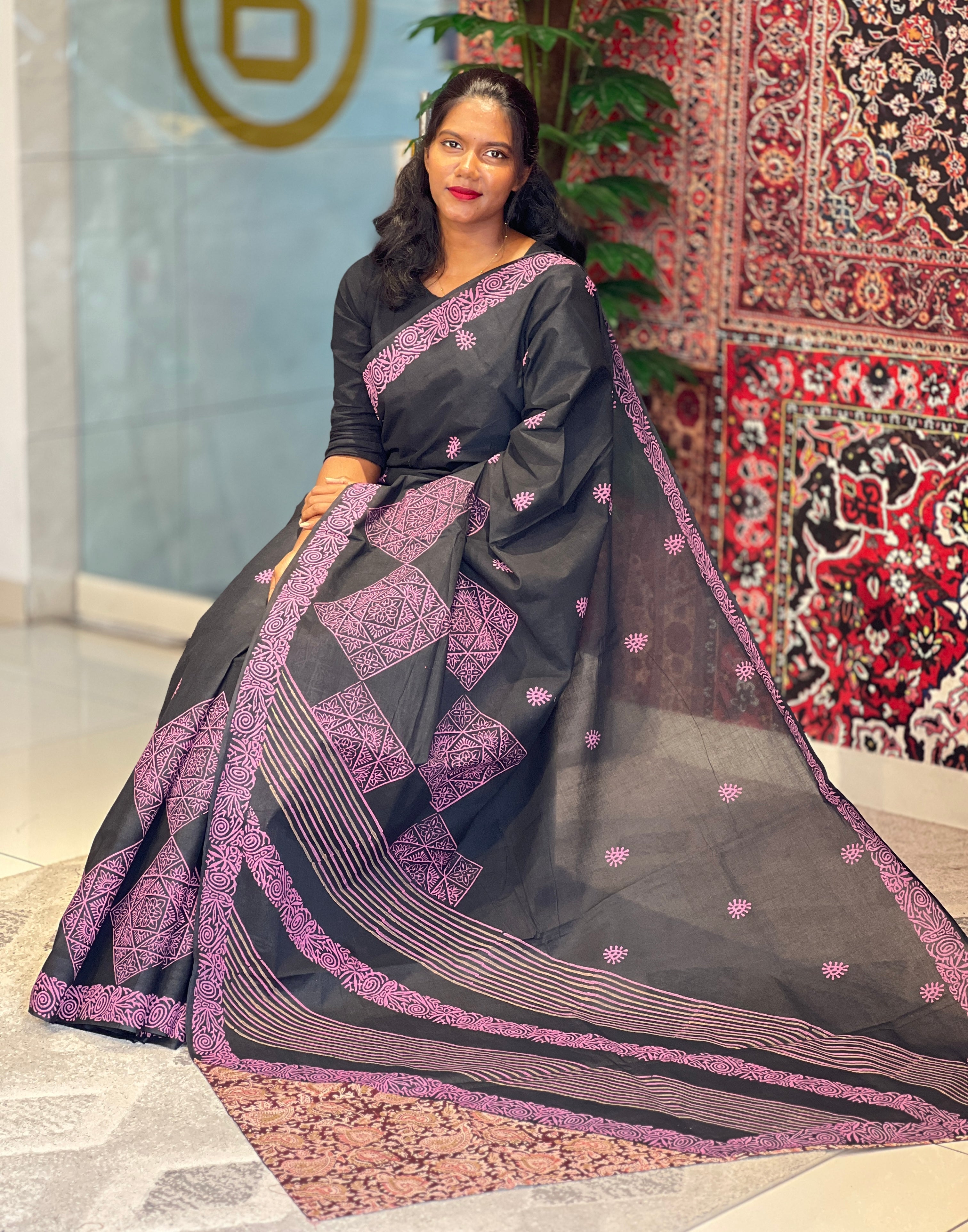 - Style: Block Printed, Stripes Pattern on Pallu with Patch Detailing, Scattered Floral Motif, Border Detailing