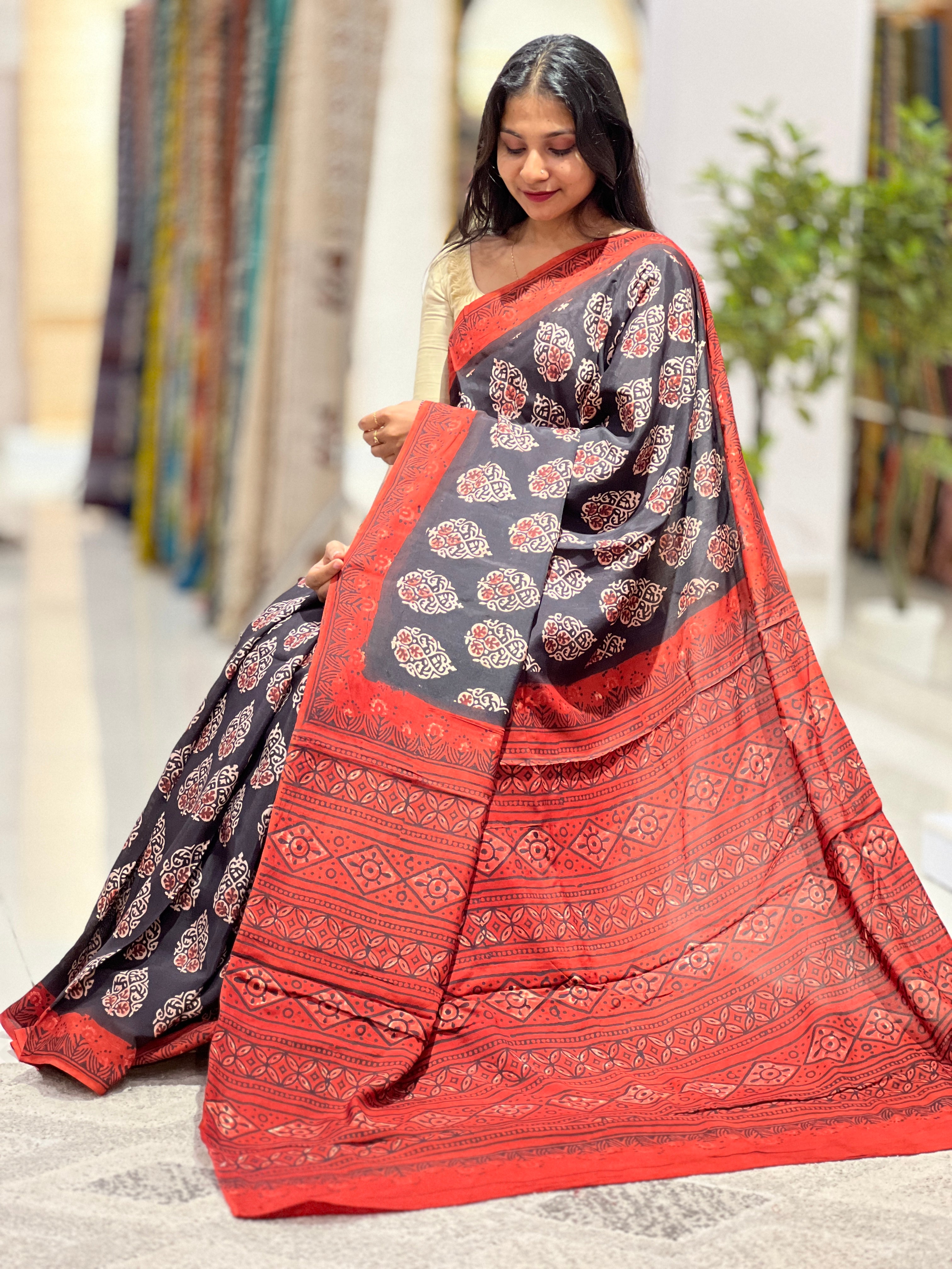 - Style: Block Printed, Contrast Borders & Pallu