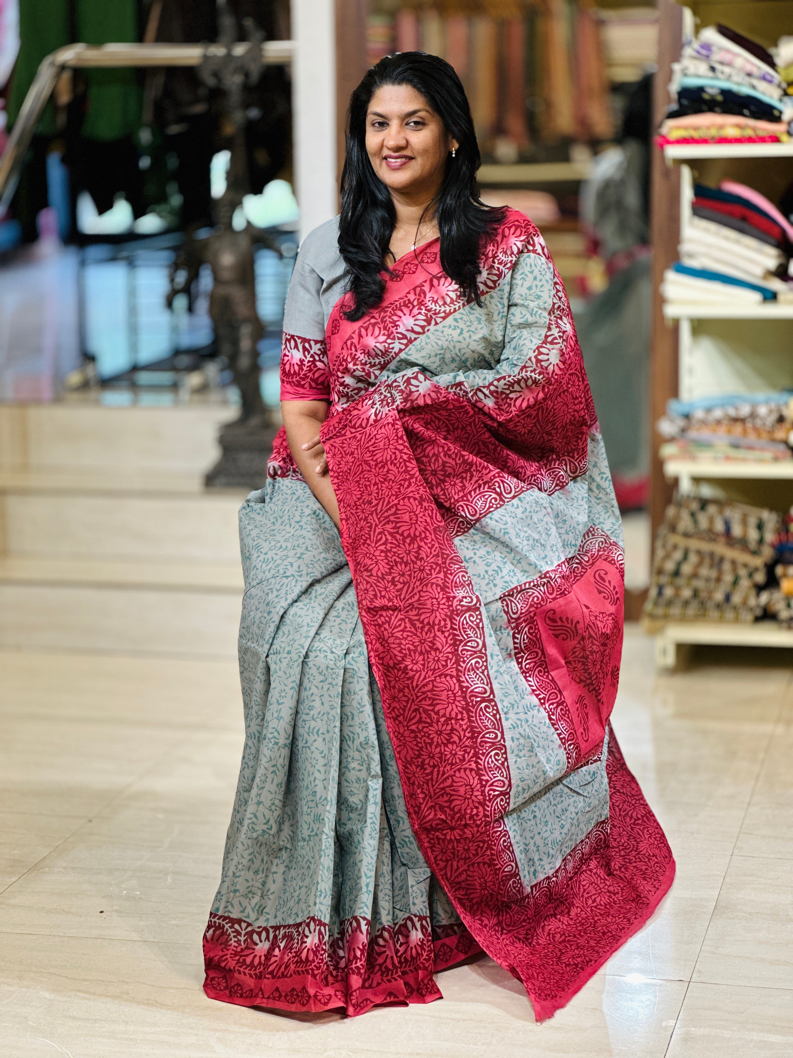 - Style: Block Printed, Contrast Pallu & Borders, Floral & Paisley Pattern