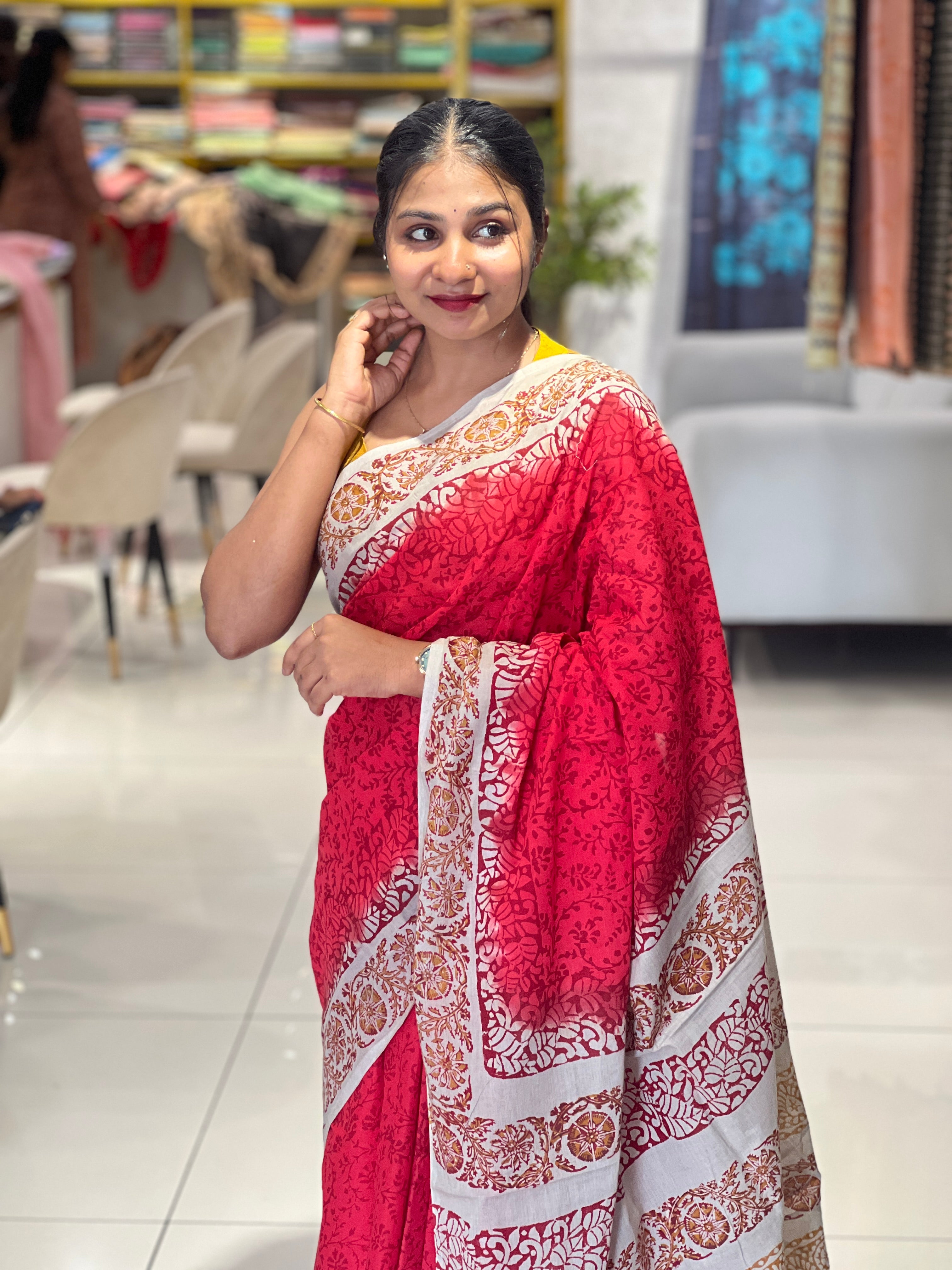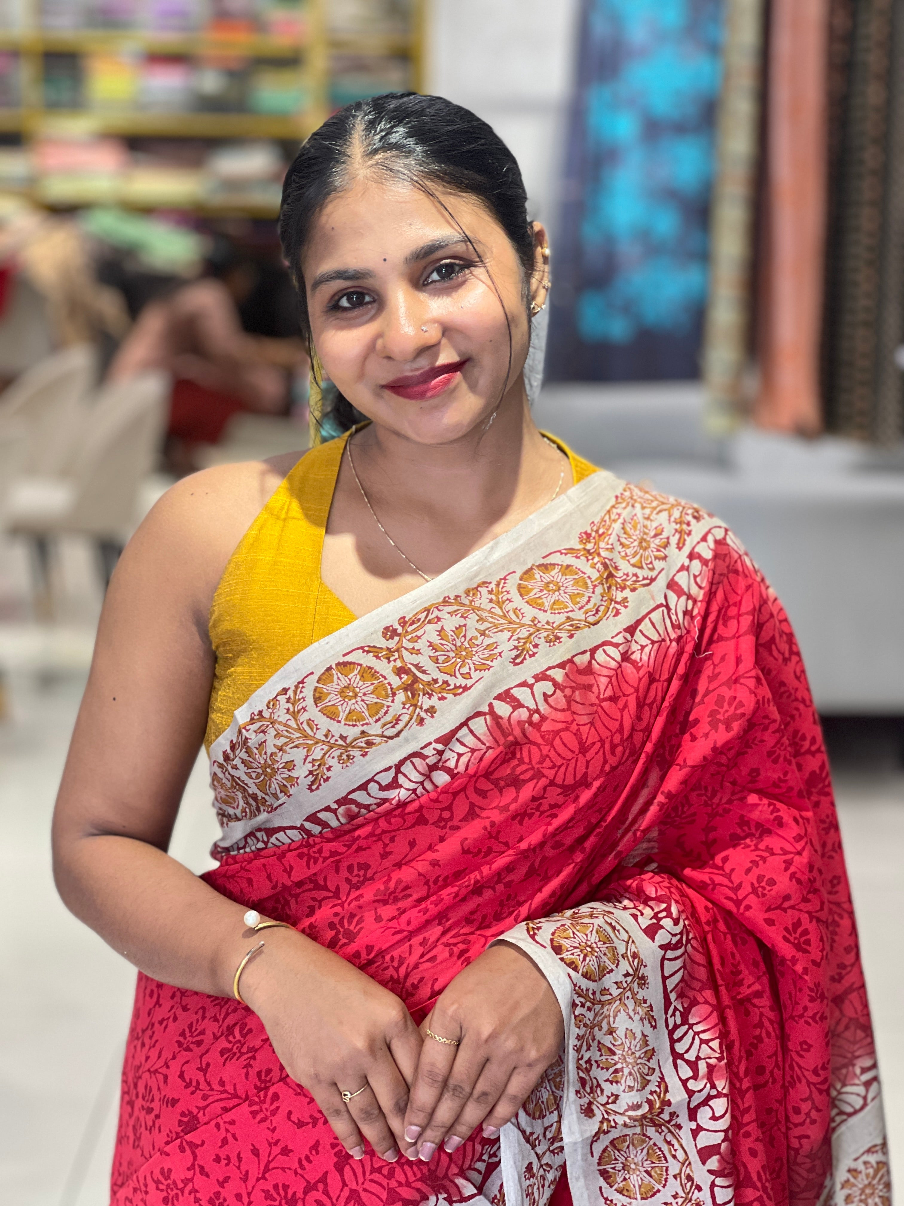 - Style: Hand Block Printed, Printed Pallu, Contrast Border Detailing