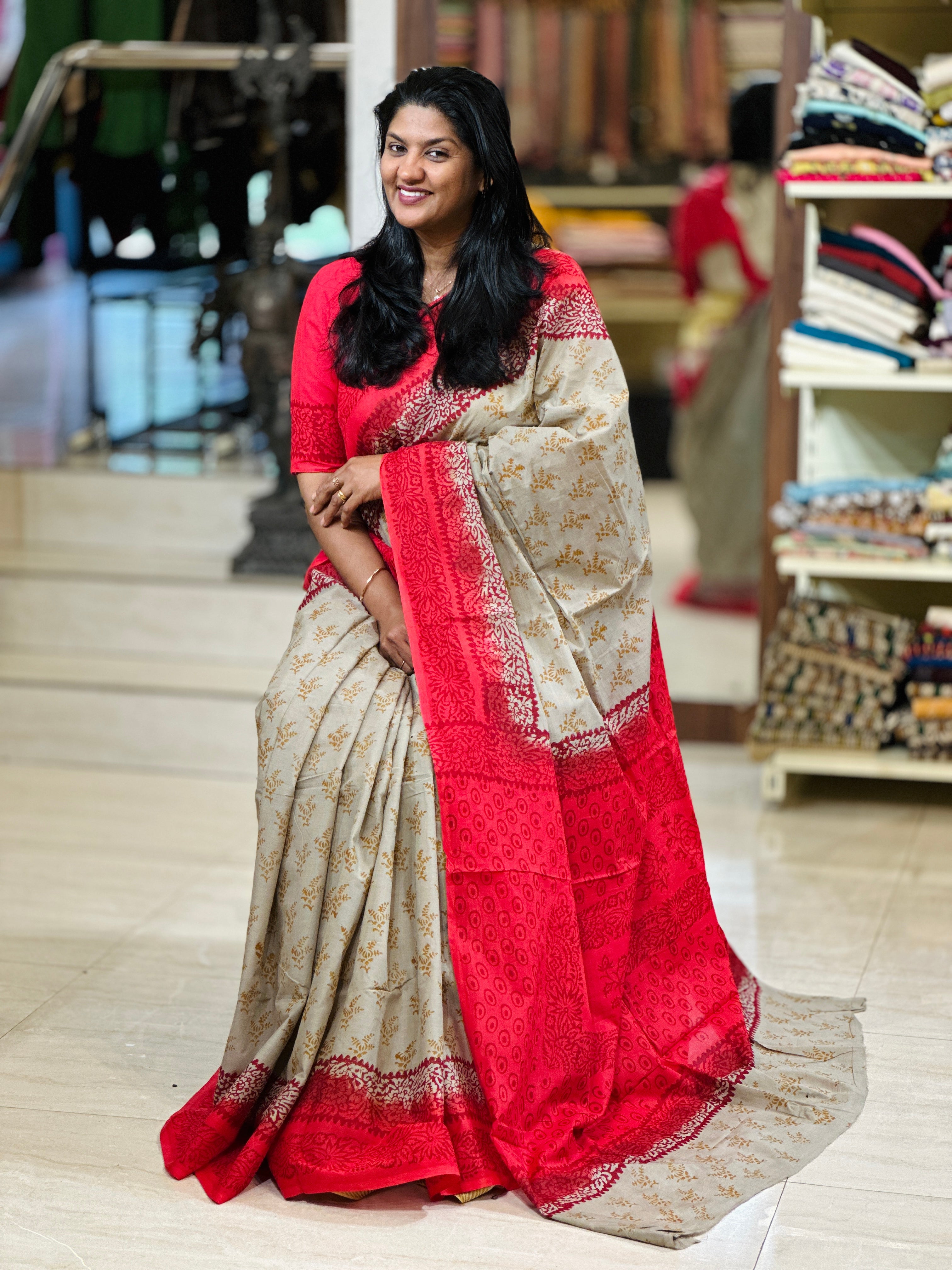 - Style: Block Printed, Contrast Pallu & Borders, Floral Pattern