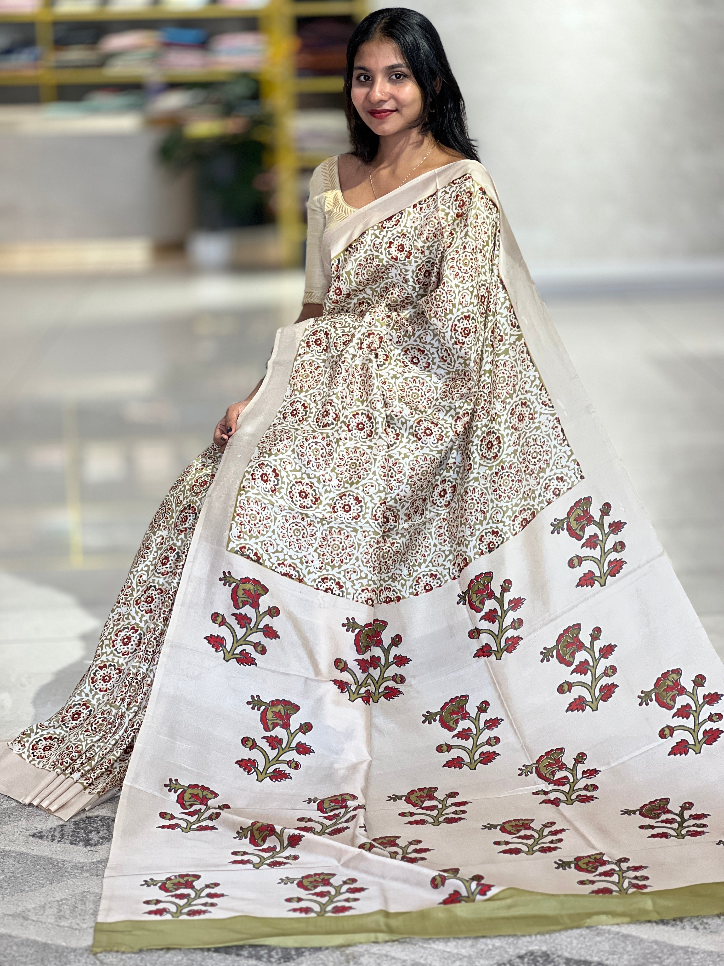 • Style: Block Printed, Solid Borders, Floral Patterned Pallu