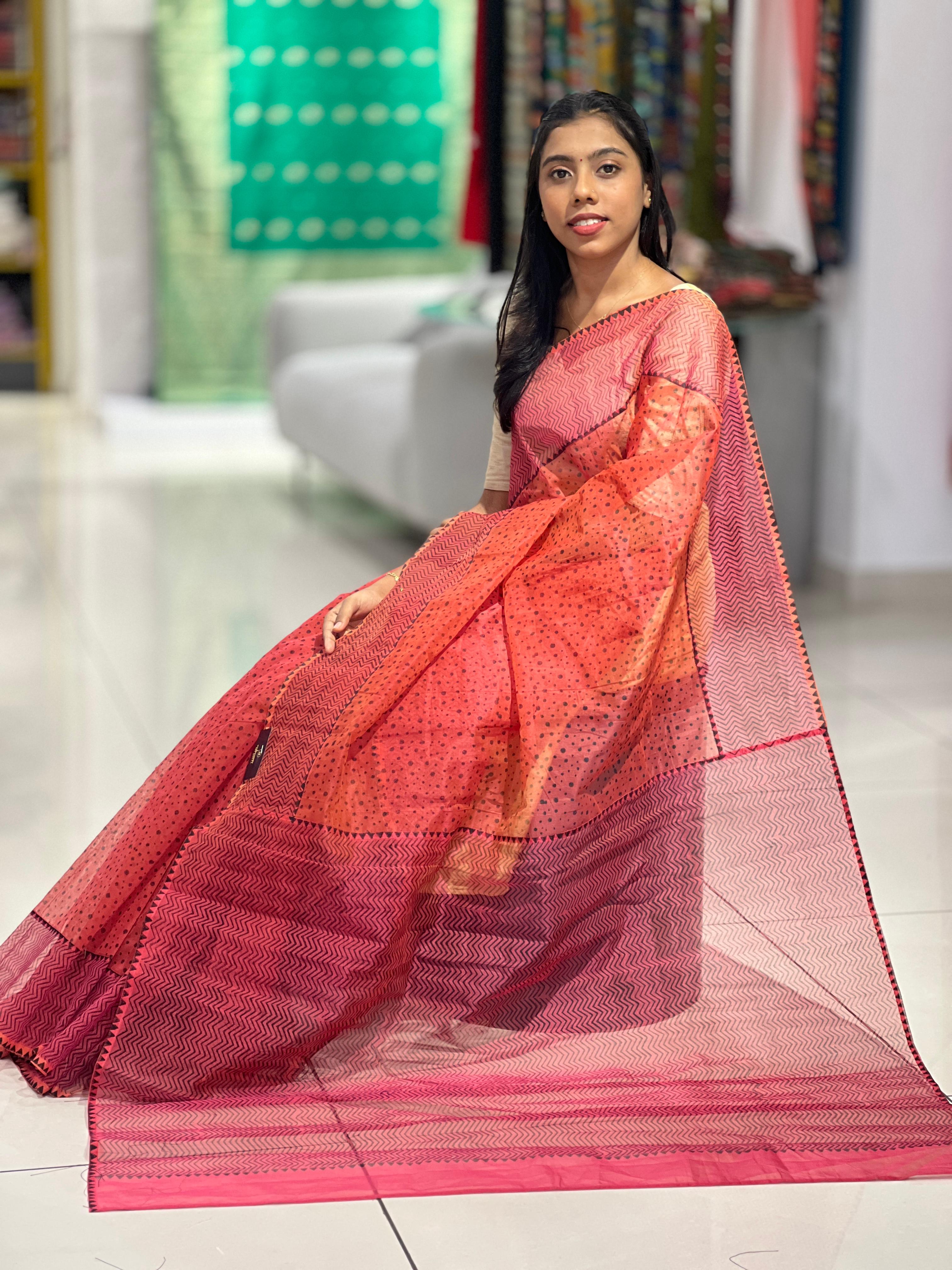 - Style: Block Printed, Polka Dot Pattern, Zigzag Patterned Pallu & Border
