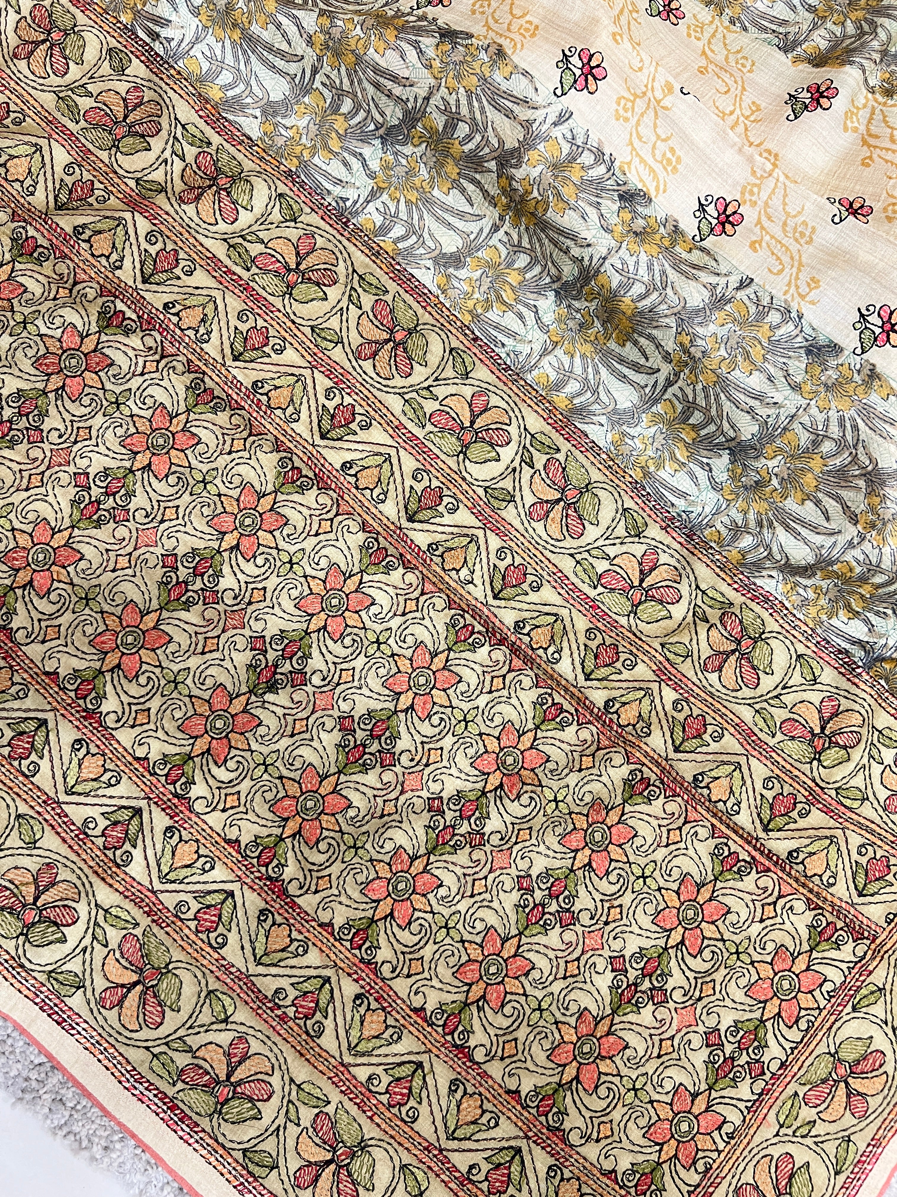 - Style: Block Printed, Scattered Floral Pattern, Embroidered Pallu & Borders, Flat Facing Finished Edges