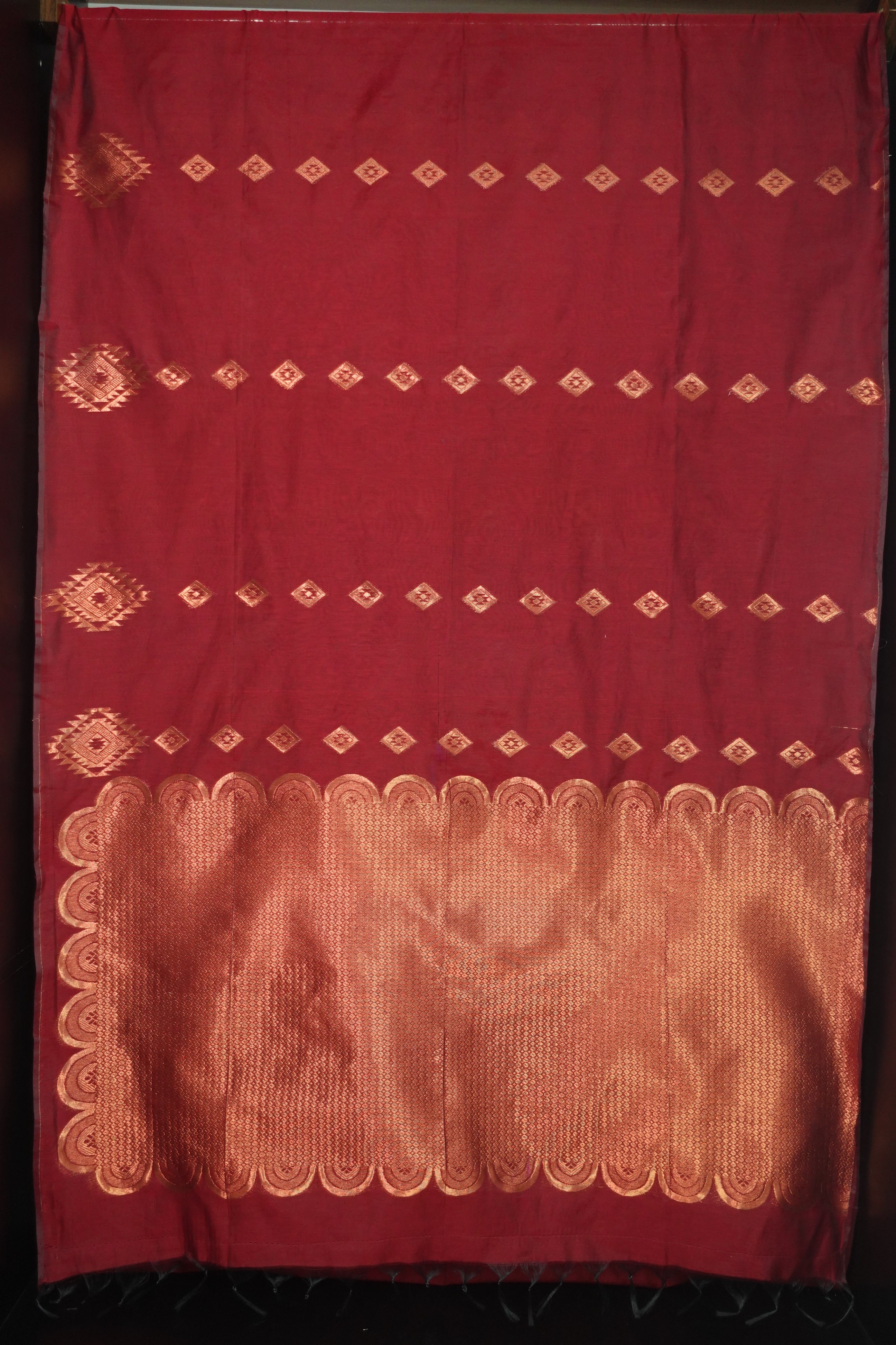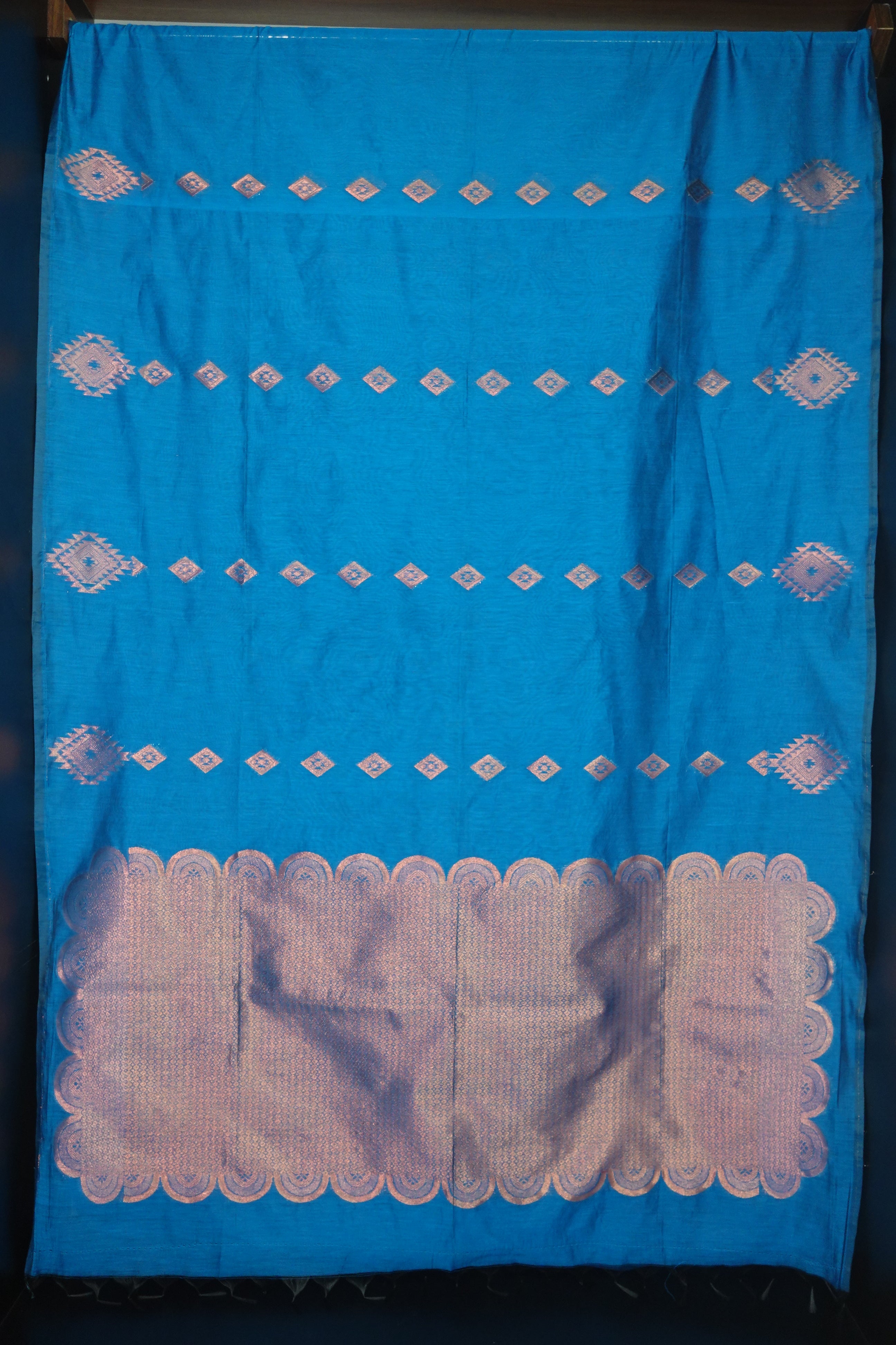 Budget-friendly cotton silk finished sarees without borders. These sarees featured copper zari weaven motifs. Rich pallu with arc designs in geometrical patterns motifs and large motifs in border side and a plain running blouse piece
