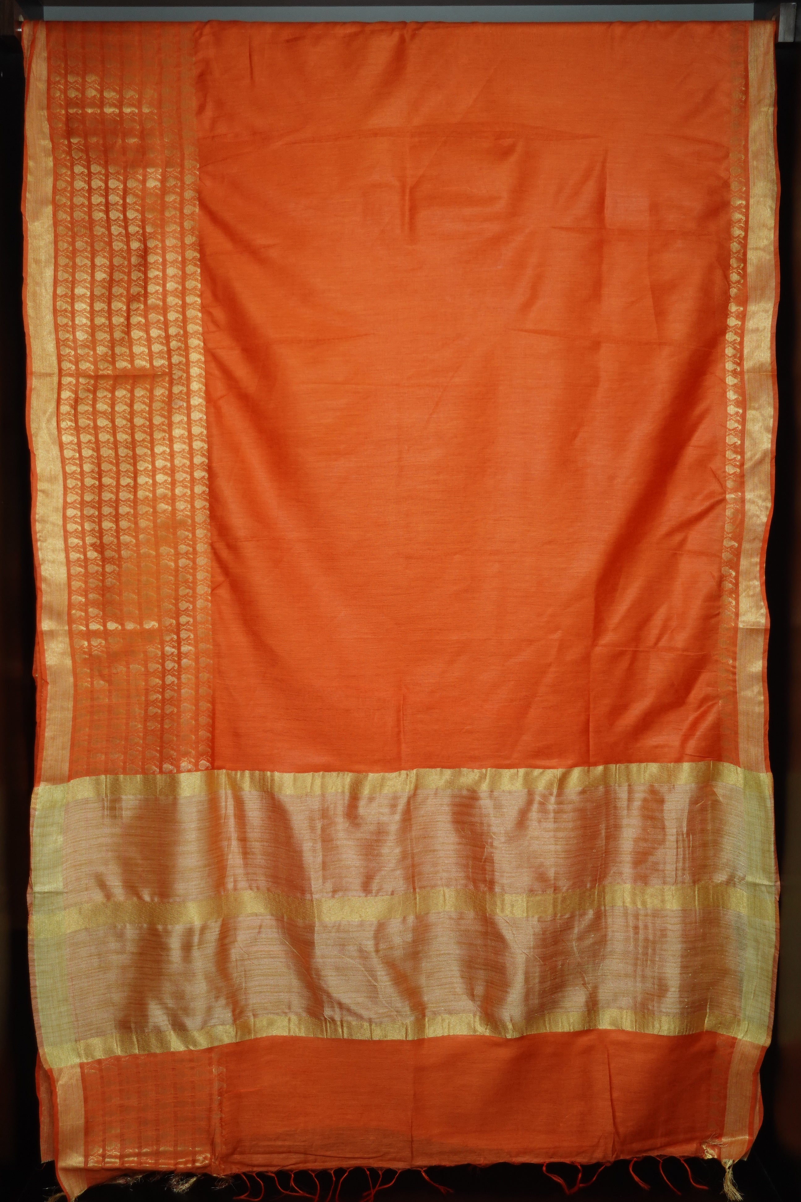 An elegant collection of staple cotton sarees with a traditional look. These sarees comes with lower broad border that emphasizes weaved paisley design motifs, also a simple upper border. The saree has a simple golden pallu design and same color running blouse piece.