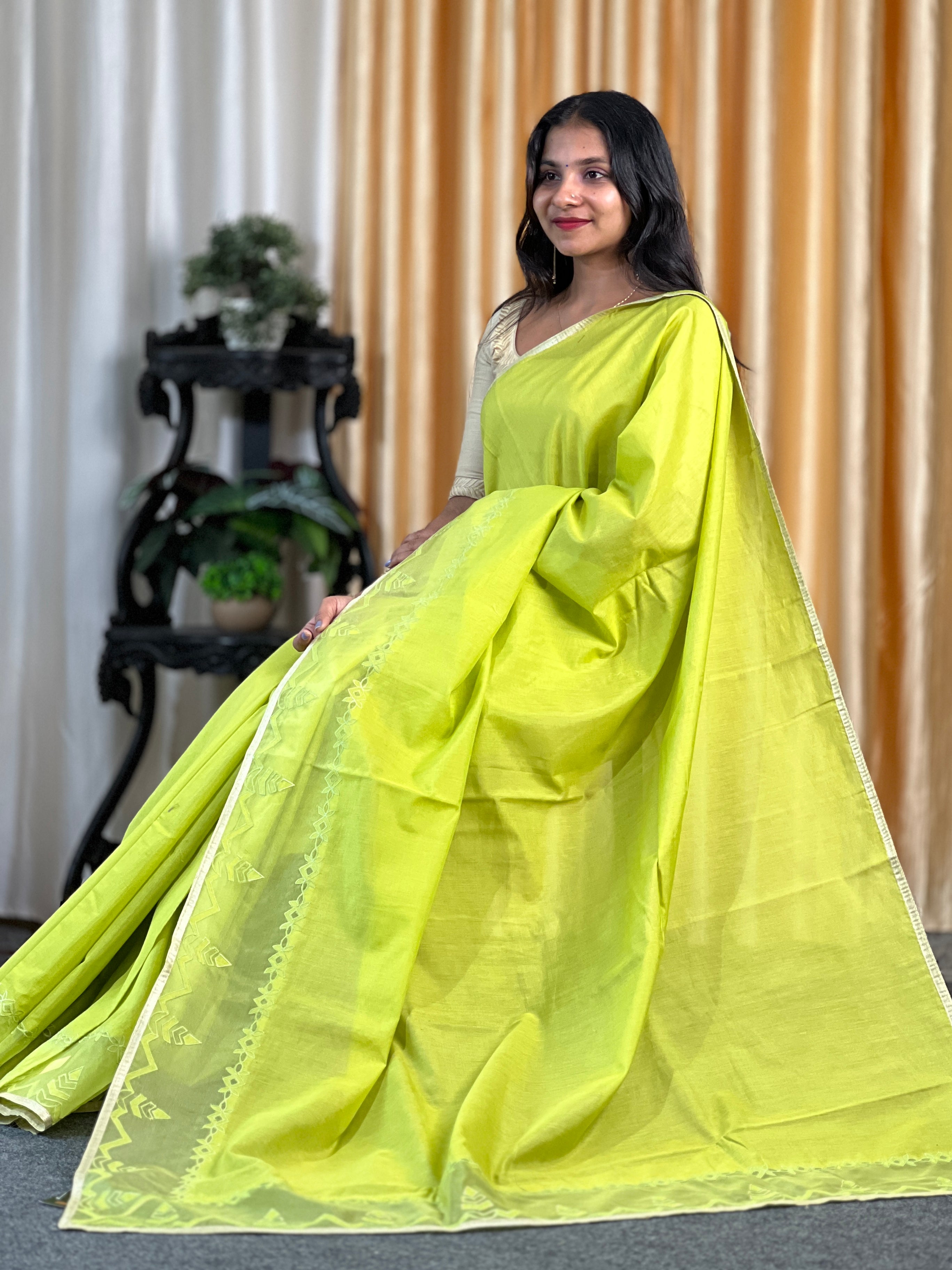- Style: Self Color Embroidery Detailing, Leaf Pattern With Zig Zag Detailing, Organza Fabric Patch Detailed Borders With Applique Work, Piping Finished Tissue Borders
