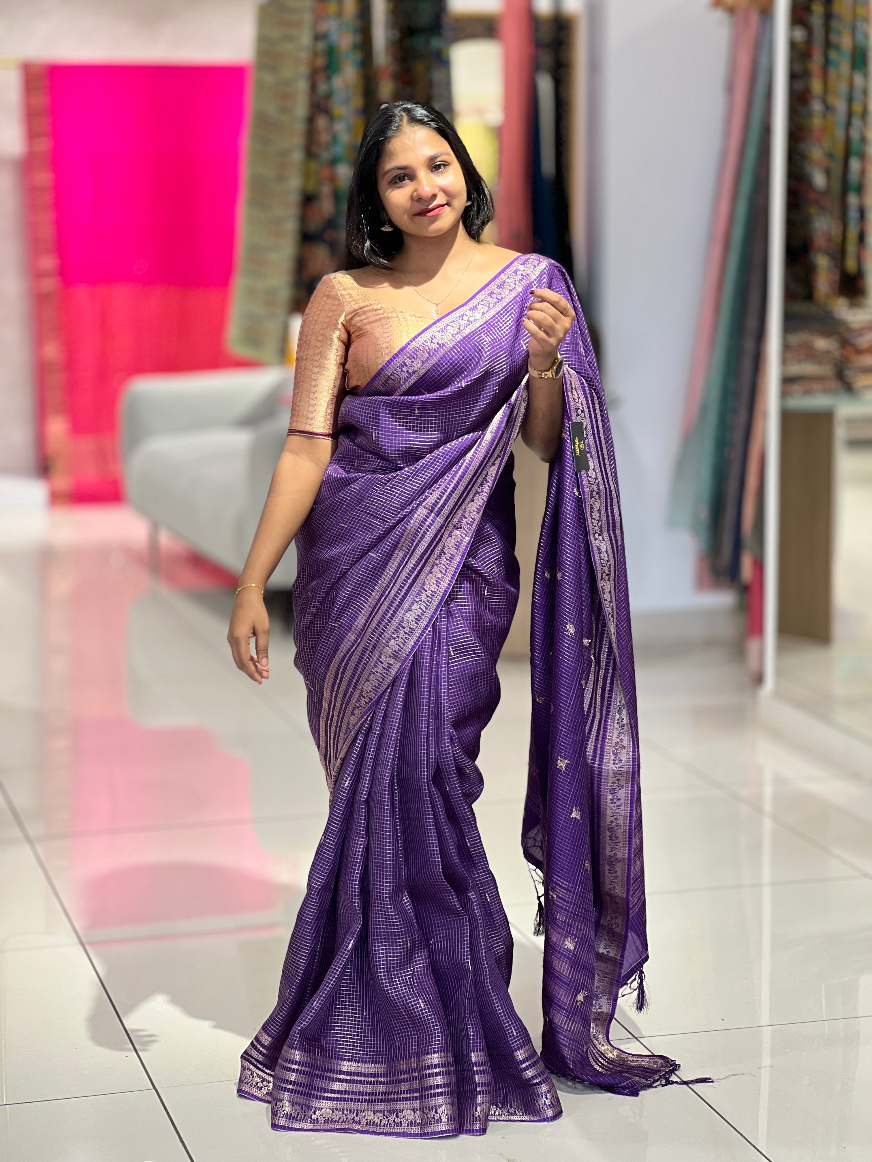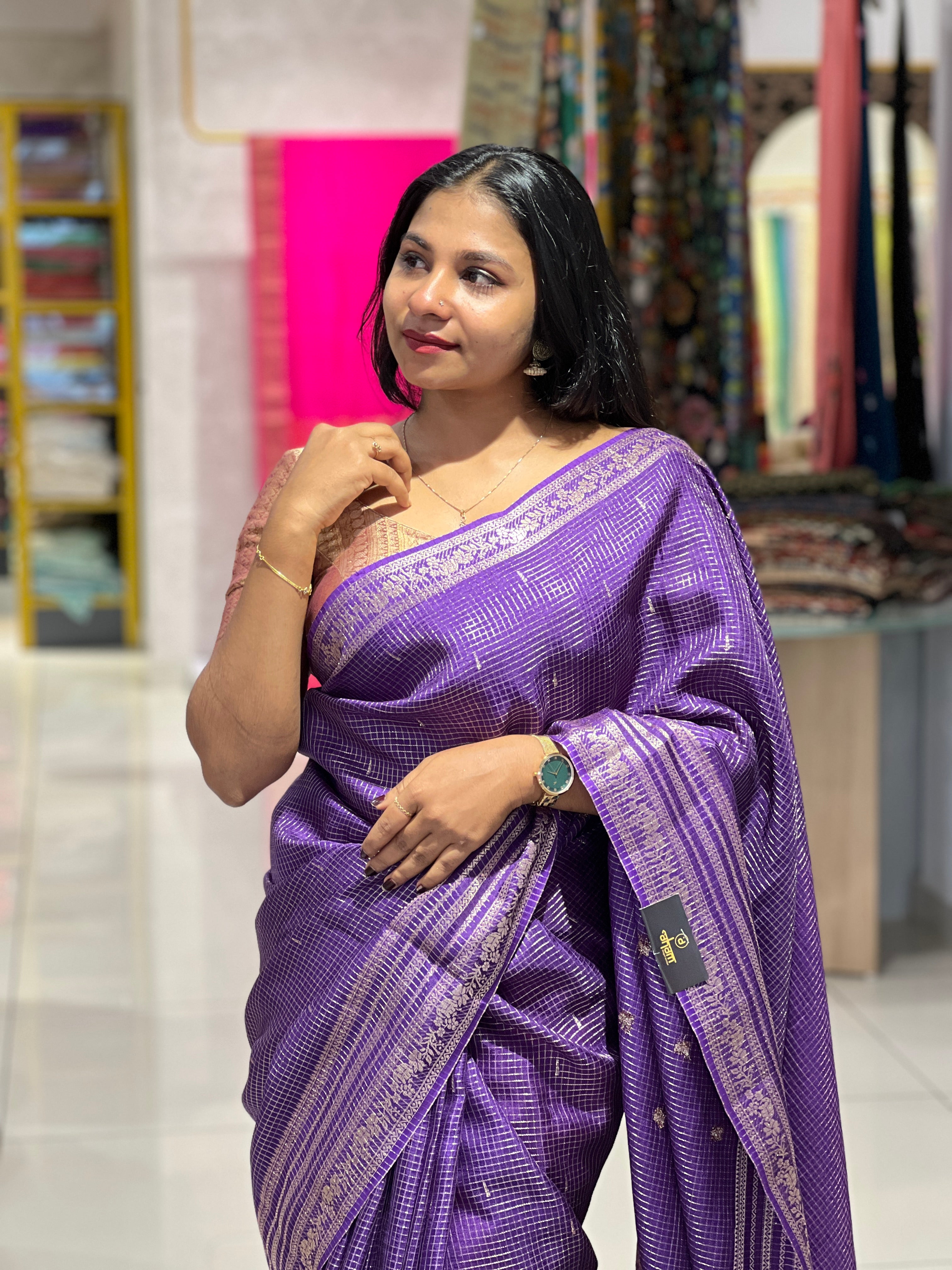 - Style: Check Pattern Zari Weaving ,Banarasi Border Detailing, Pallu Stripes Weaving, Scatterd Stripes Pattern,Tassels Attaching,