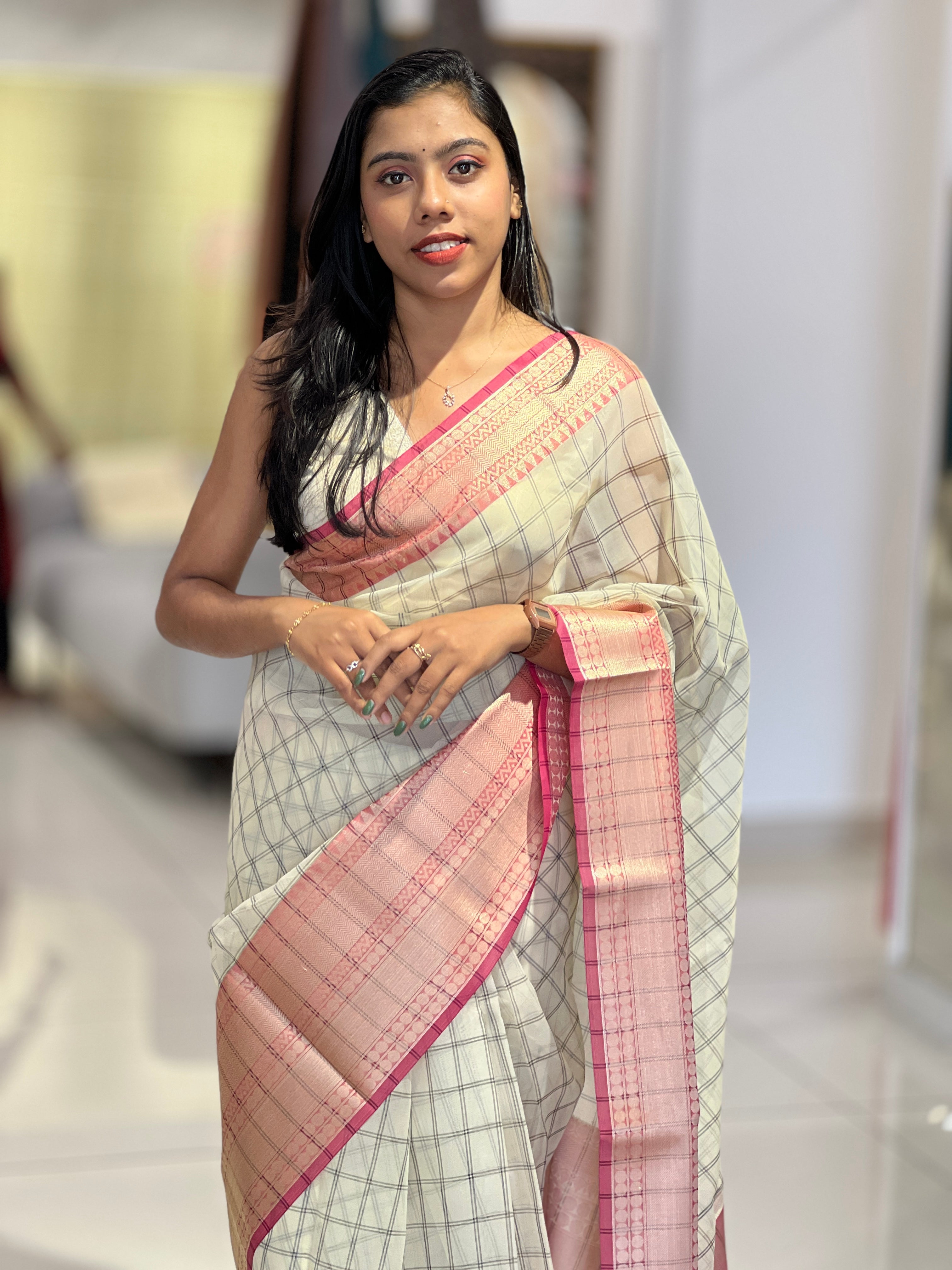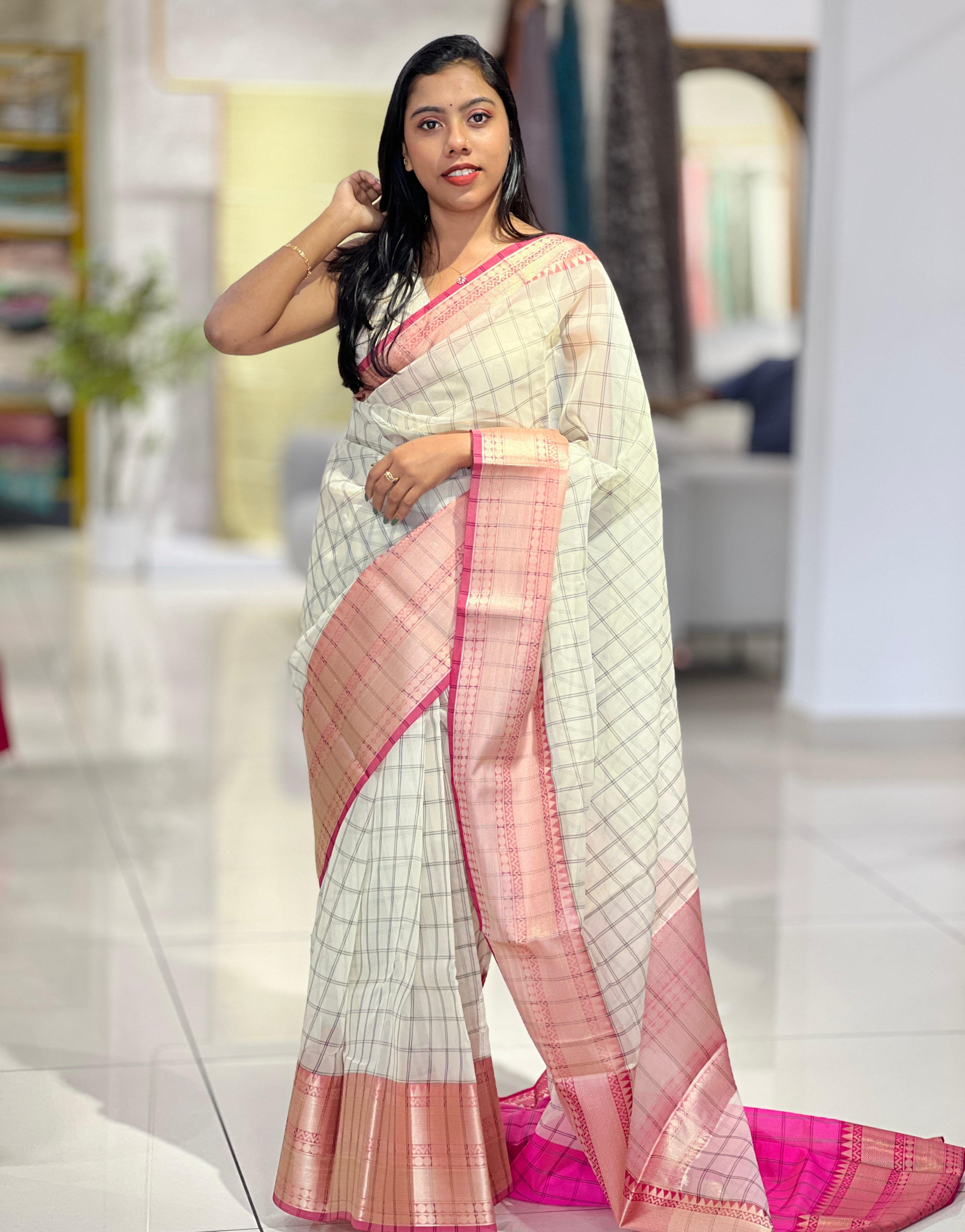 - Style: Check Pattern, Pallu and Border Detailing