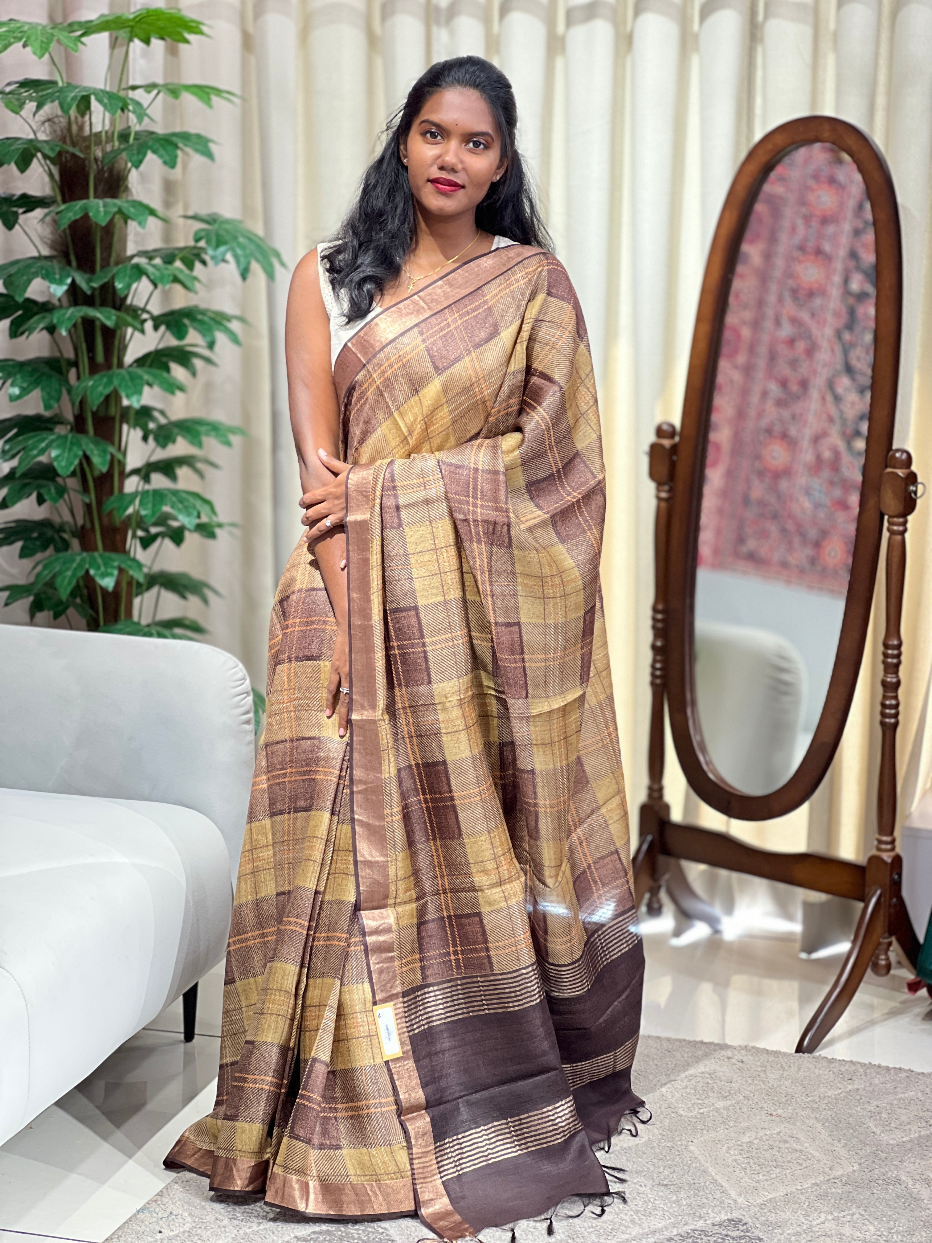 - Style: Check Pattern, Printed, Stripes Detailing On Pallu, Zari Border Detailing