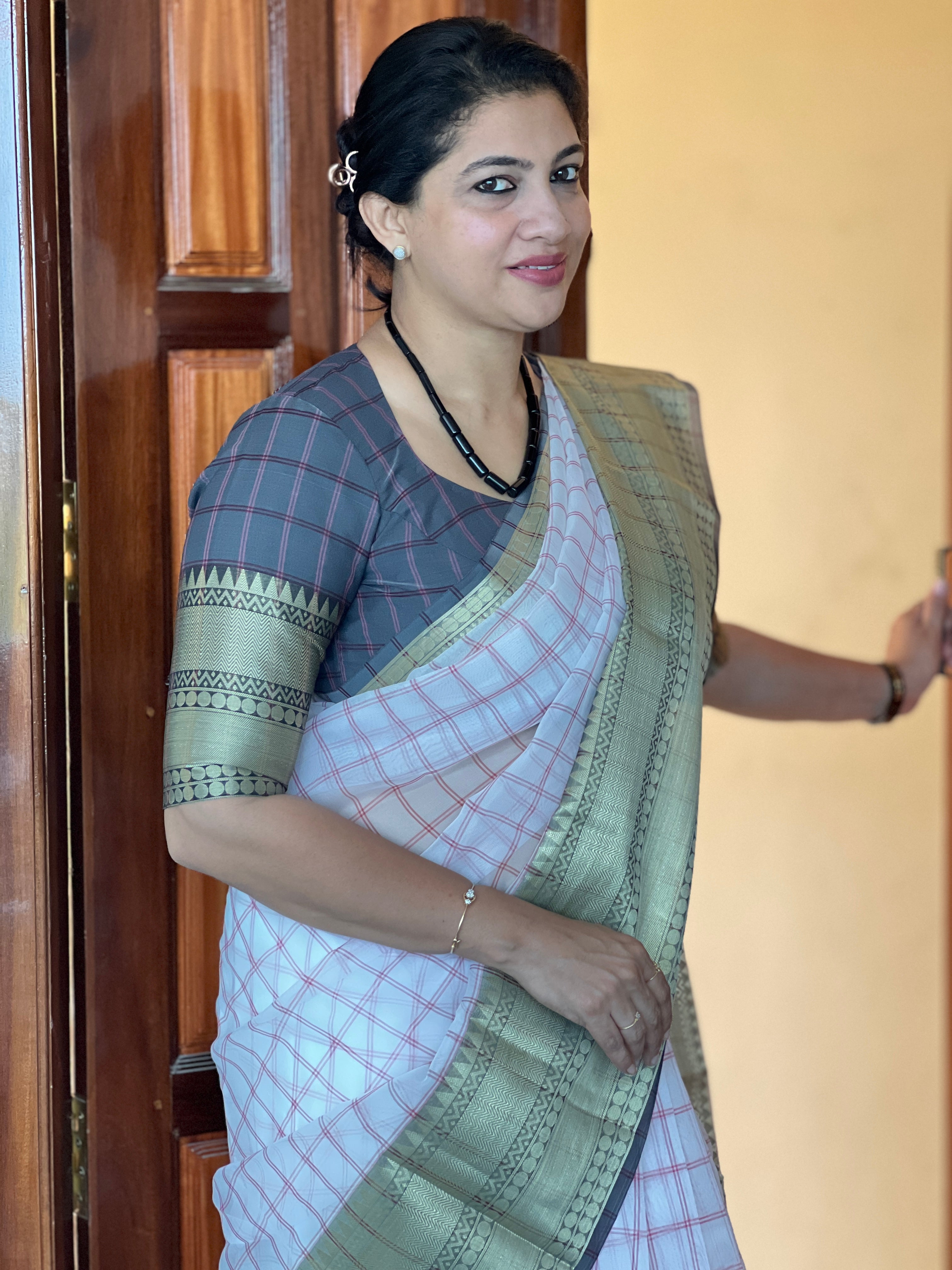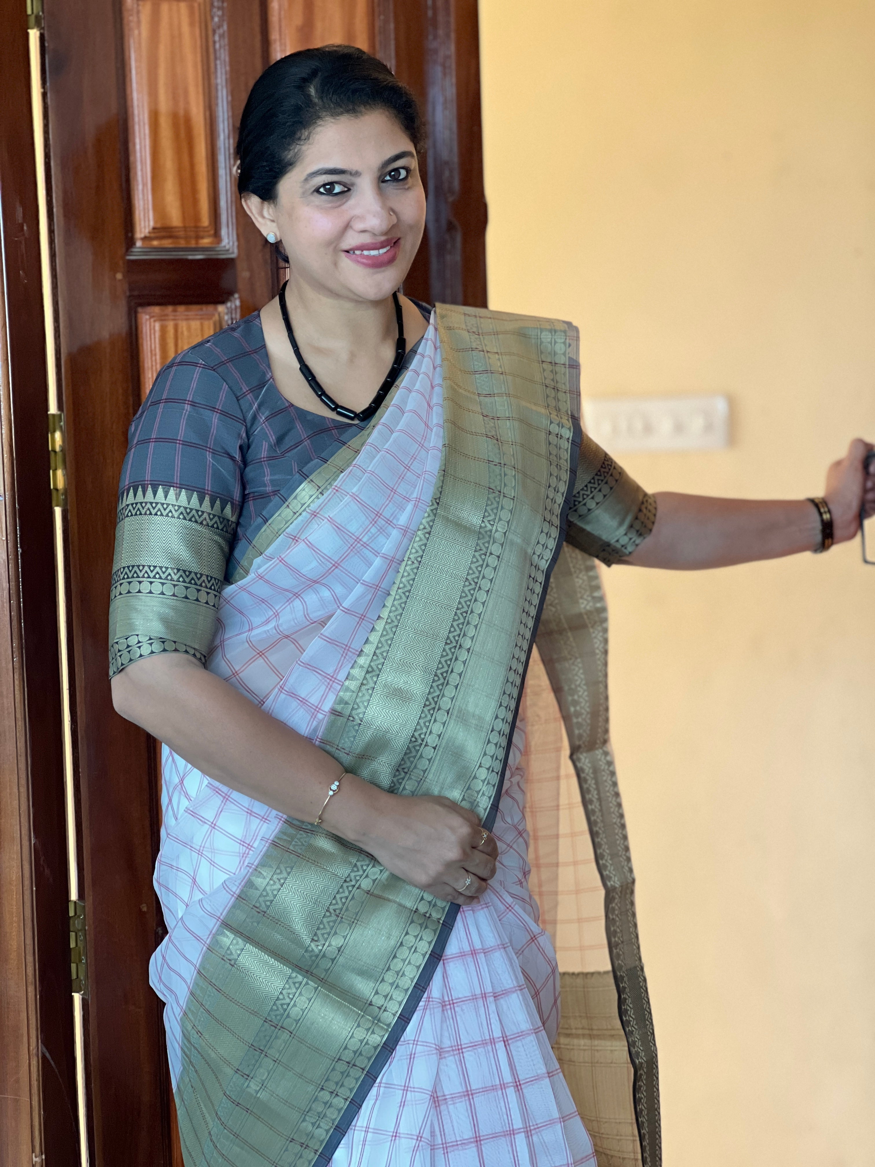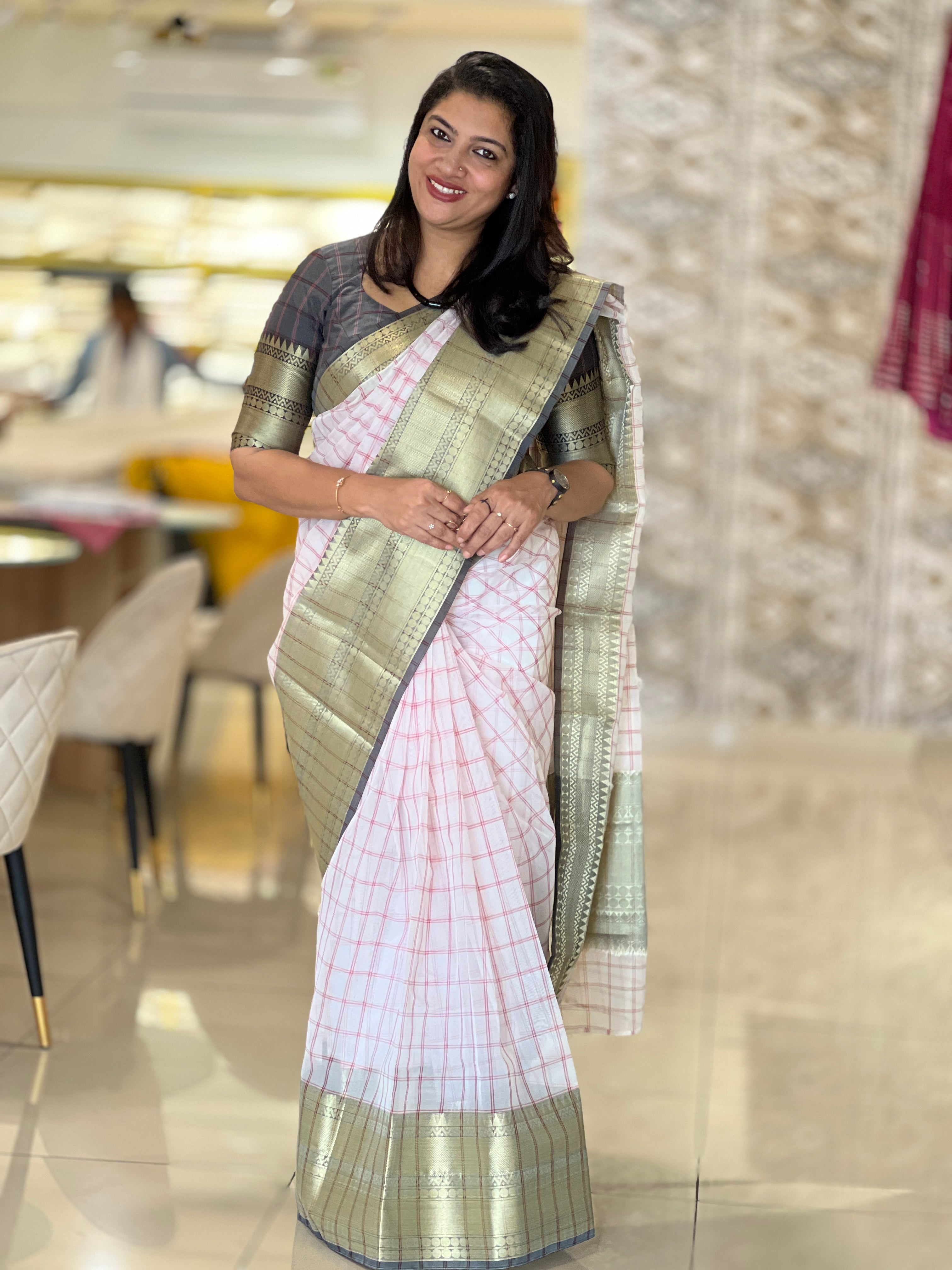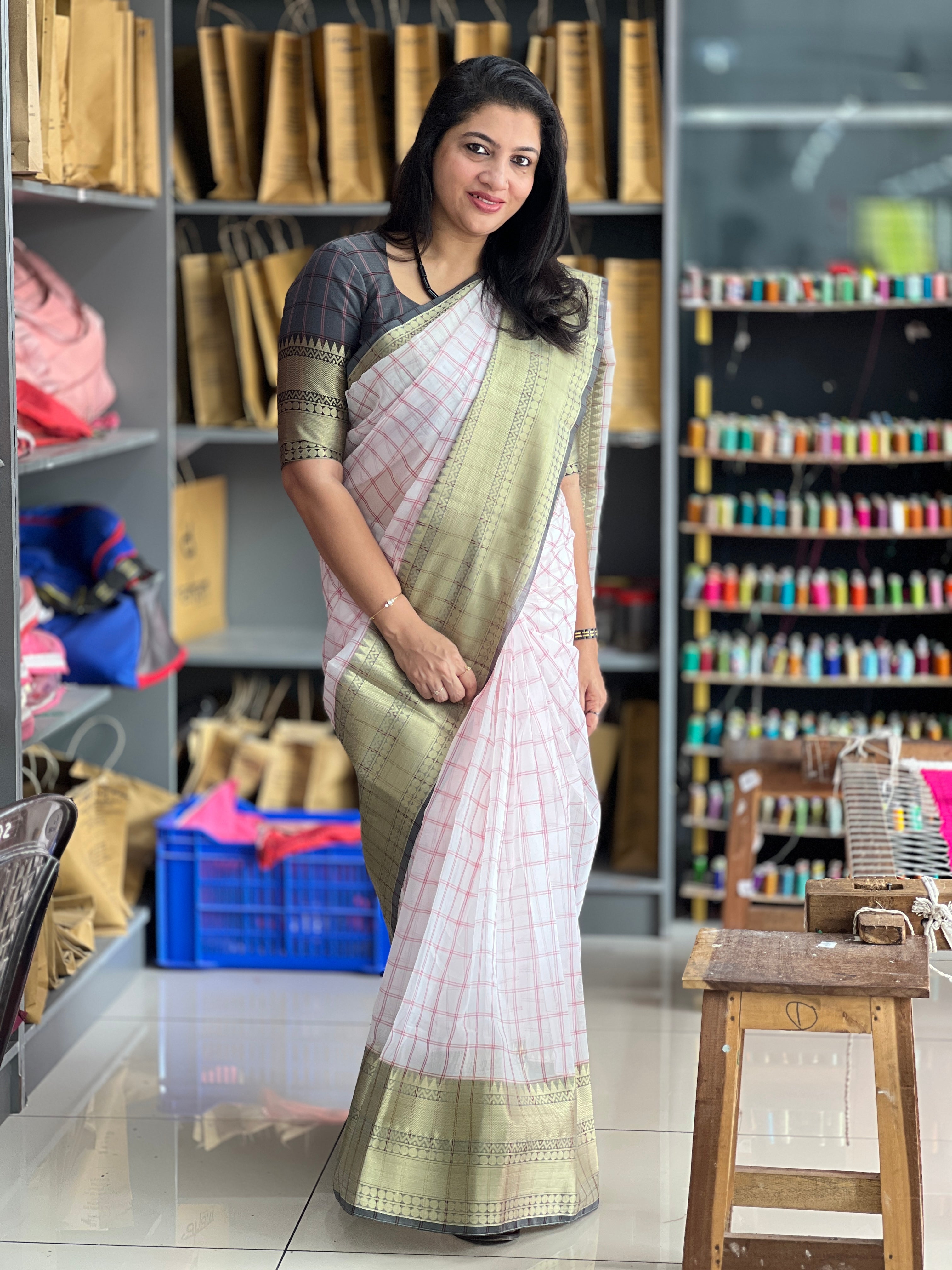 - Style: Check Weaving Pattern, Zari Weaved Broad Borders