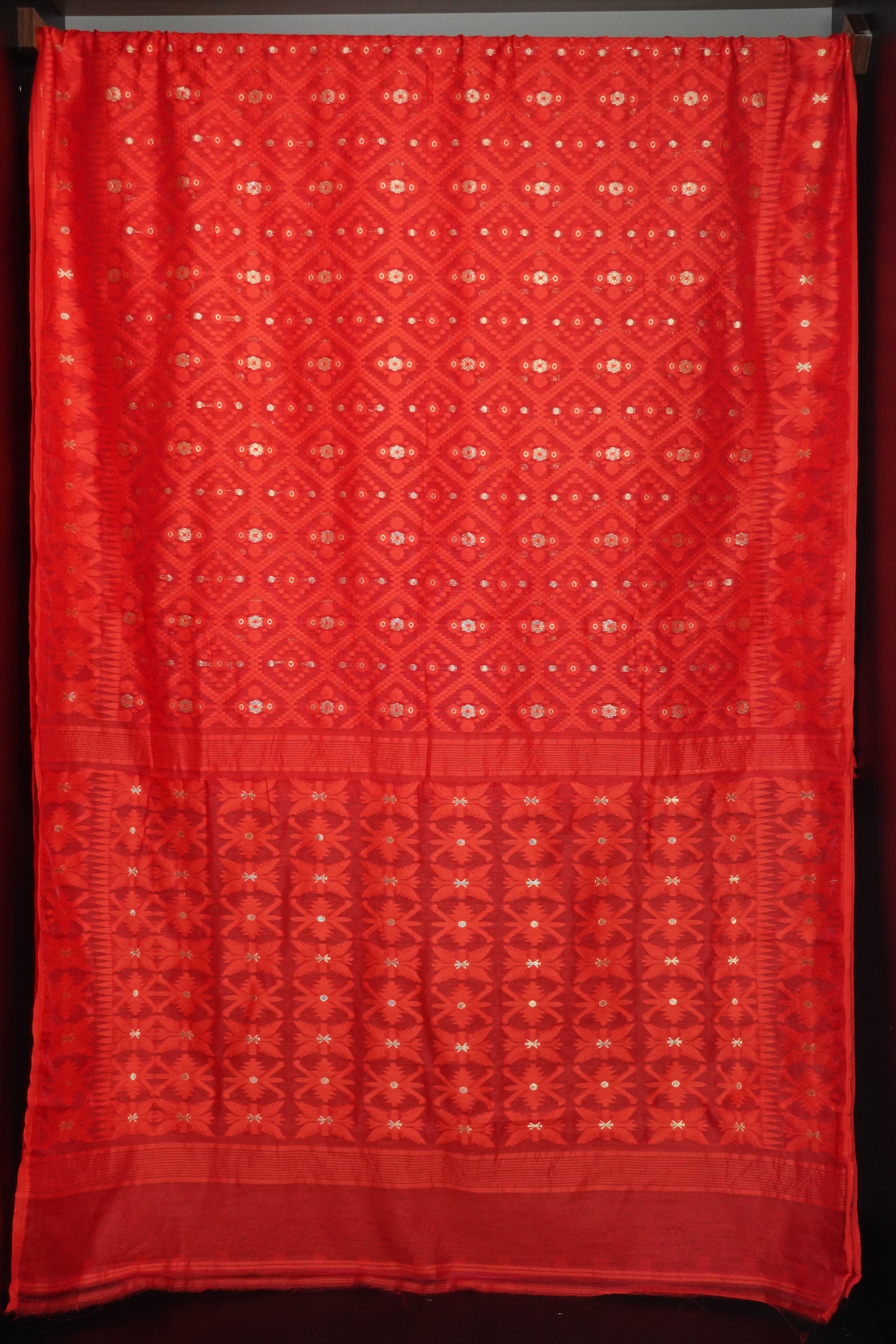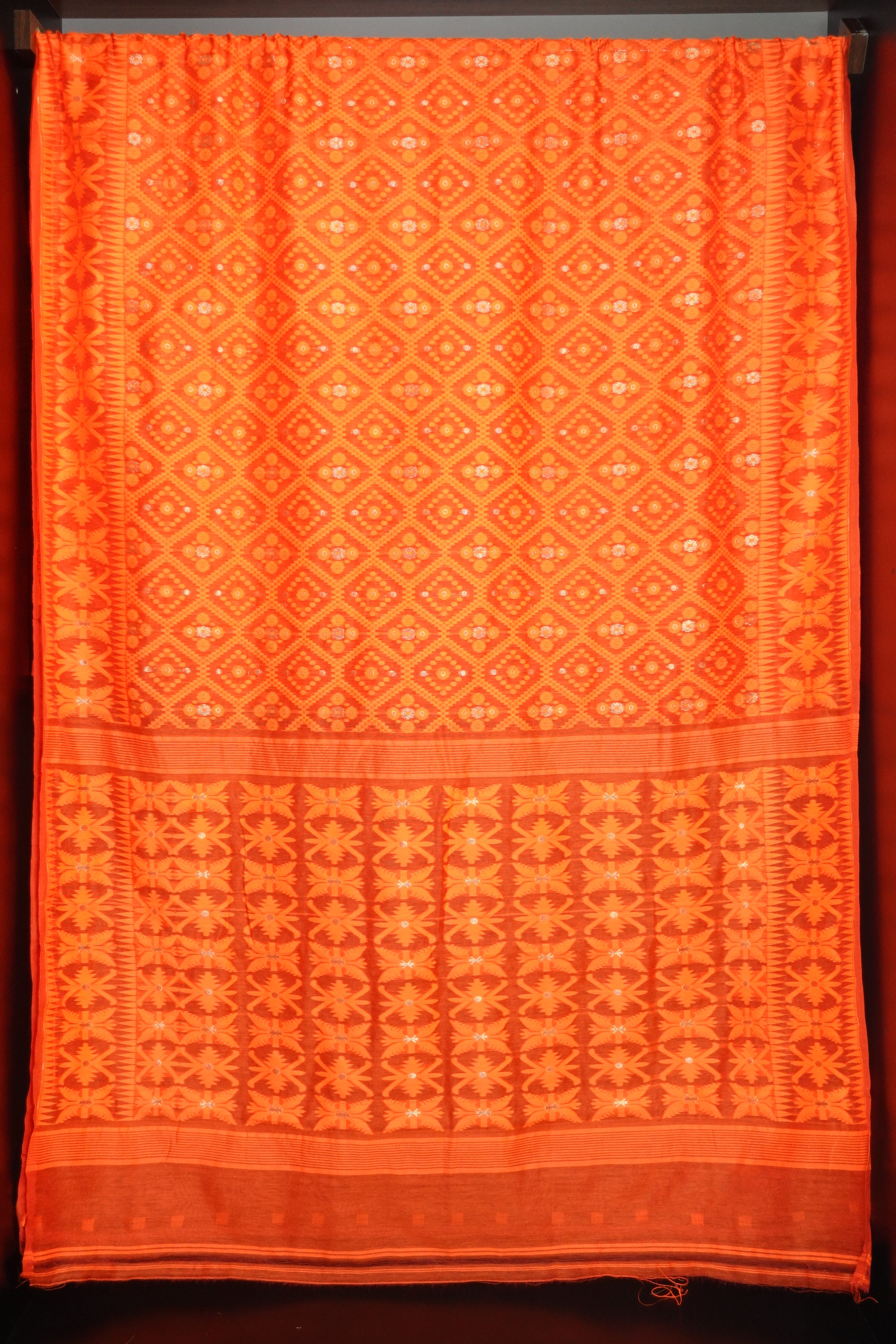 A classy collection of powerloom jamdani sarees with intricate weaving styles & geometrical designs throughout the saree, with zari border at the upper portion. This saree does not have a matching blouse piece.